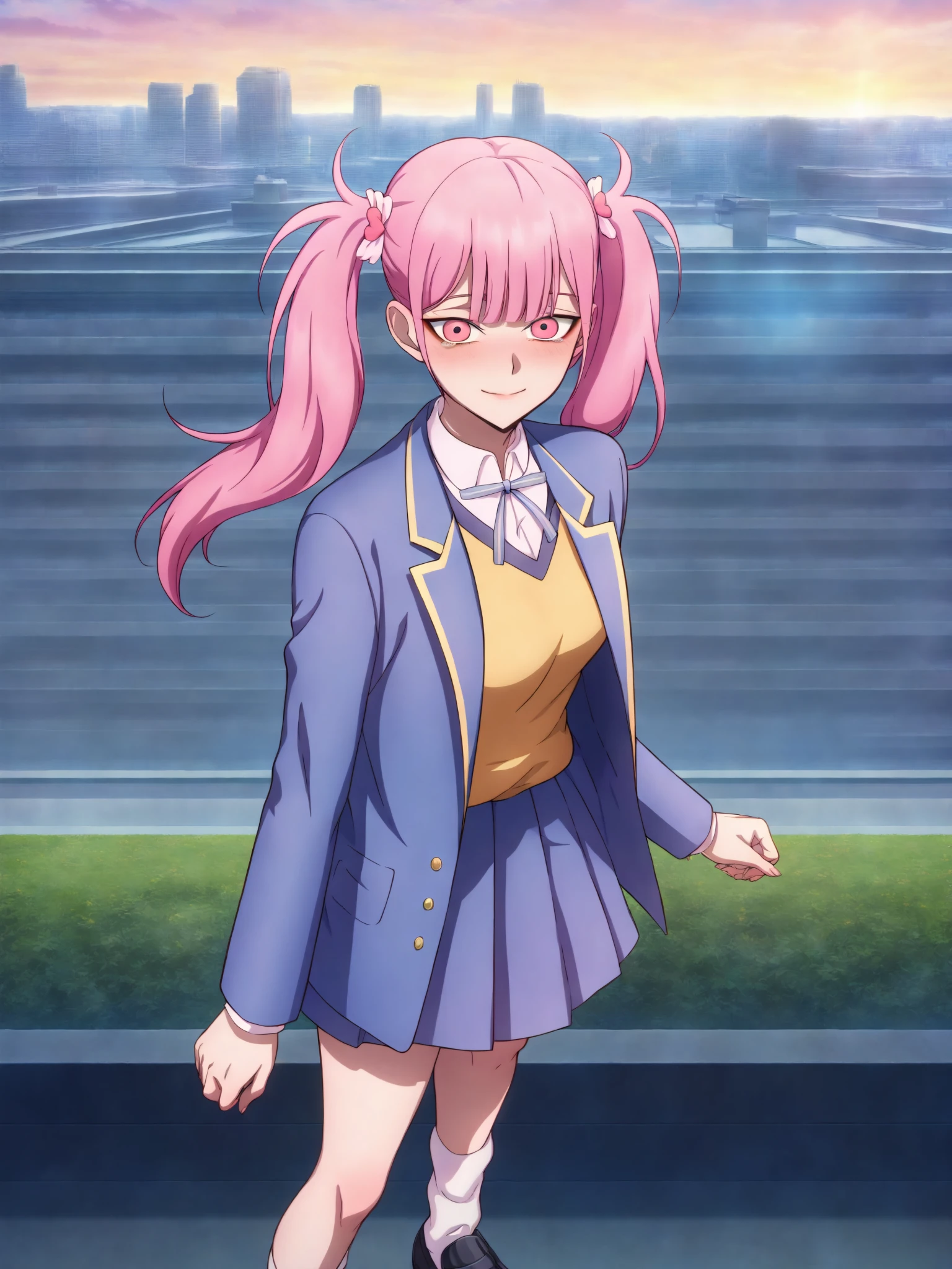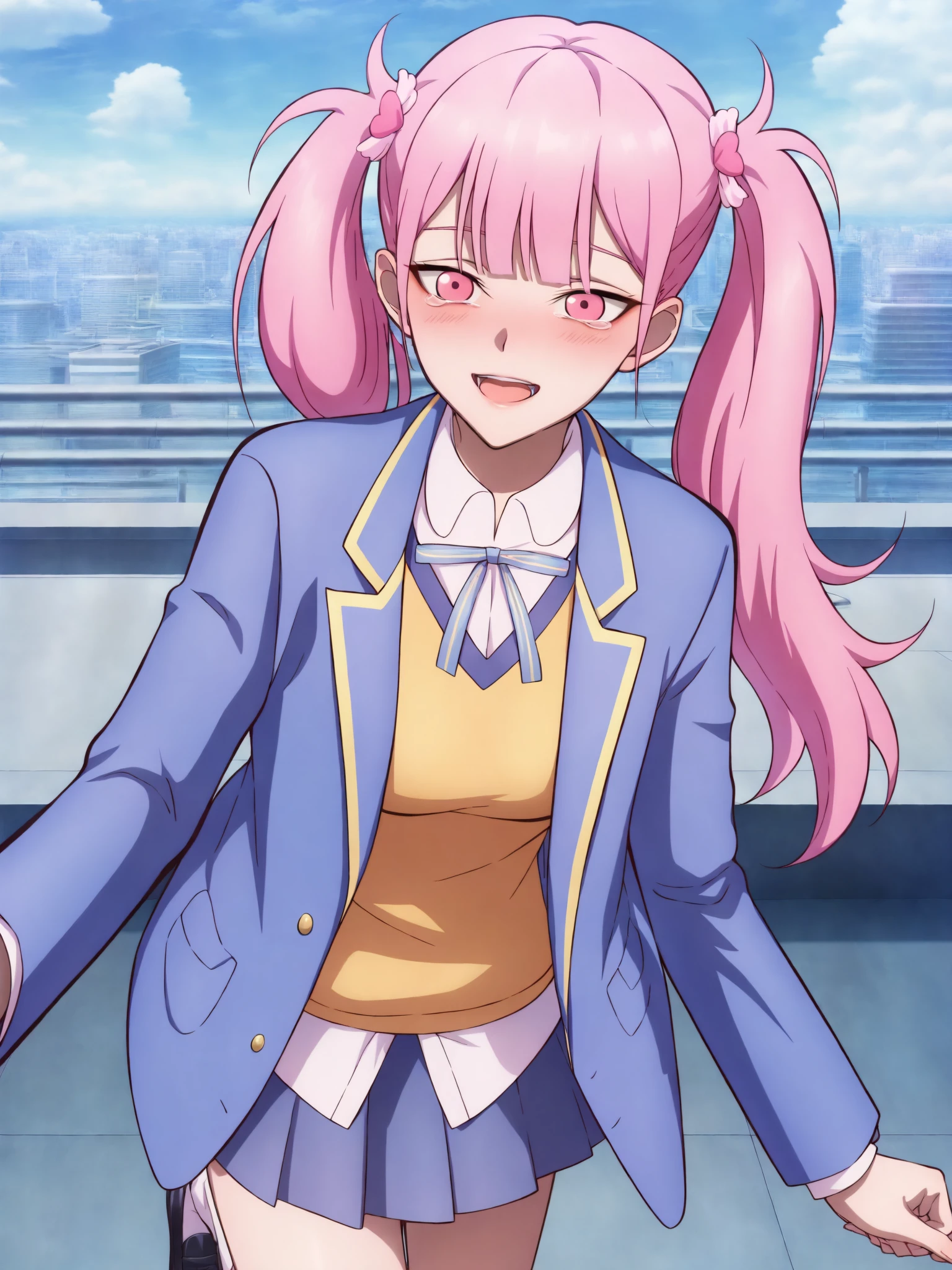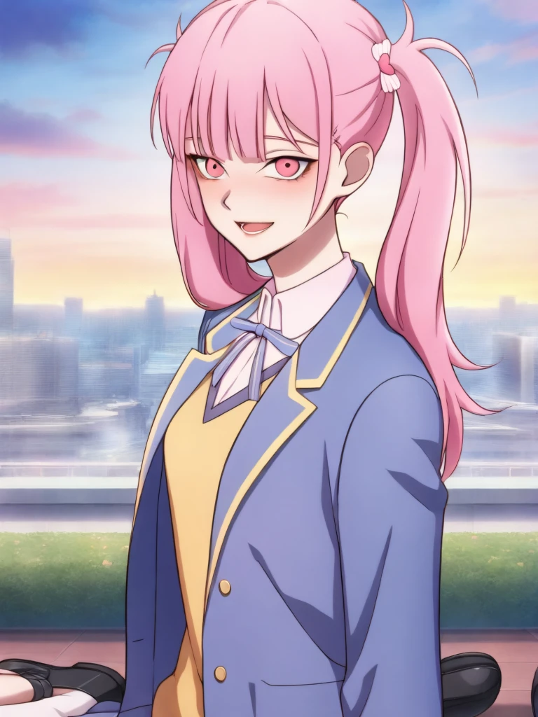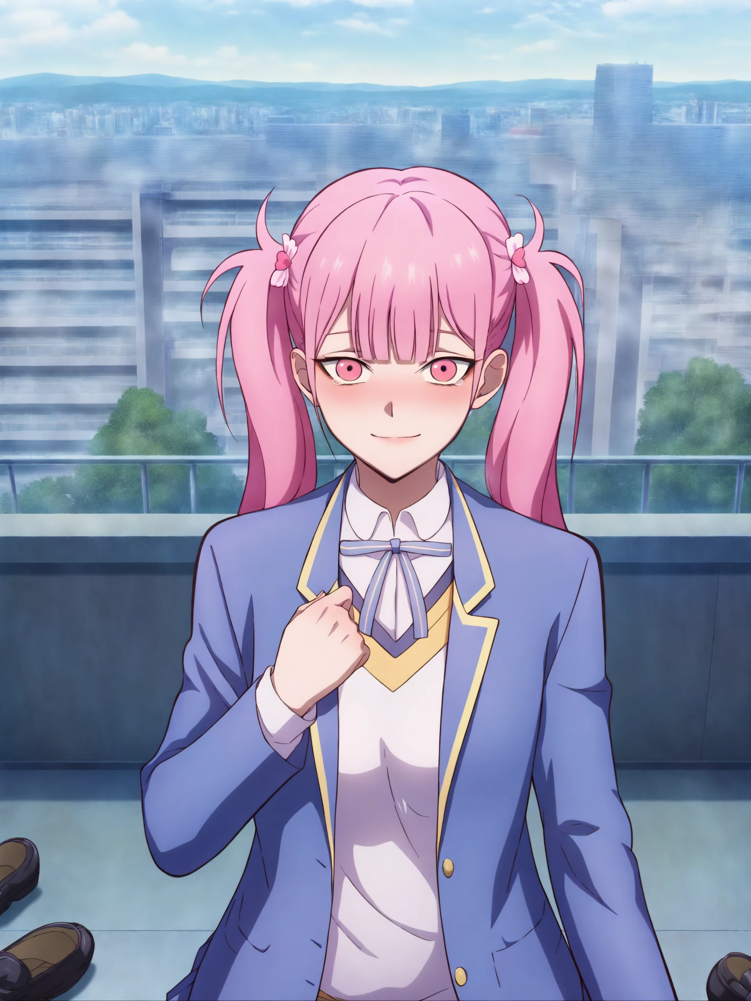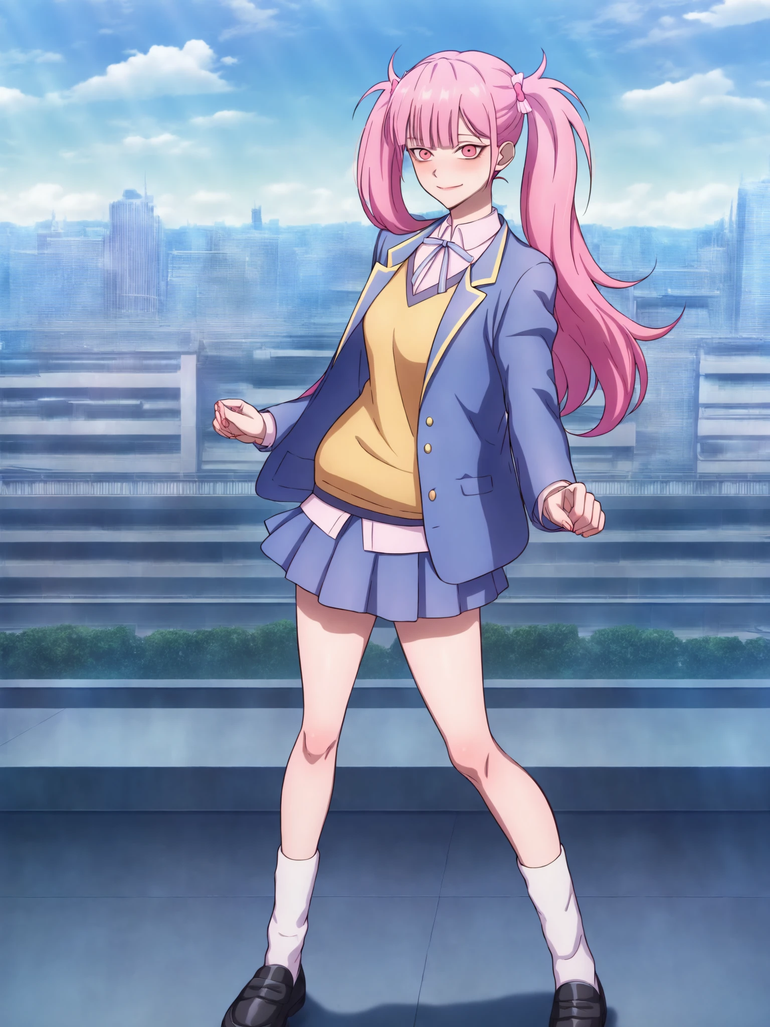 15_Li Tianxi School UniformWoman, long hair, bangs, twintails, pink hair,side ponytail, pink eyes, shirt, ribbon, holding, twintails, medium breast, light skin, 1girl, school uniform, blue jacket, white shirt, collared shirt, neck ribbon, school uniform, jacket, long sleeves, miniskirt, pleated skirt, black shoes, white socks
