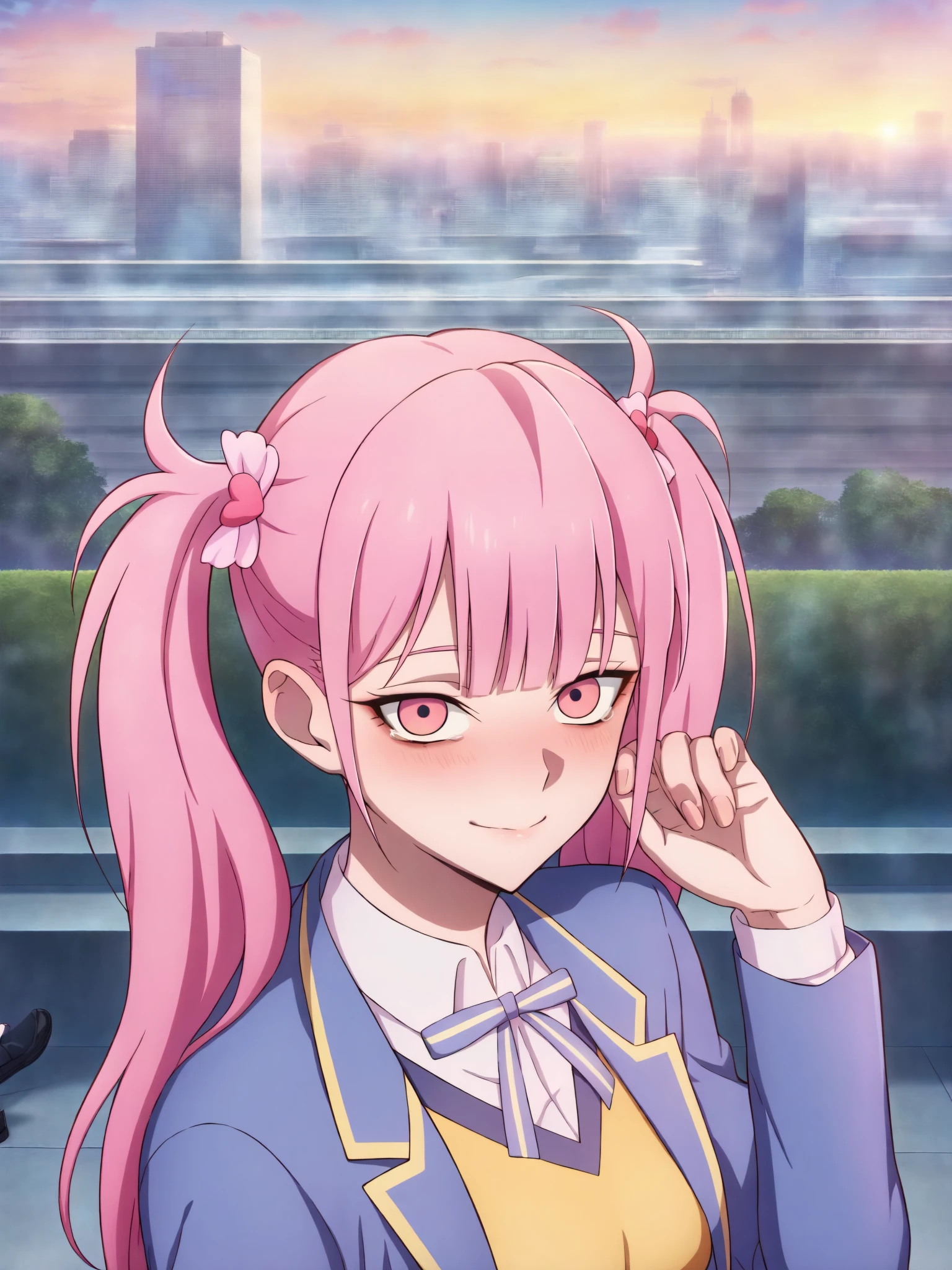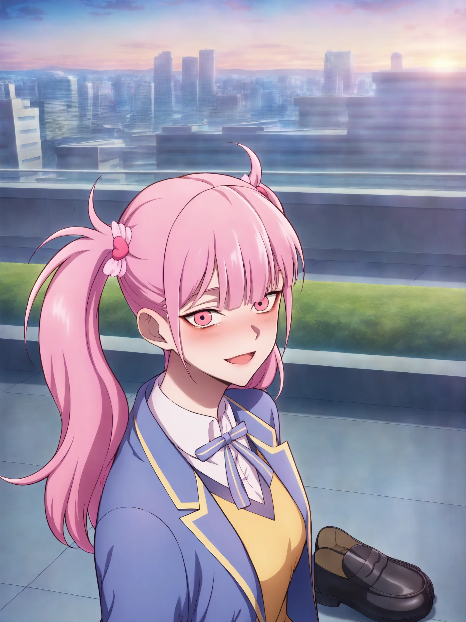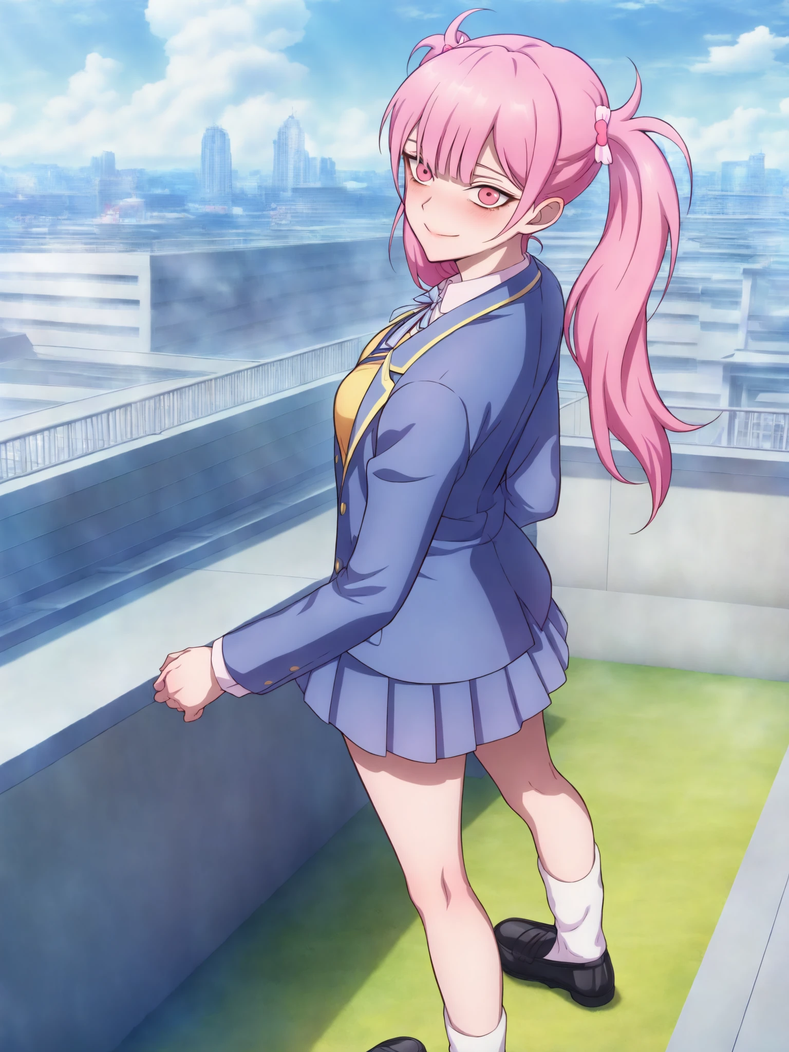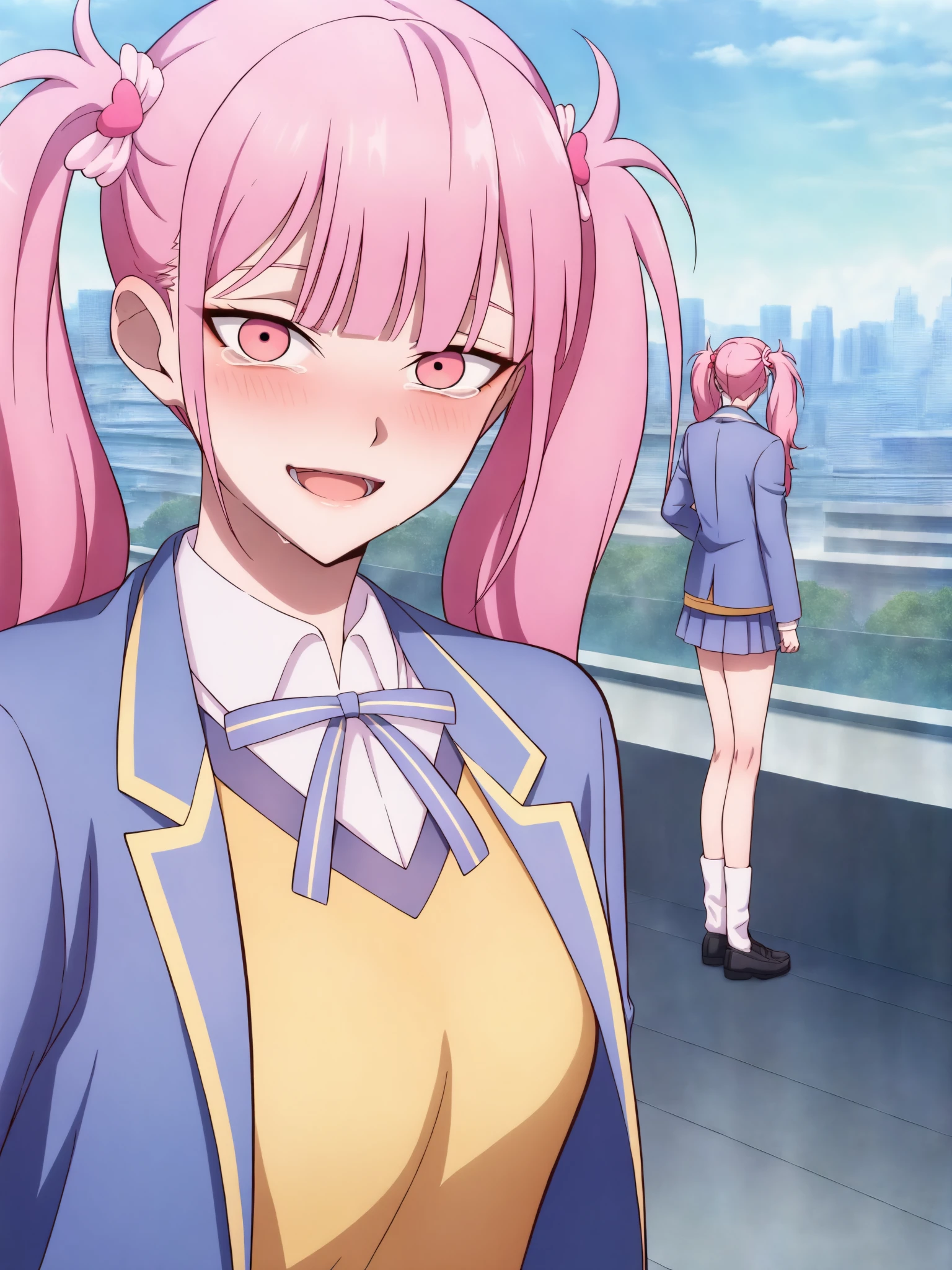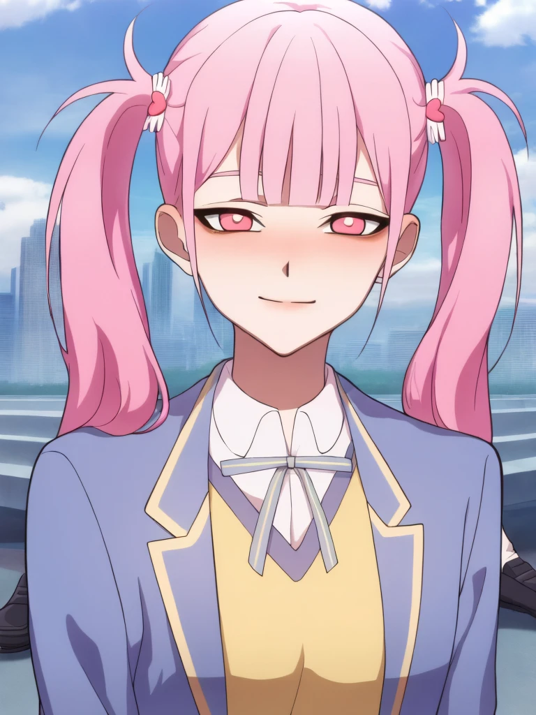 15_Li Tianxi School UniformWoman, long hair, bangs, twintails, pink hair,side ponytail, pink eyes, shirt, ribbon, holding, twintails, medium breast, light skin, 1girl, school uniform, blue jacket, white shirt, collared shirt, neck ribbon, school uniform, jacket, long sleeves, miniskirt, pleated skirt, black shoes, white socks