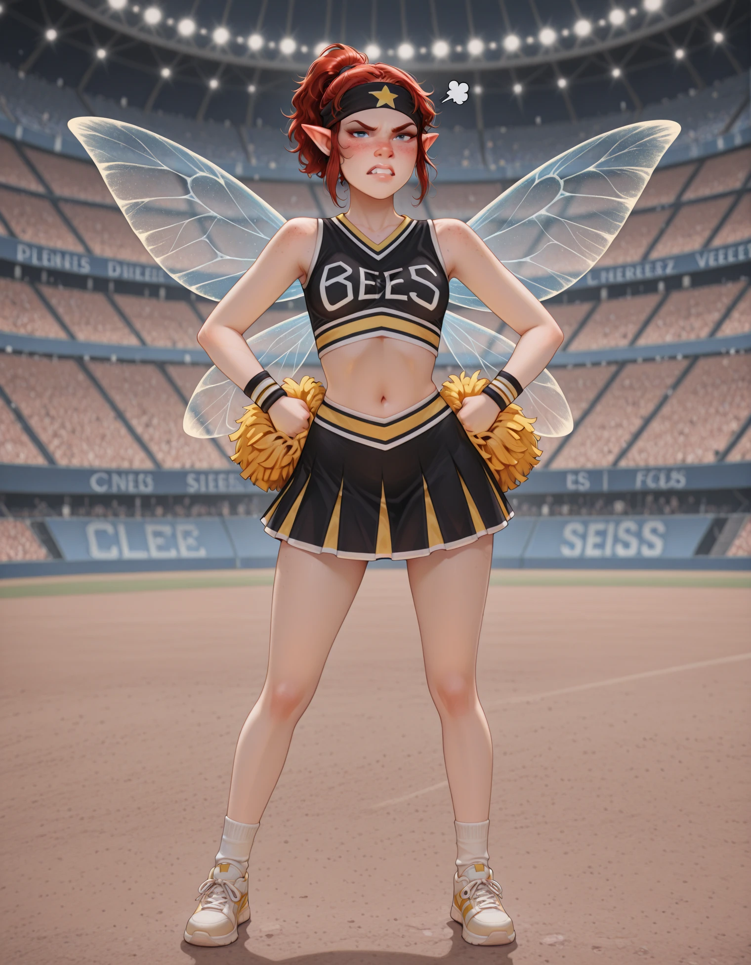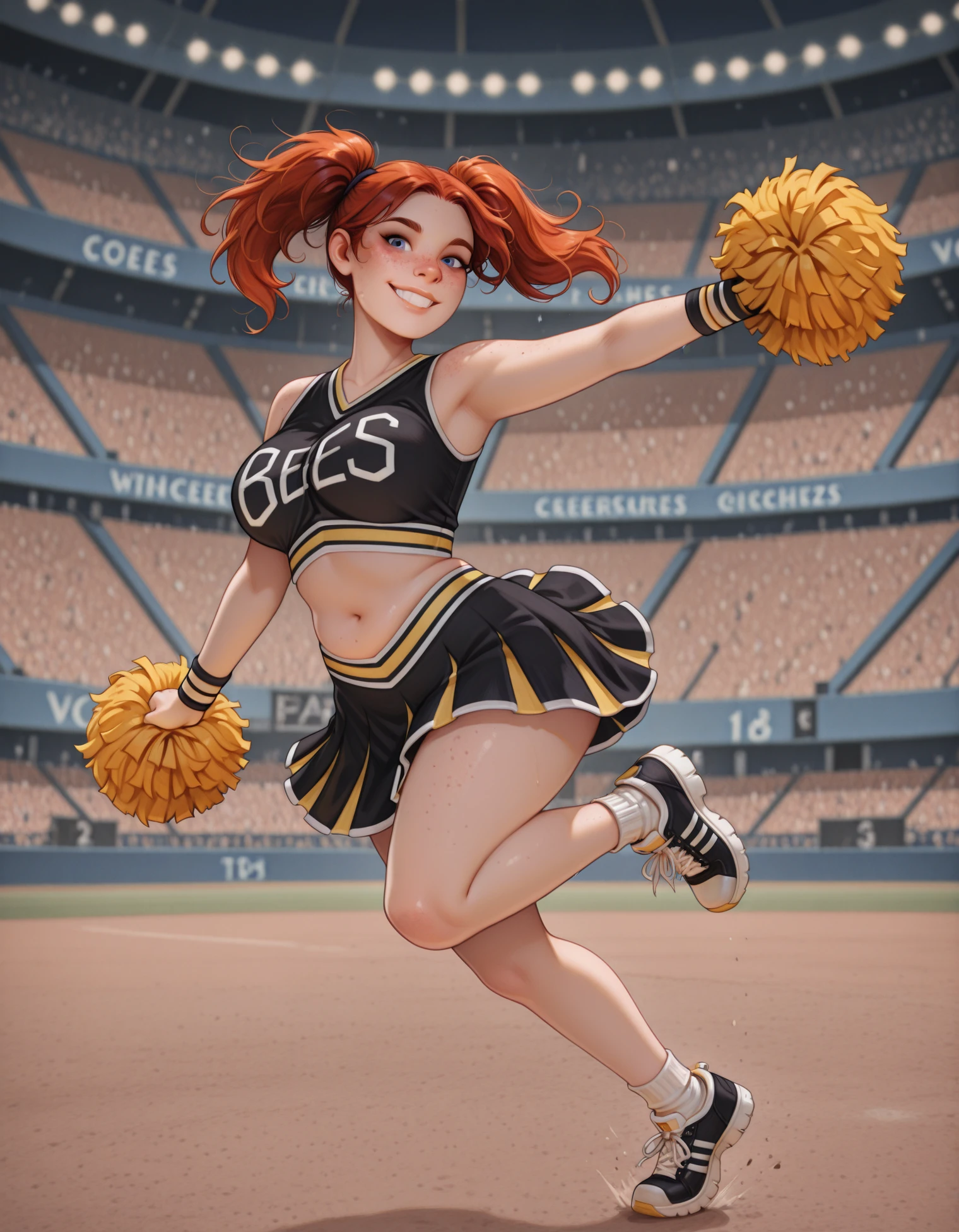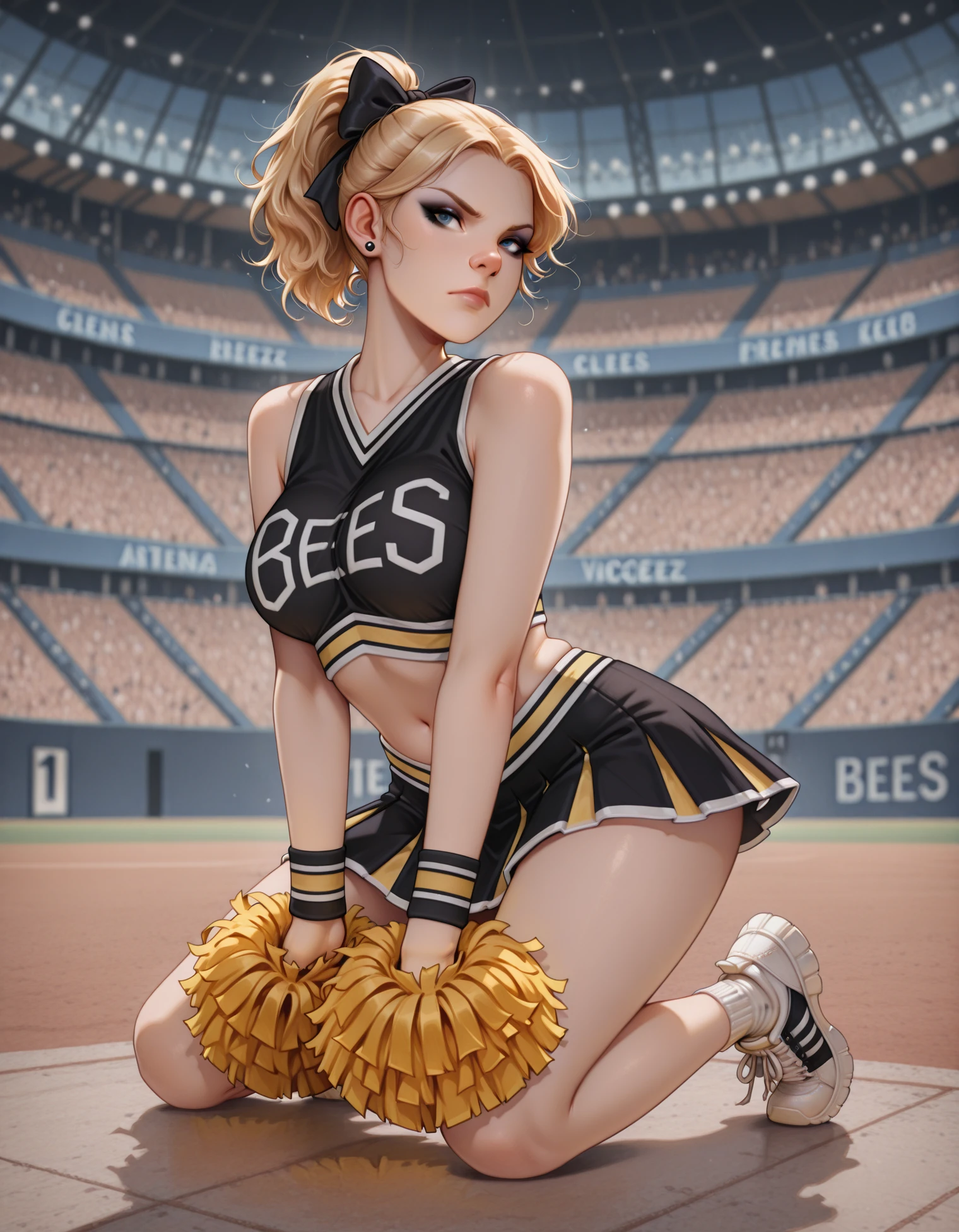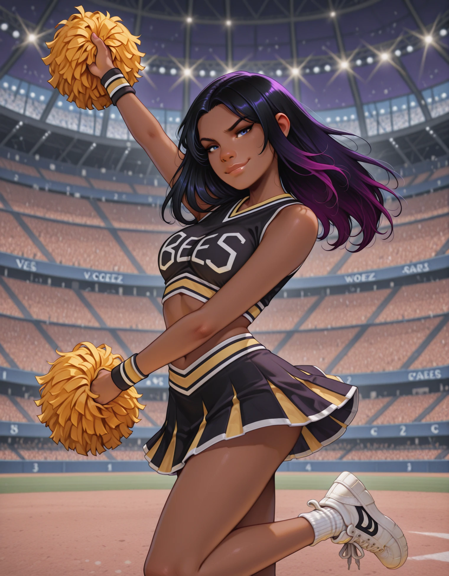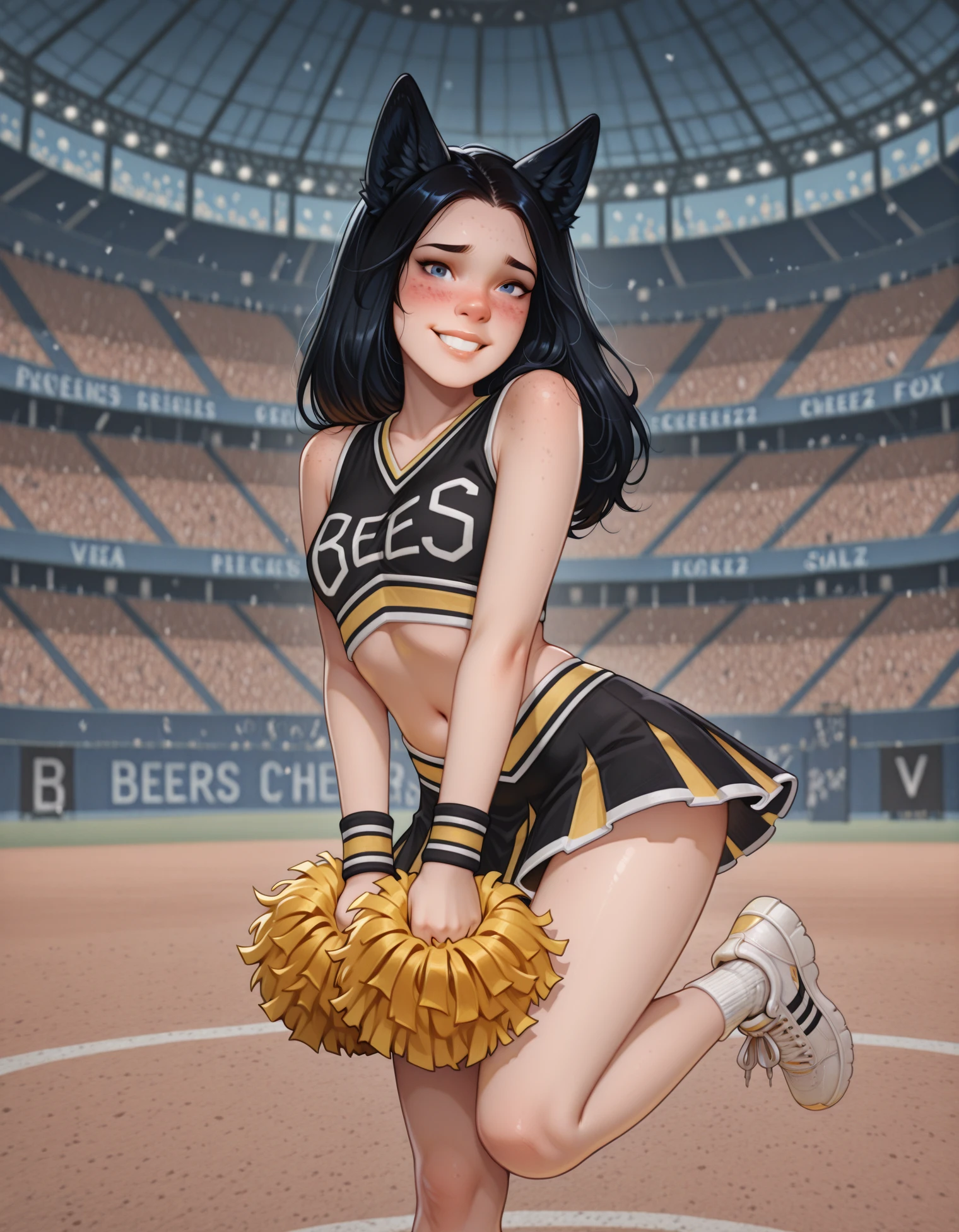 Helpful Words: cheerleader, black crop top, skirt, holding pom poms, white socks, sneakers, wristband