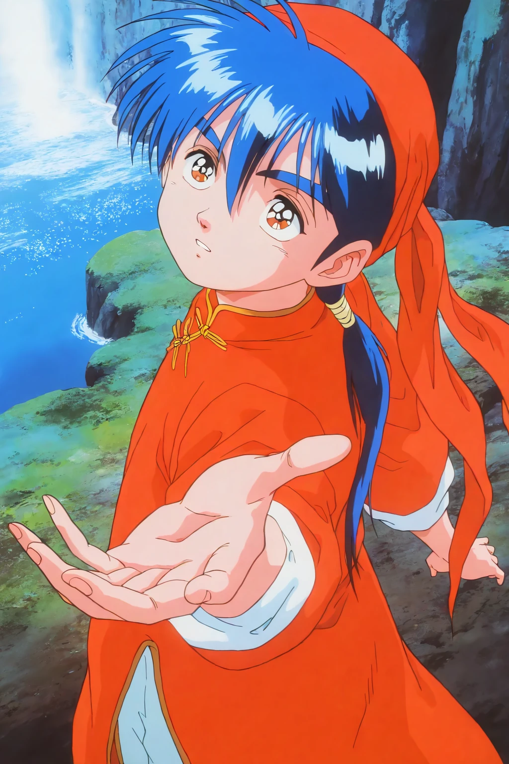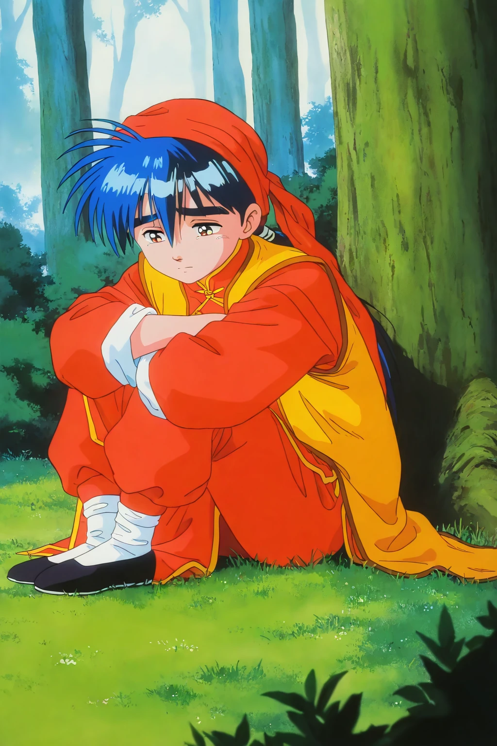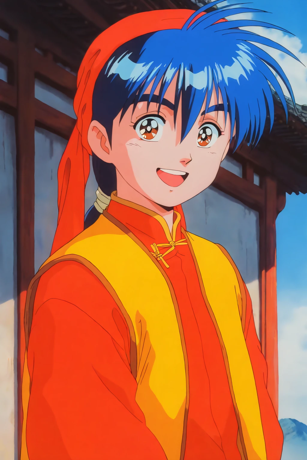 liumaoxing,1990s \(style\),1boy, red headscarf,blue hair, brown eyes, spike hair,chinese clothes, hair between eyes, backpack, bag, male focus, open mouth, outdoors,red pants, black shoes, solo,white socks,