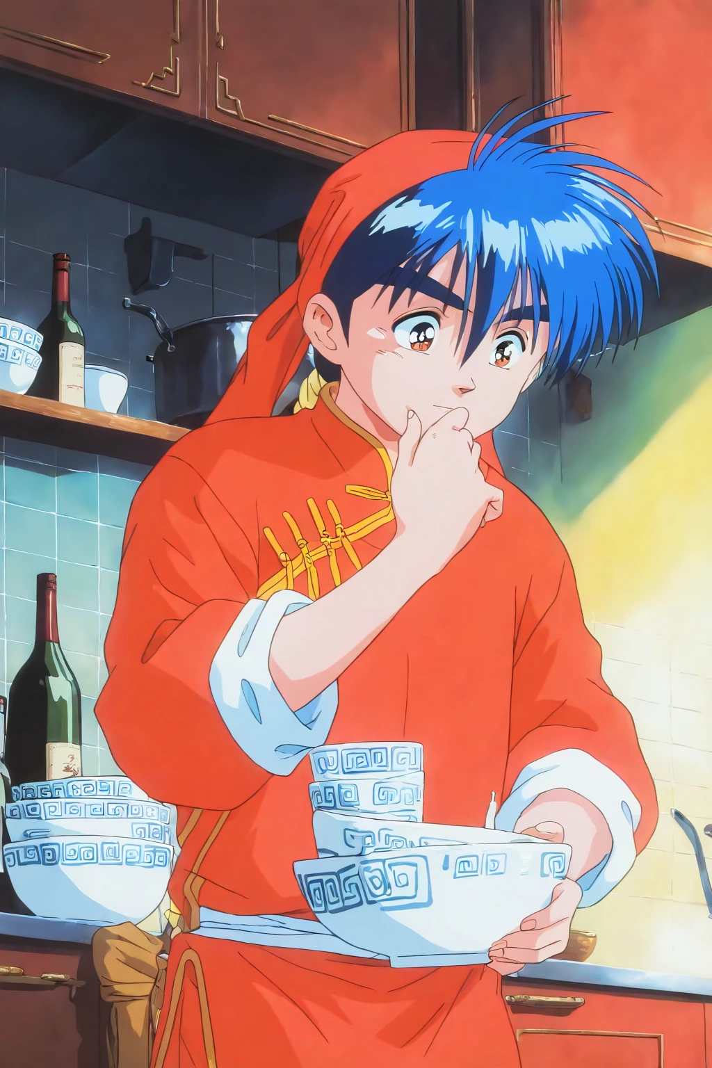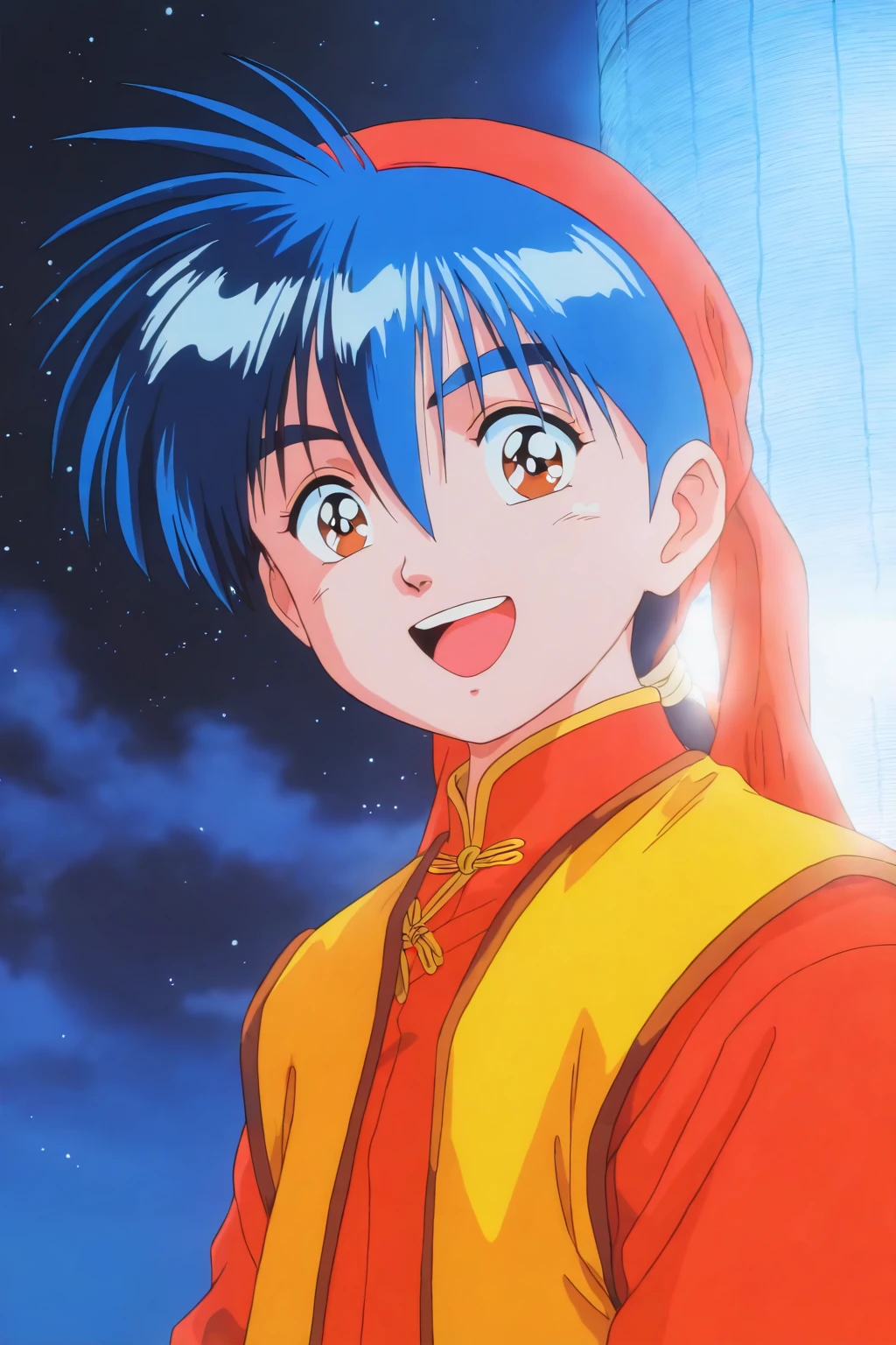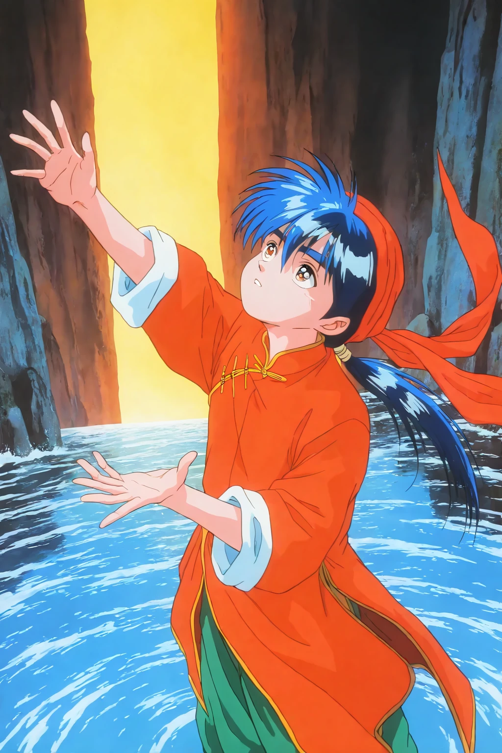 liumaoxing,1990s \(style\),1boy, red headscarf,blue hair, brown eyes, spike hair,chinese clothes, hair between eyes, backpack, bag, male focus, open mouth, outdoors,red pants, black shoes, solo,white socks,