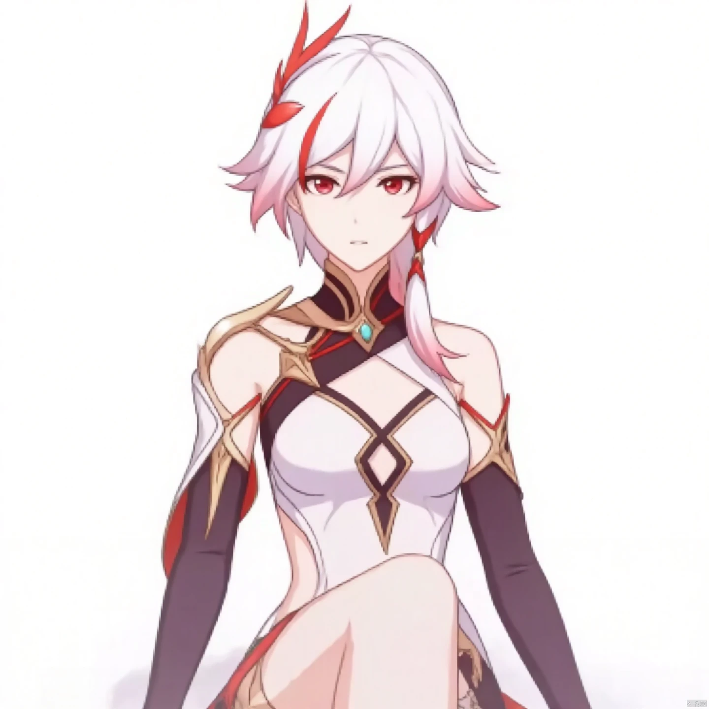 fu hua, fu hua cgver, long hair, bangs, hair ornament, red eyes, hair between eyes, white hair, multicolored hair, streaked hair, smile, small breasts, red hair, pink hair,low-tied long hair,
