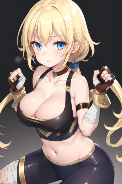 GinaAigis, 1girl, solo, blue eyes, blonde hair, very long hair, large breasts, bike shorts, cleavage, navel, fingerless gloves, low ponytail, bare shoulders, clenched hands, bandages, midriff, collarbone, gauntlets