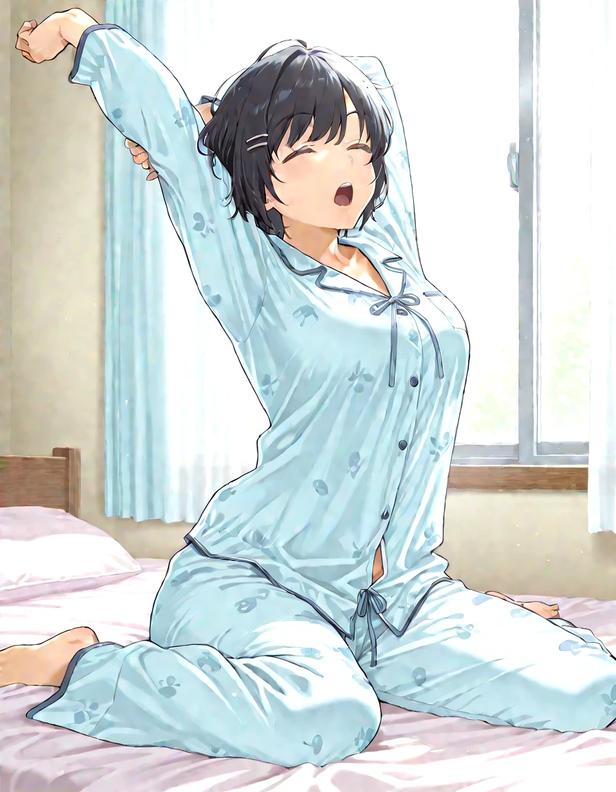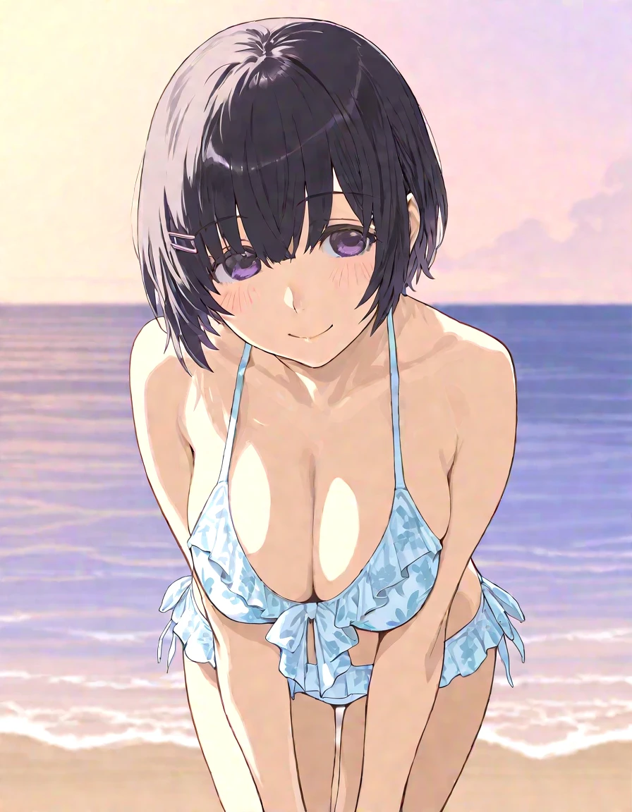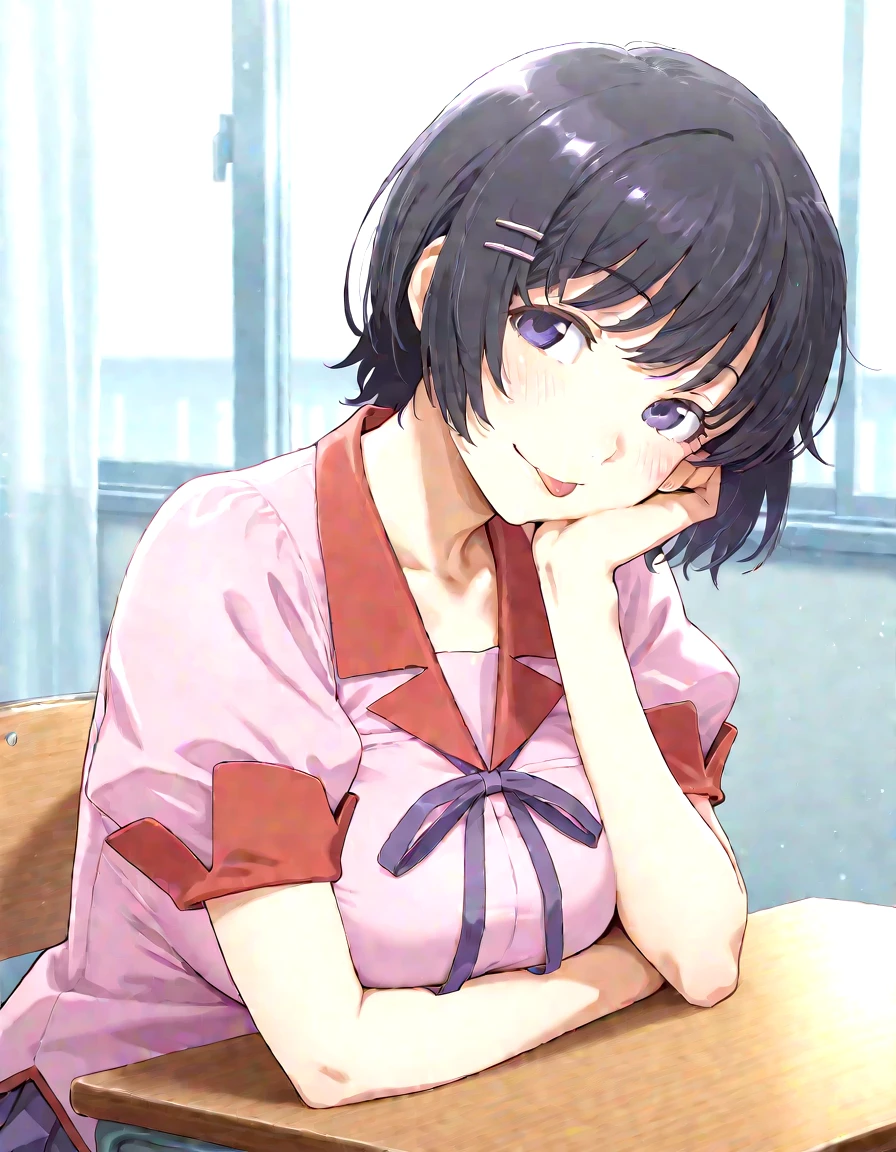 1girl,tsubasashort,purple eyes,short hair,black hair,hairclip
