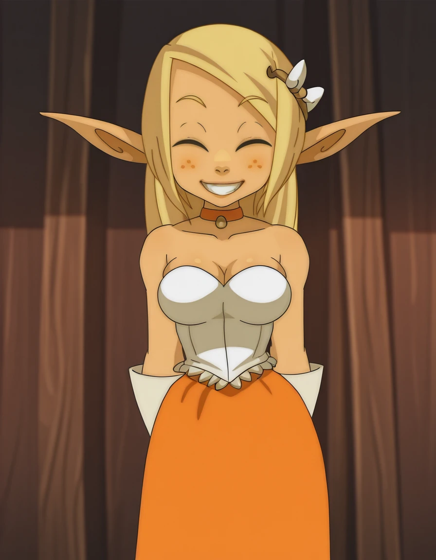 Eva, 1girl, freckles, pointy ears, elf, solo, blonde hair, long hair, green eyes, white gloves, choker, orange dress, hair ornament, platform footwear, bare shoulders, cleavage, hairclip, bow,jewelry
