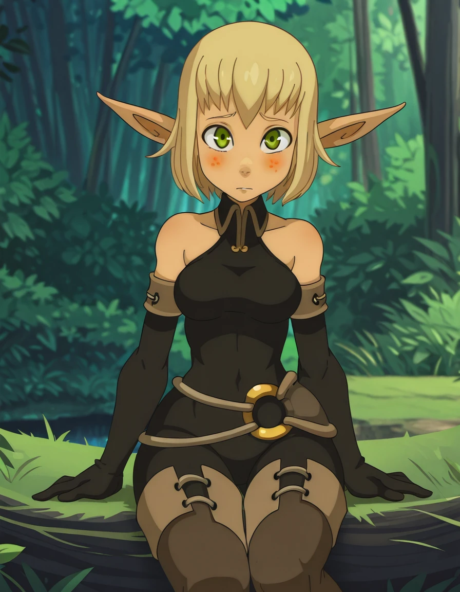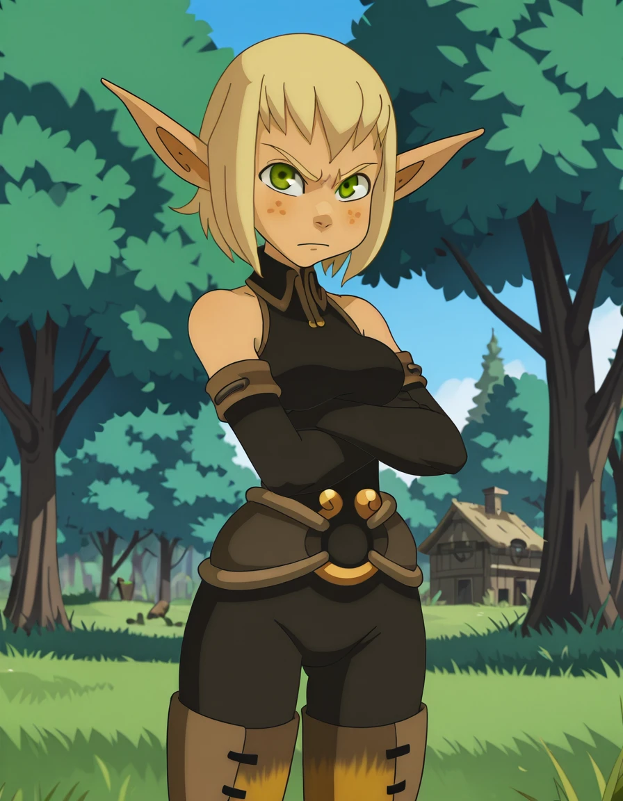 Eva, freckles, 1girl, thigh boots, pointy ears, green eyes, solo, elf, blonde hair, short hair, gloves, bare shoulders, bodysuit, elbow gloves