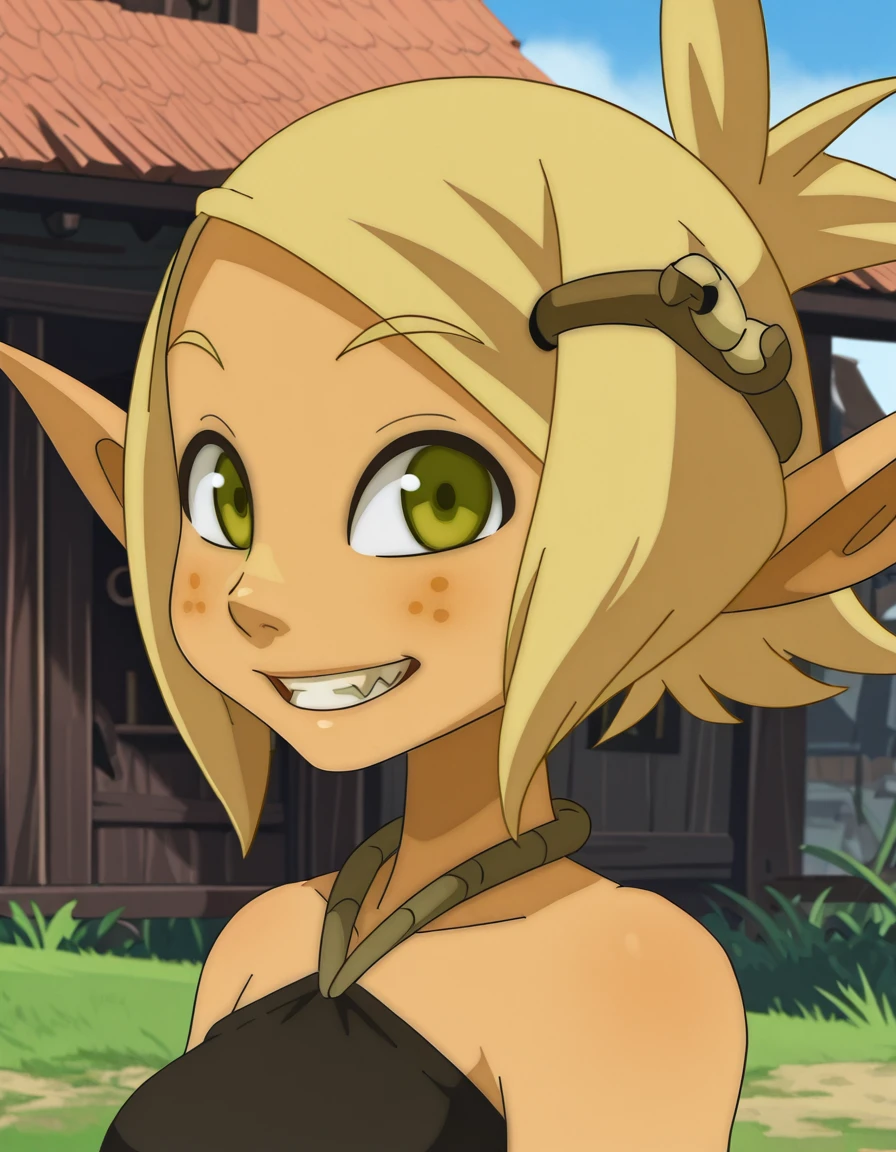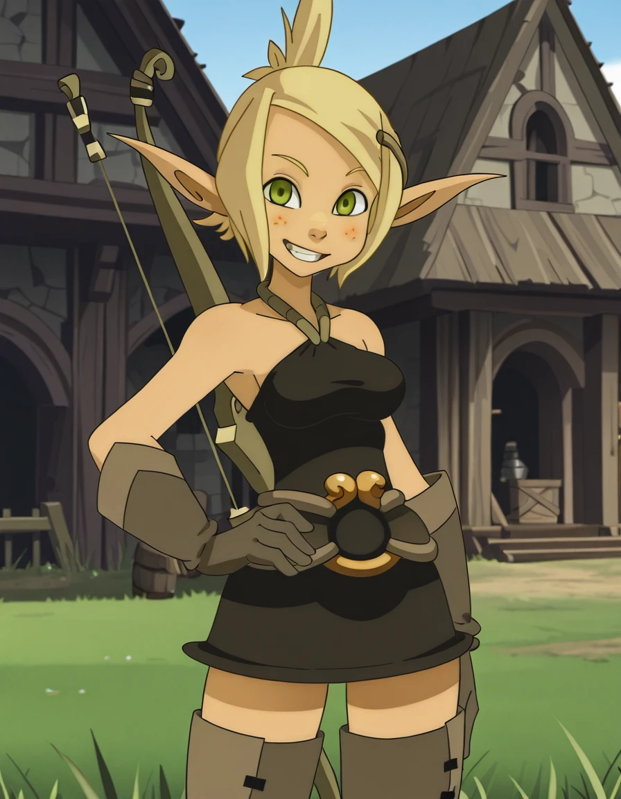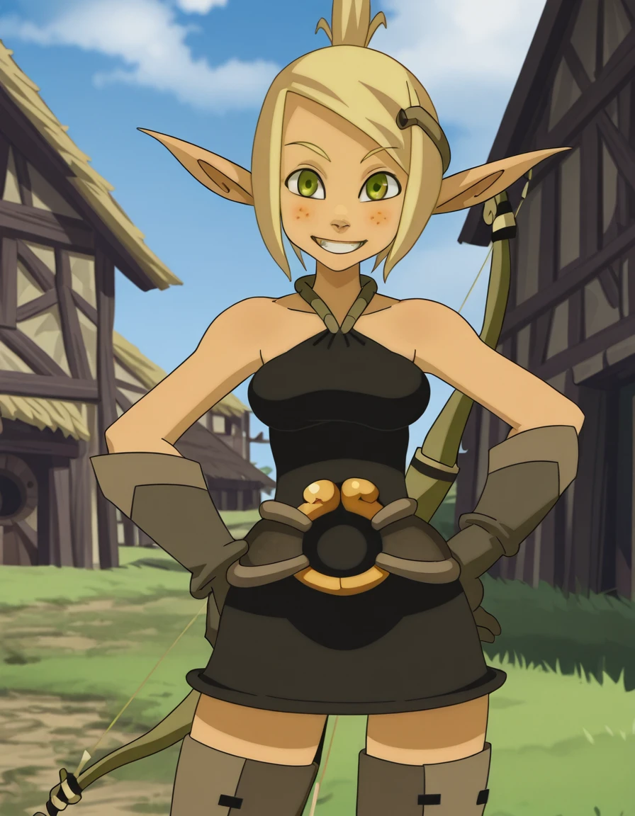 Eva, 1girl, freckles, blonde hair, solo, pointy ears, gloves, green eyes, bare shoulders, halterneck,thigh boots, elf, hair ornament, ponytail, quiver, belt