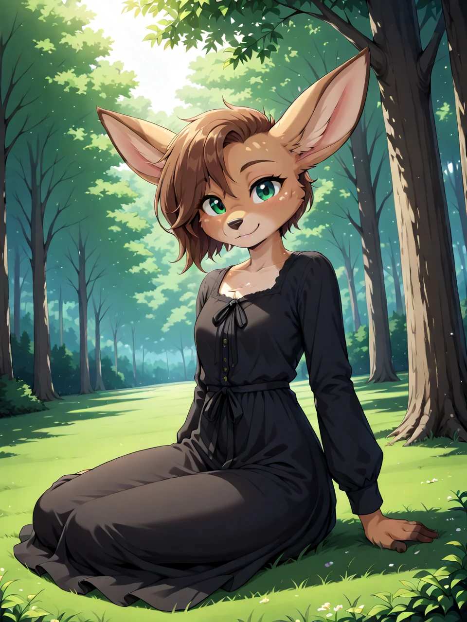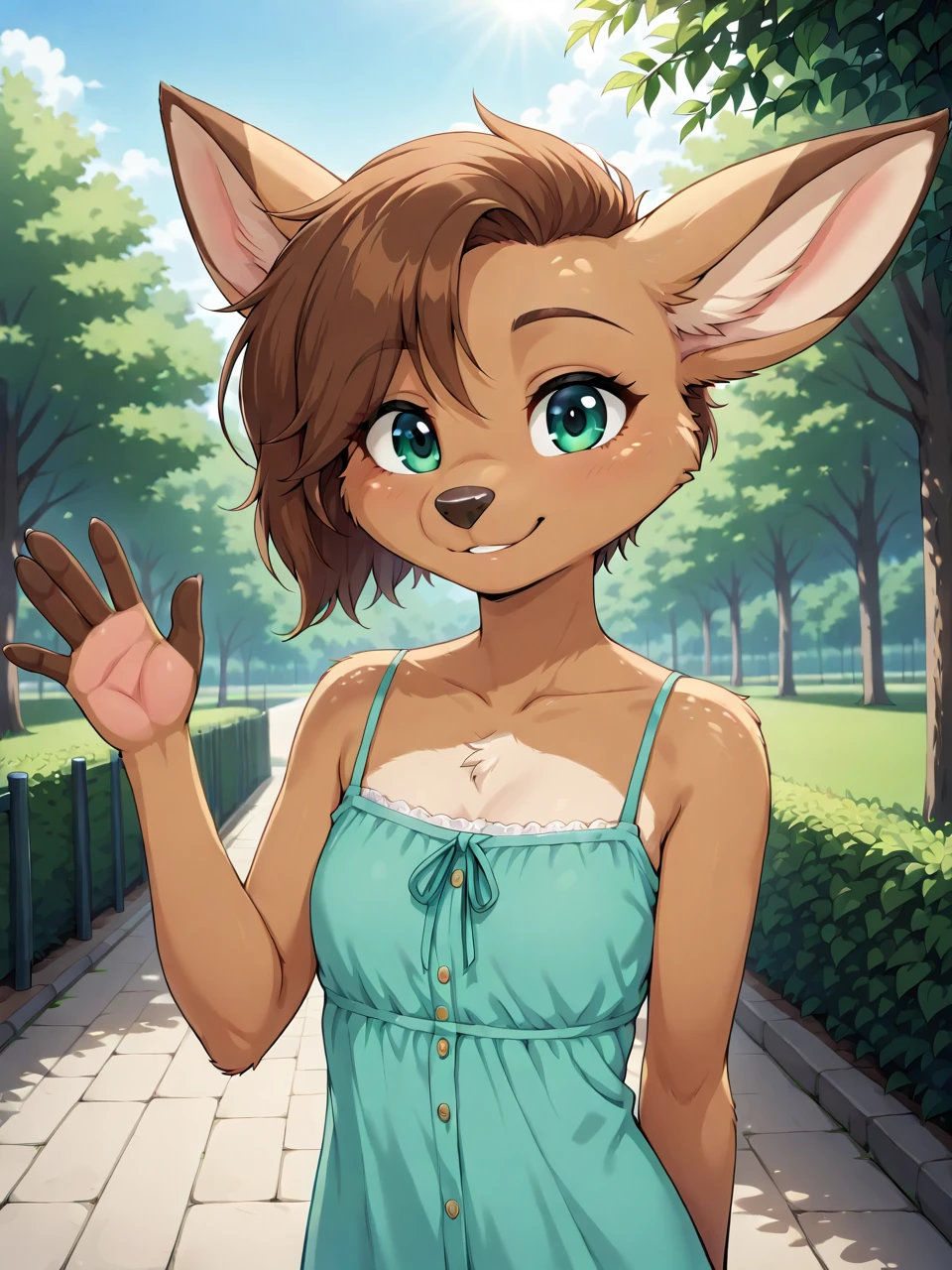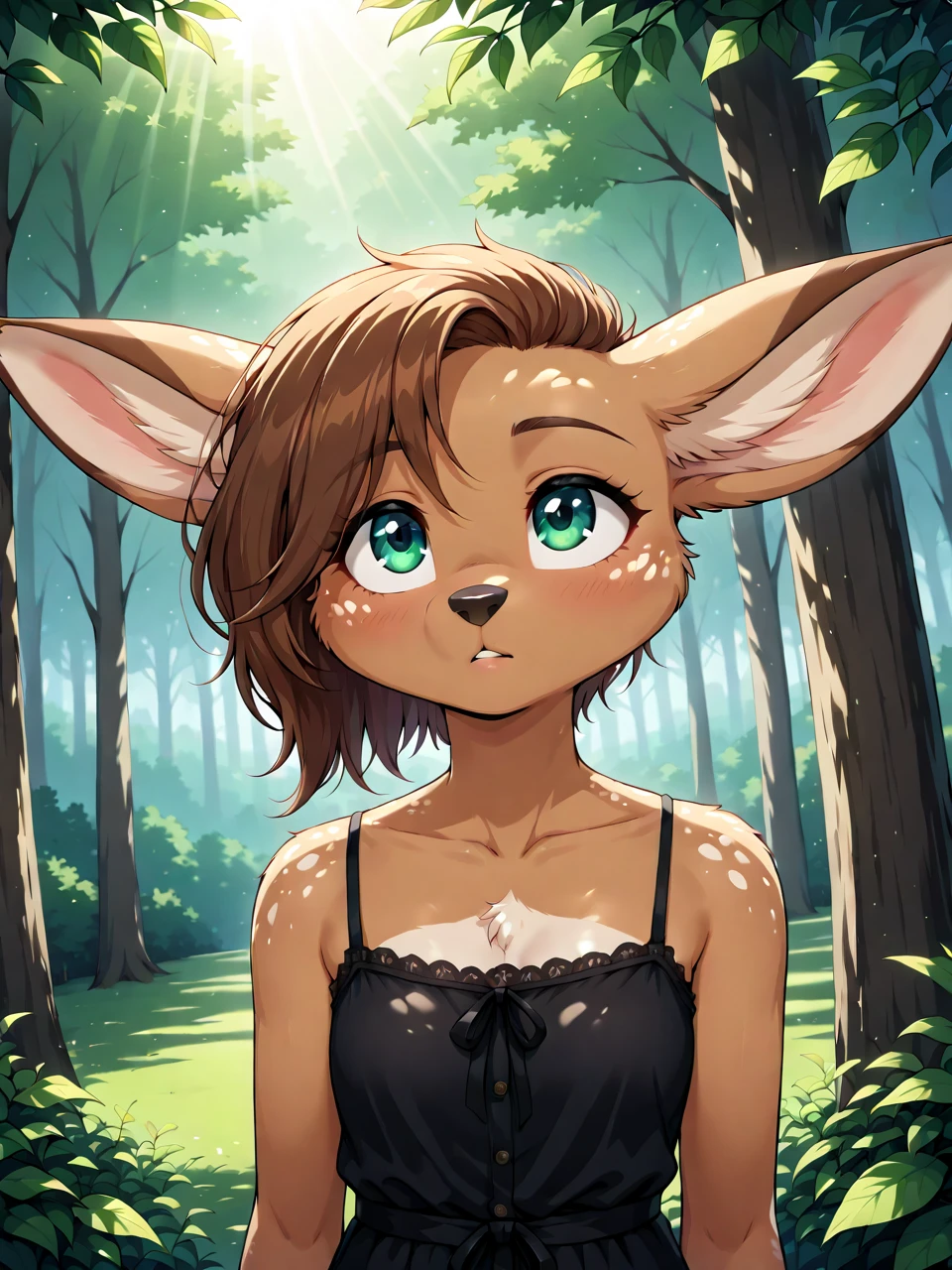 L0tt3, 1girl, solo, short hair, bangs, brown hair, green eyes, animal ears, furry female, animal nose,