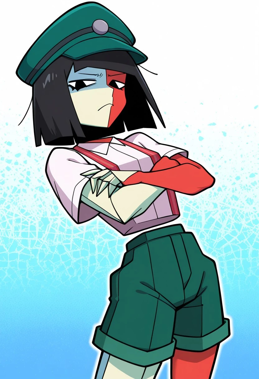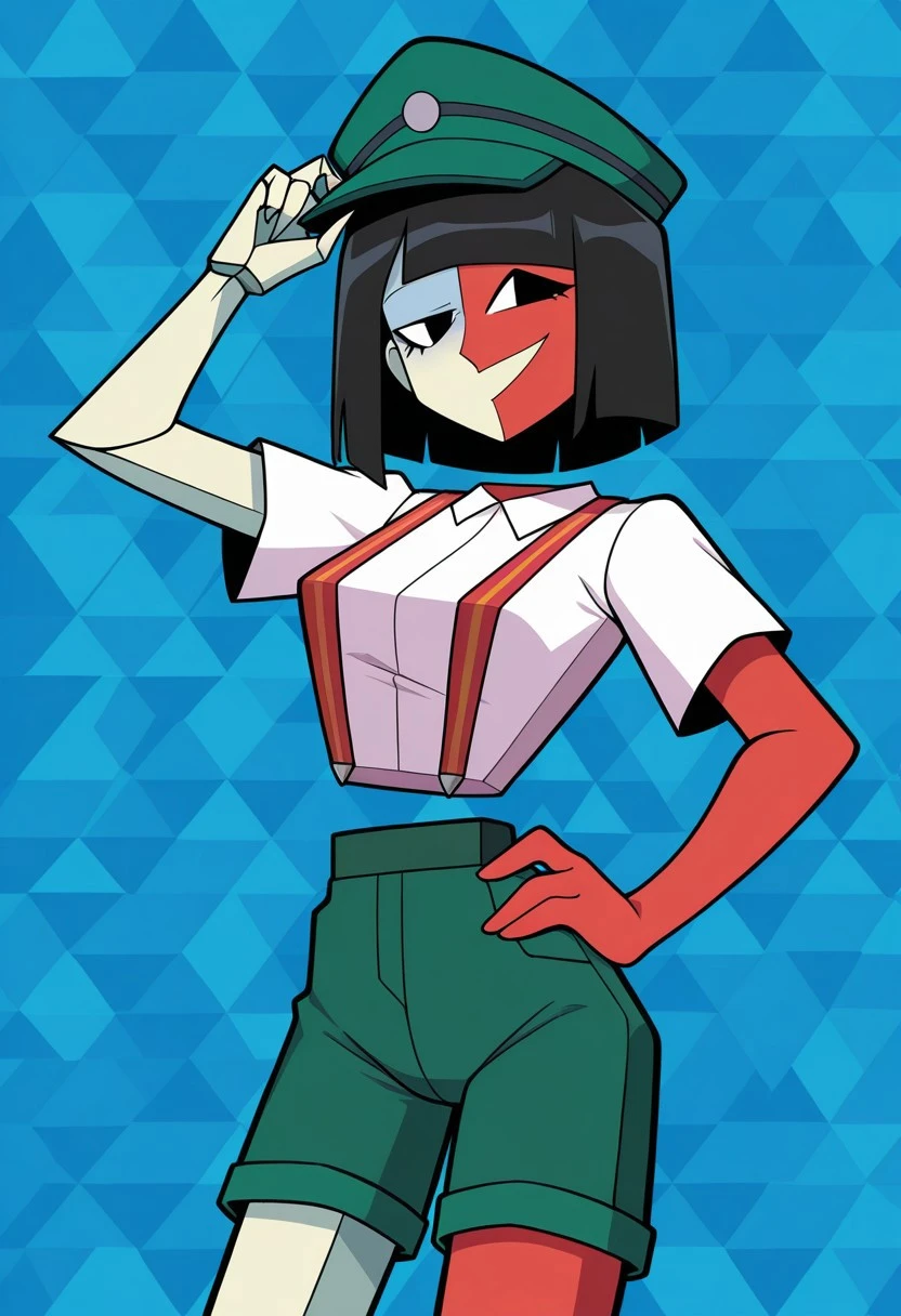 white shirt, collared shirt, short sleeves, suspenders, green shorts