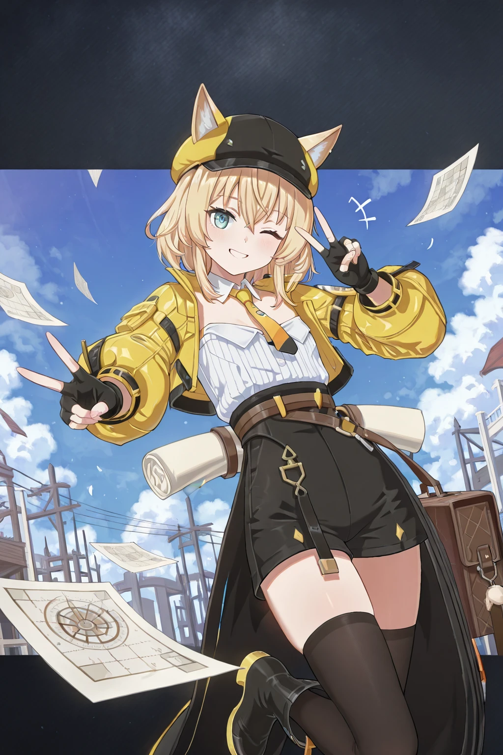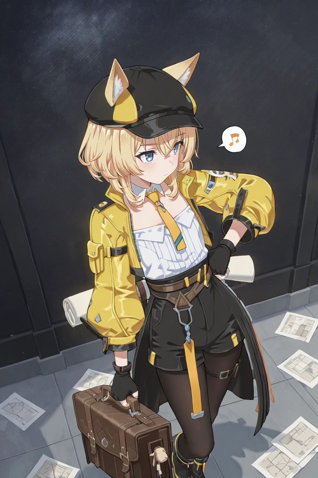 flat chest,blonde hair, short hair, blue-green eyes, animal ears, black and yellow hat, white american sleeve, sleeveless, ribbed shirt, yellow jacket, puffy sleeves, detached collar, bare shoulders, black knee-high tights, black boots with yellow soles, yellow tie, black shorts, black butt cape, brown briefcase, rolled-up blueprints, fingerless gloves,