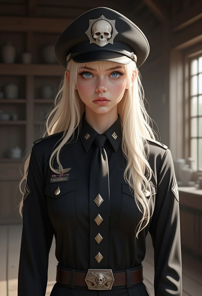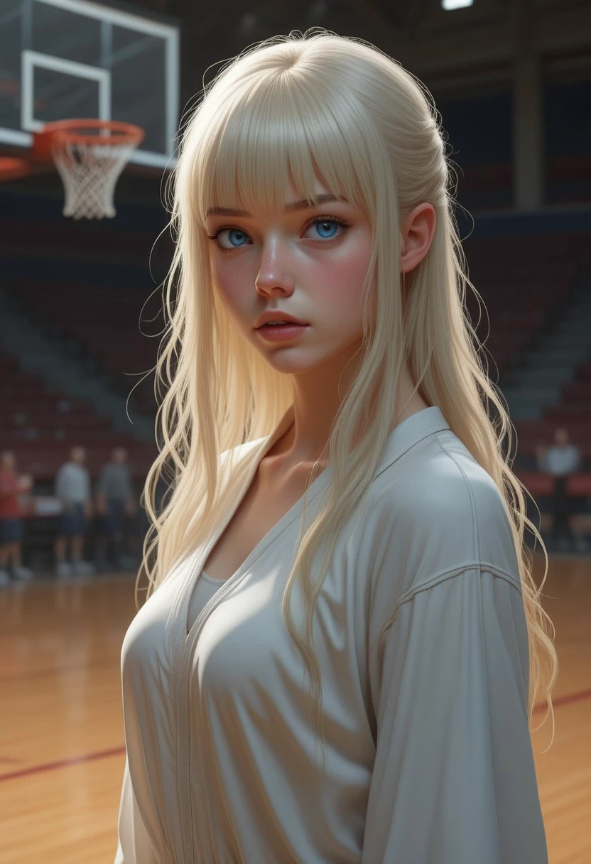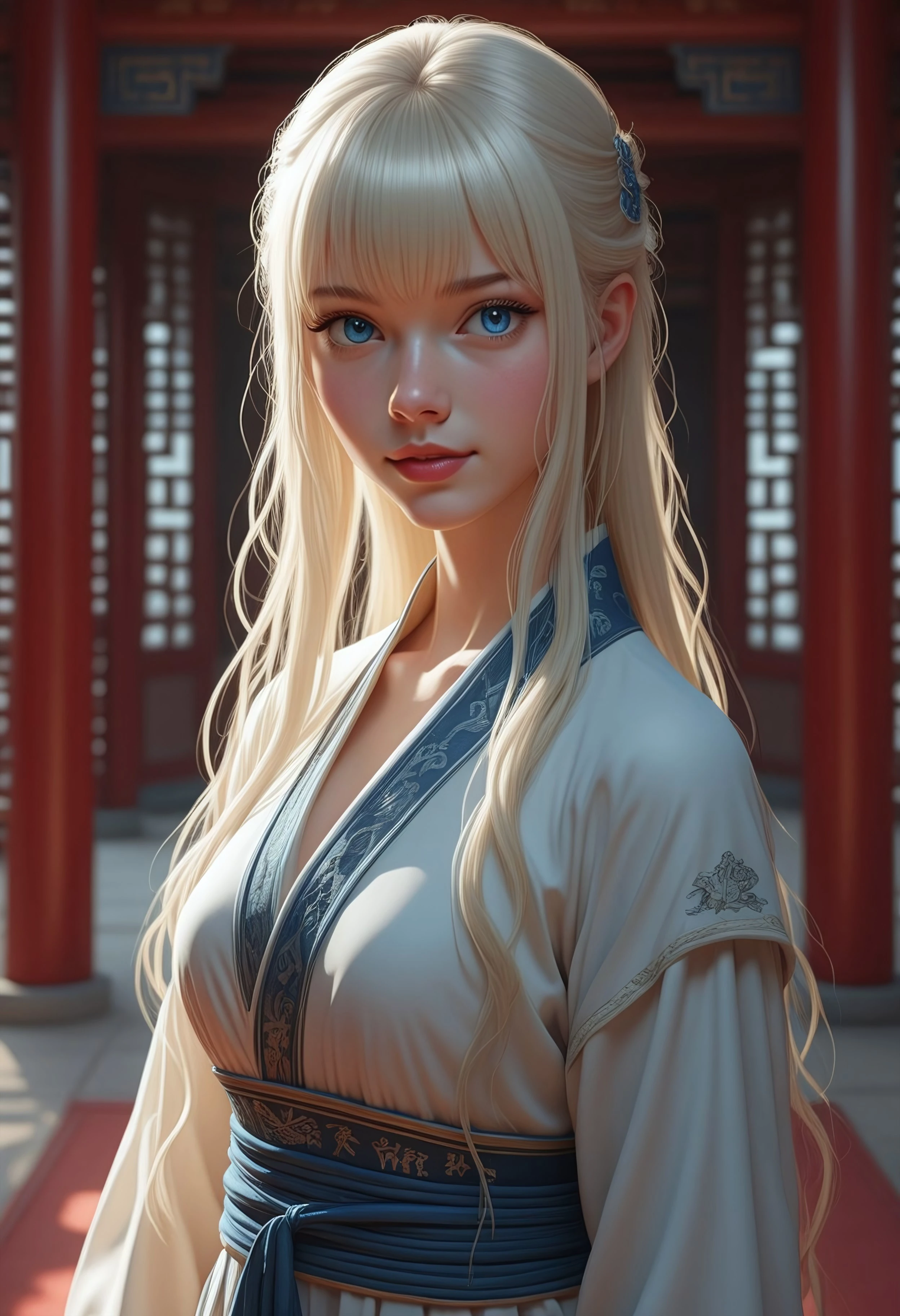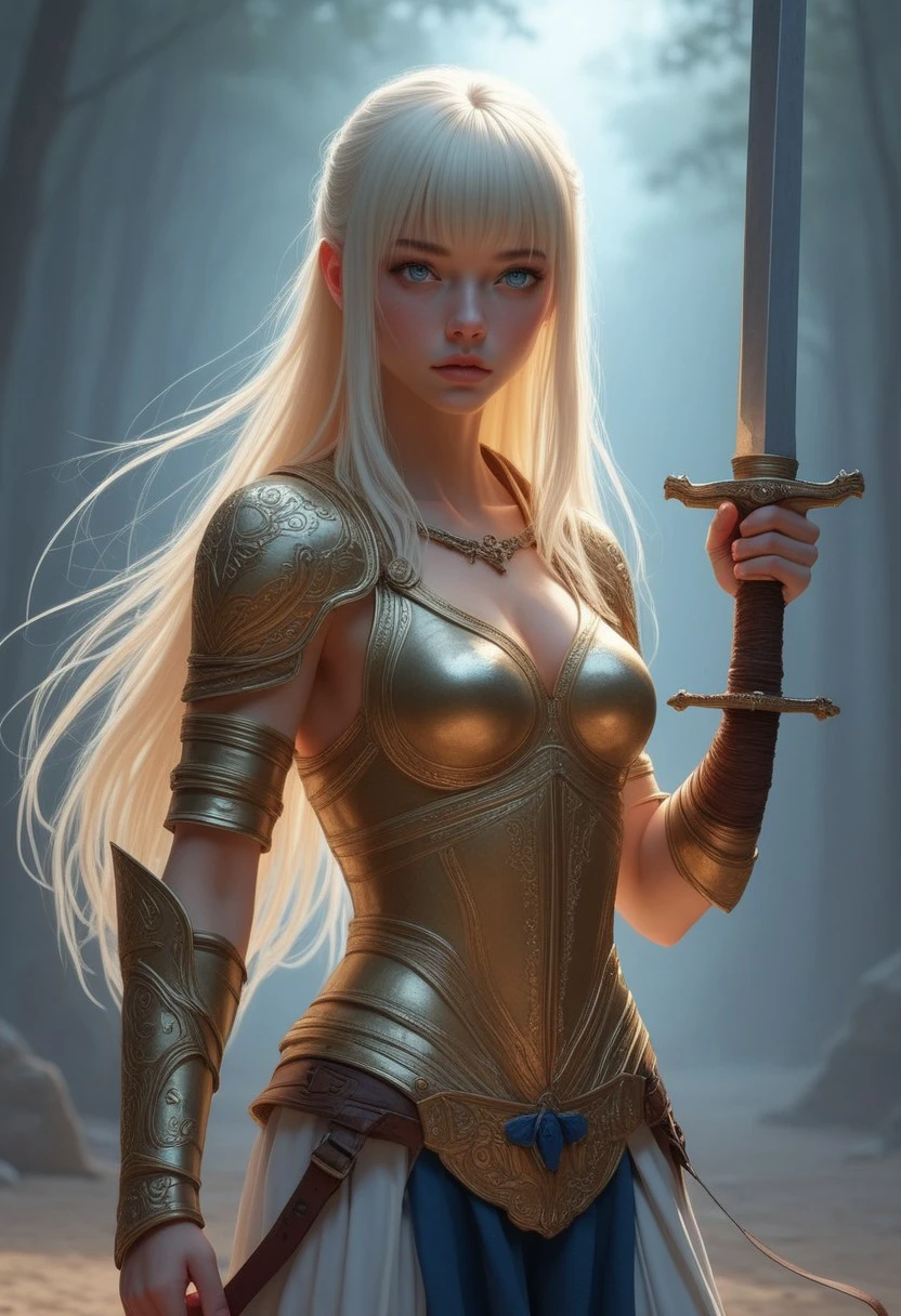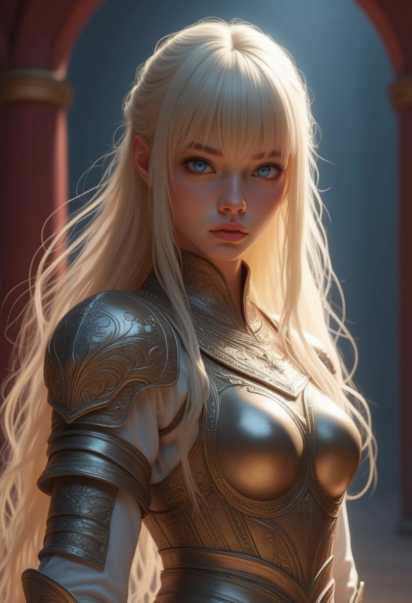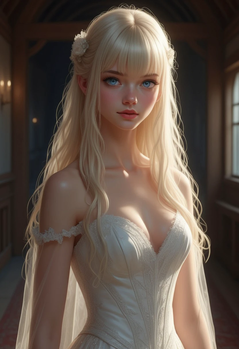 This is a highly detailed, digital illustration in a realistic fantasy style, The image shows Lea, a girl with fair, porcelain-like skin, long platinum-blonde hair with bangs that frame her face, and a petite, slender figure, and a small nose, small breast, and red eyes.