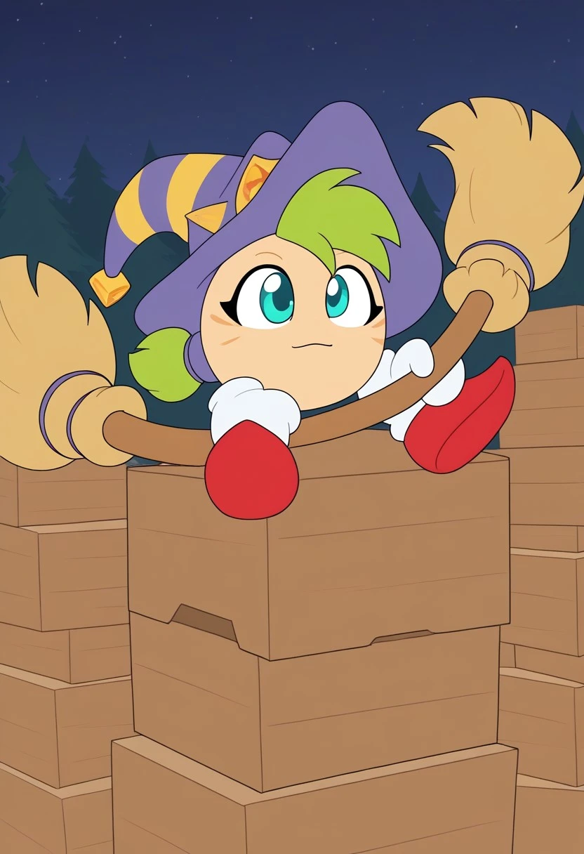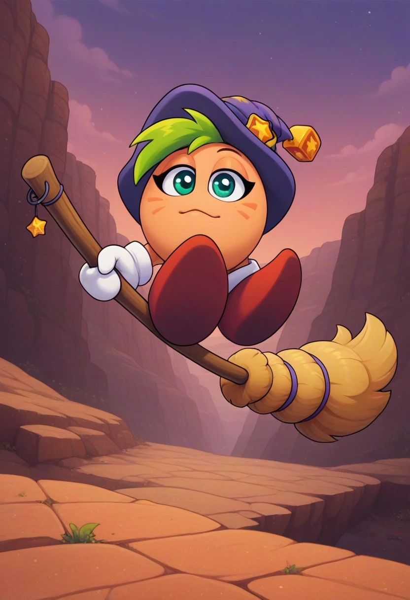 Gryll, ball-shaped body, peach skin, teal eyes, green tuft of hair, purple witch hat, white gloves, red shoes, holding broom