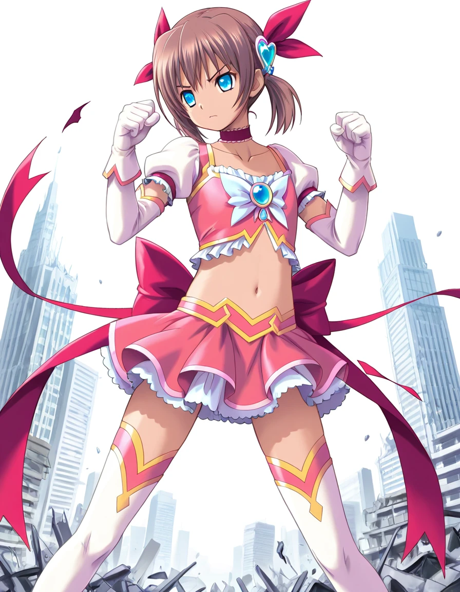 skirt, thighhighs, gloves, white background, bow, ribbon, navel, choker, elbow gloves, midriff, magical girl