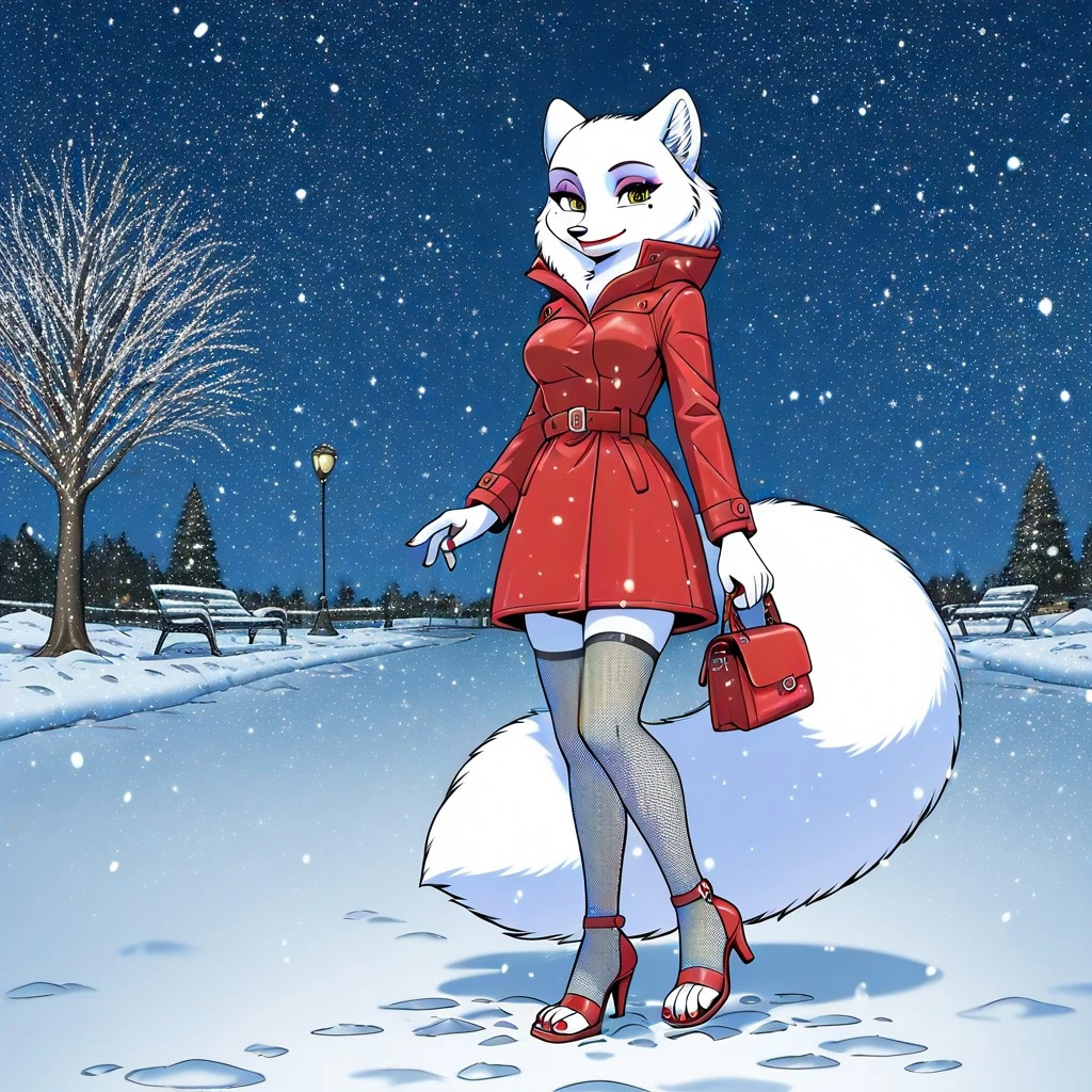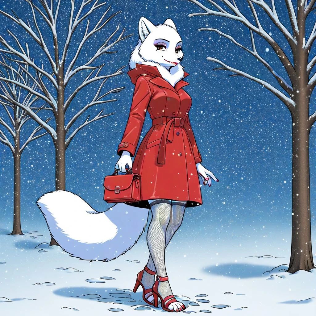arctic fox, fox girl, white fur, hazel eyes, mole under eye, black nose, fox ears, fox tail, , makeup, purple eyeshadow, red lipstick, red nail polish, red winter coat, fishnet thighhighs, red high heels,