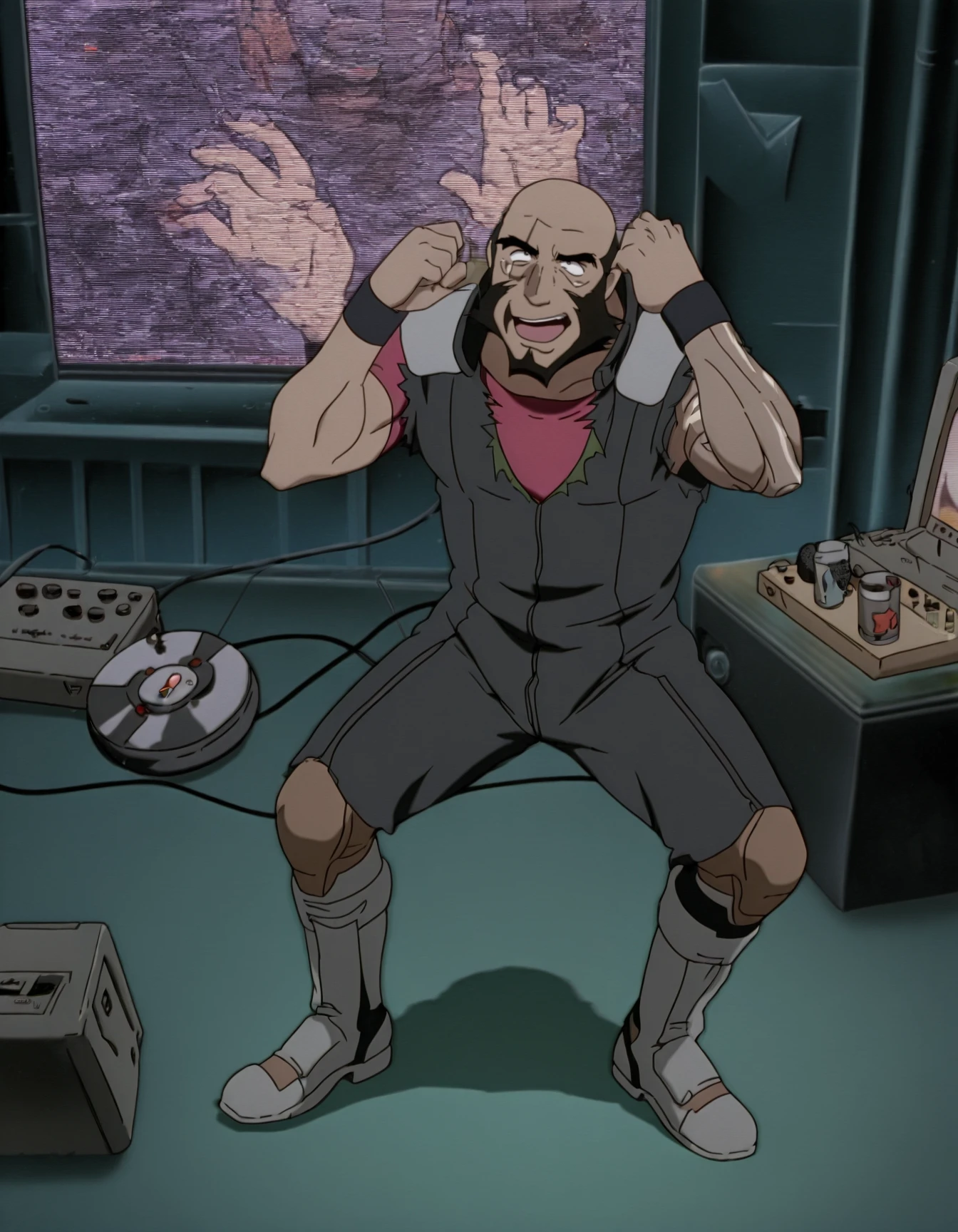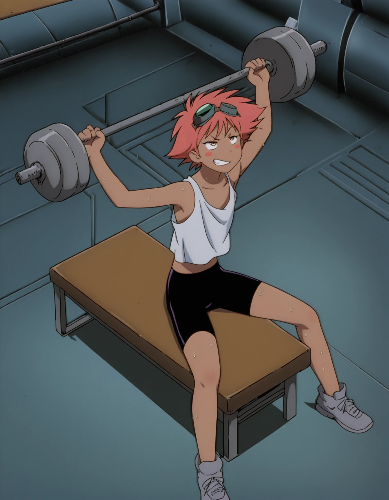 ed0wa5d, blush stickers, goggles on head, white tank top, bike shorts
