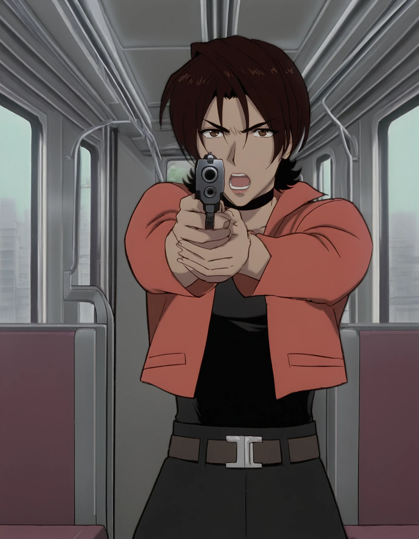 ovirowa, choker, black tank top, bare shoulders, bandaged arm, belt, pants