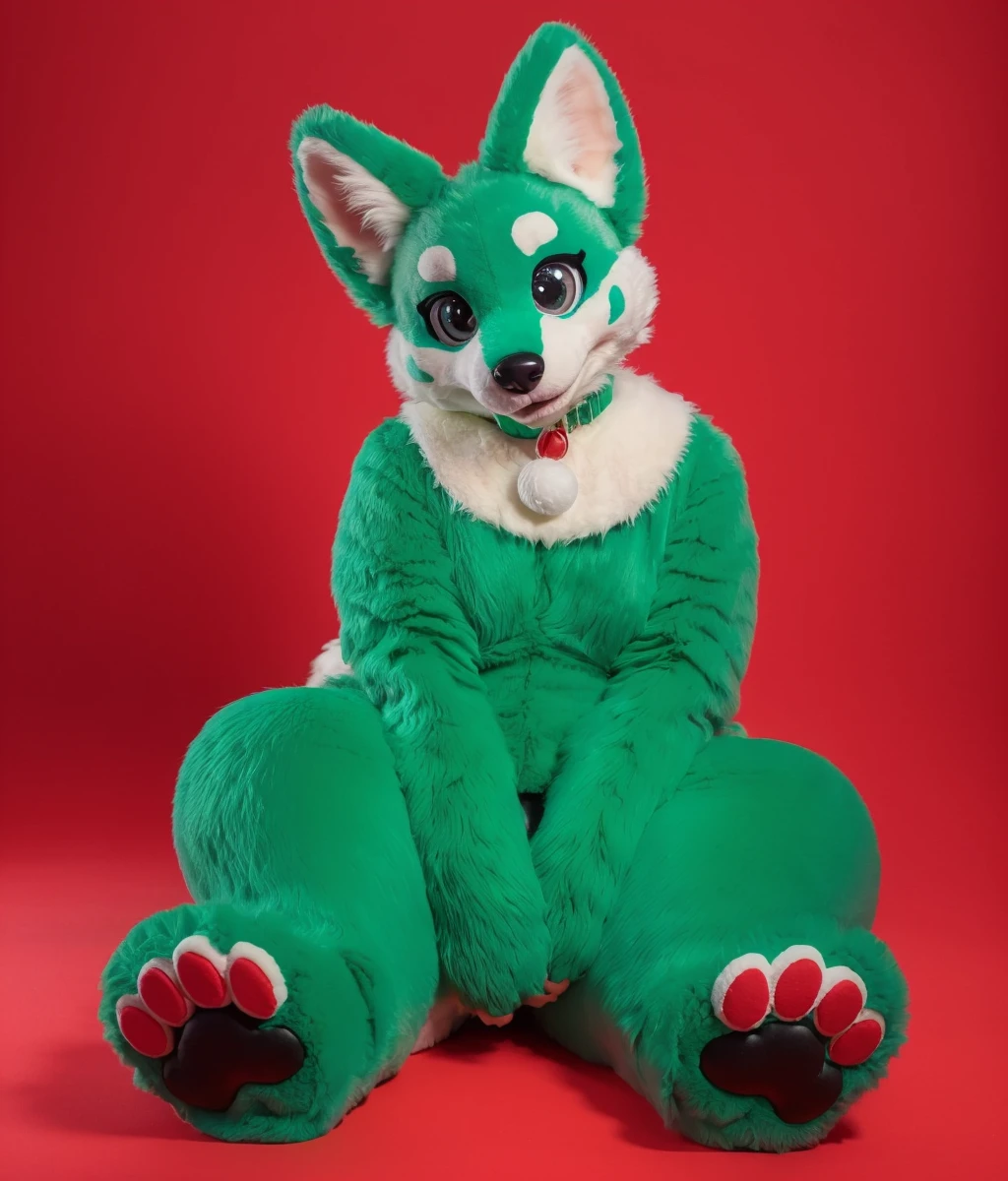 Tag:furry,big eyes,fur collar,paw gloves,large tail,fluffy,chuchumy,solo,no humans,cuteg,simple background,fursuit,Fursona,