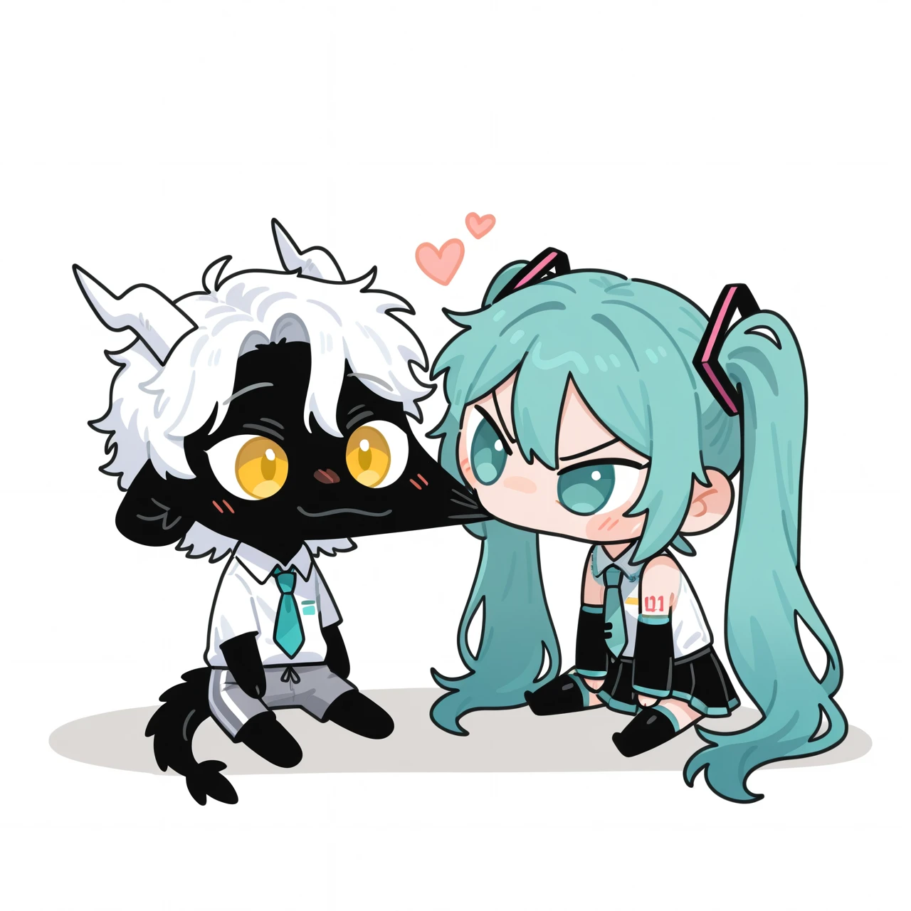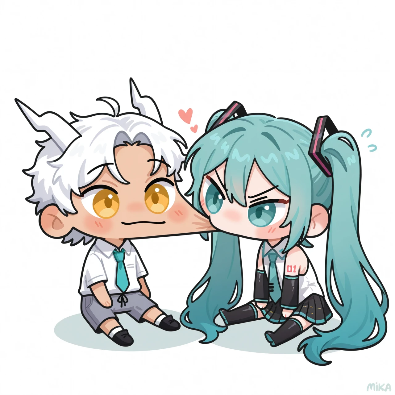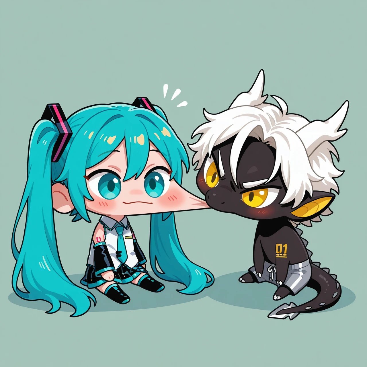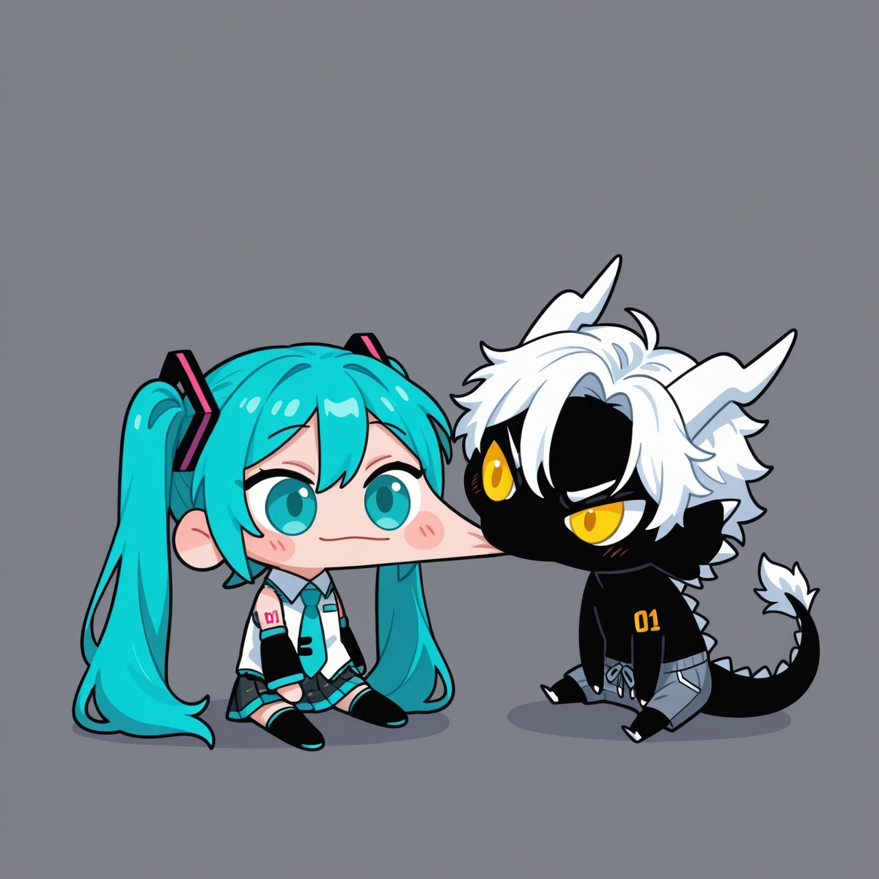 mikus-concept, duo, chibi, face stretch, pulling cheek, facing each other, sitting, close-up, full body, simple background