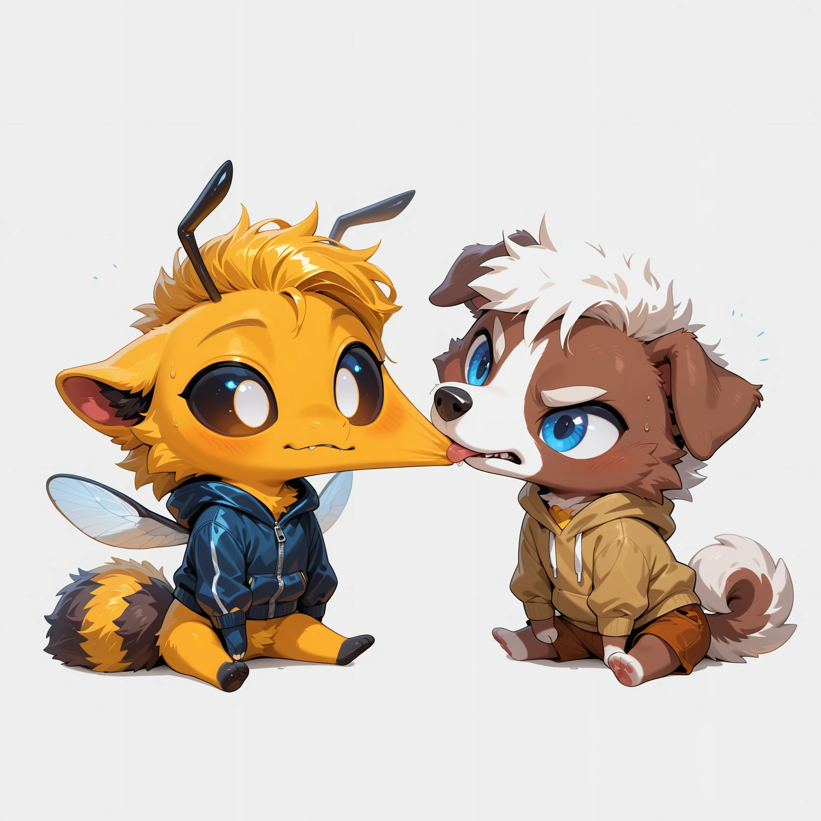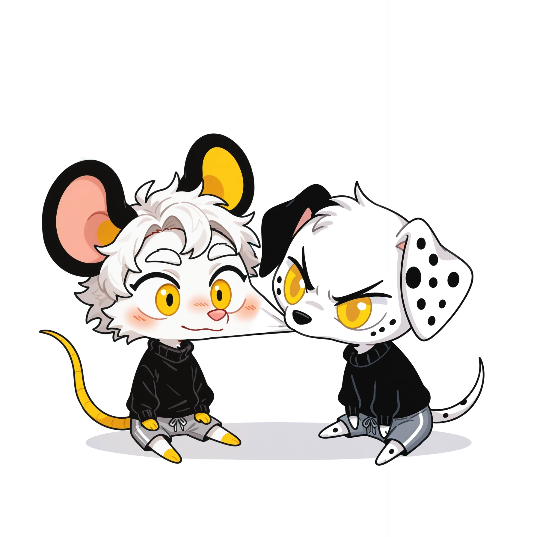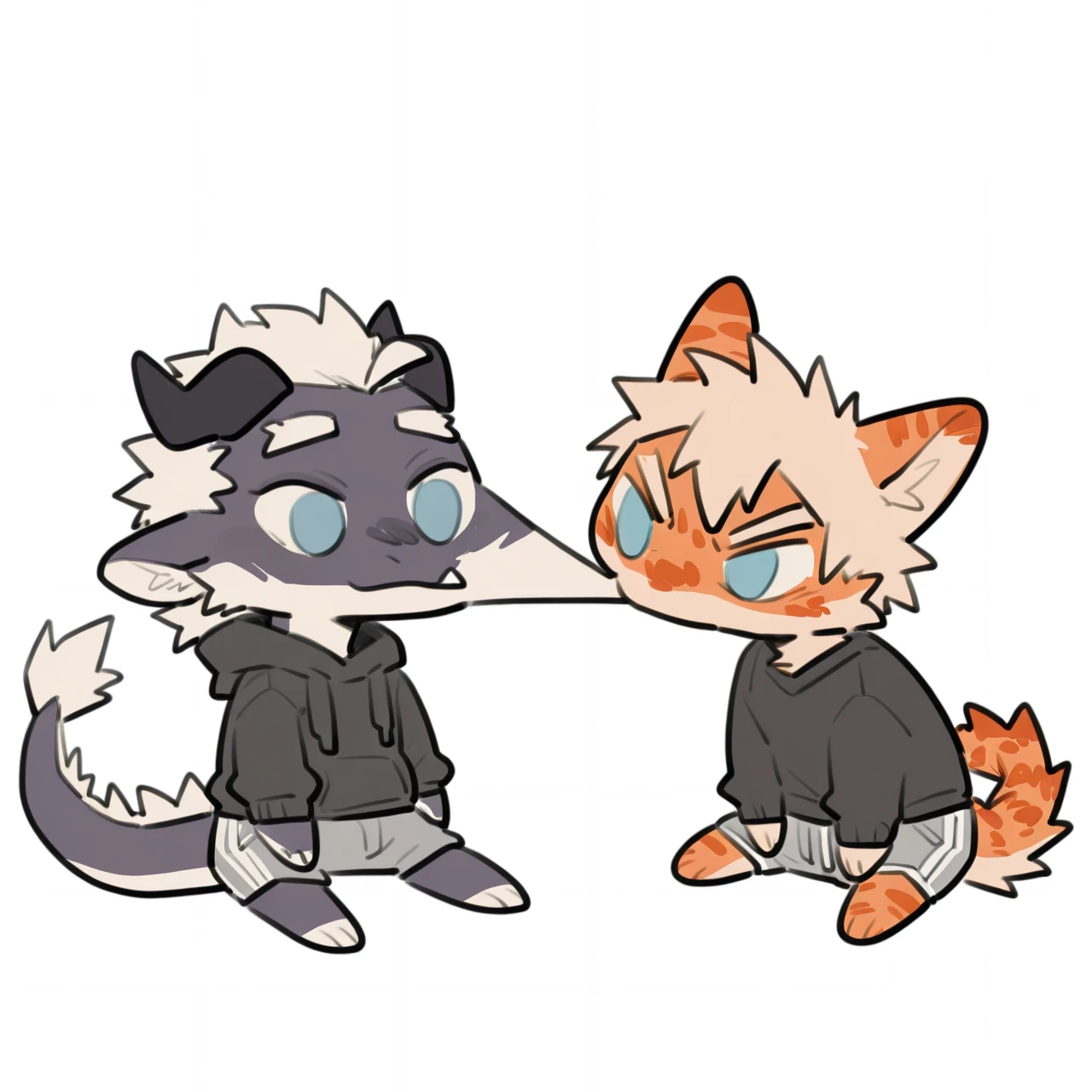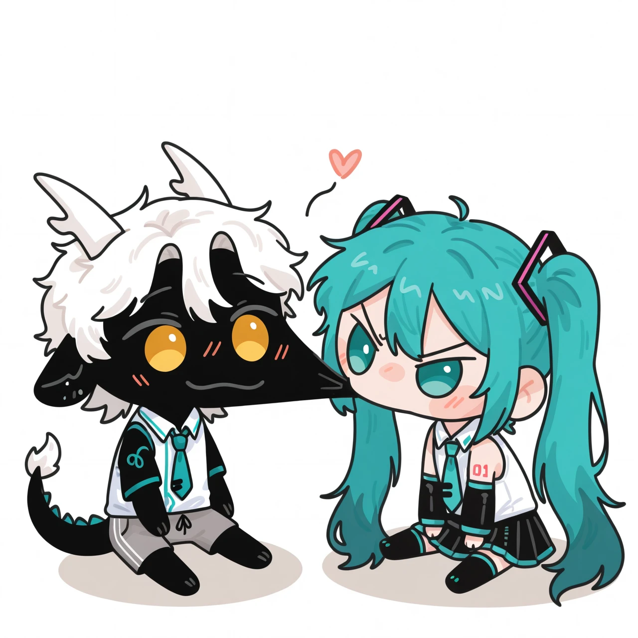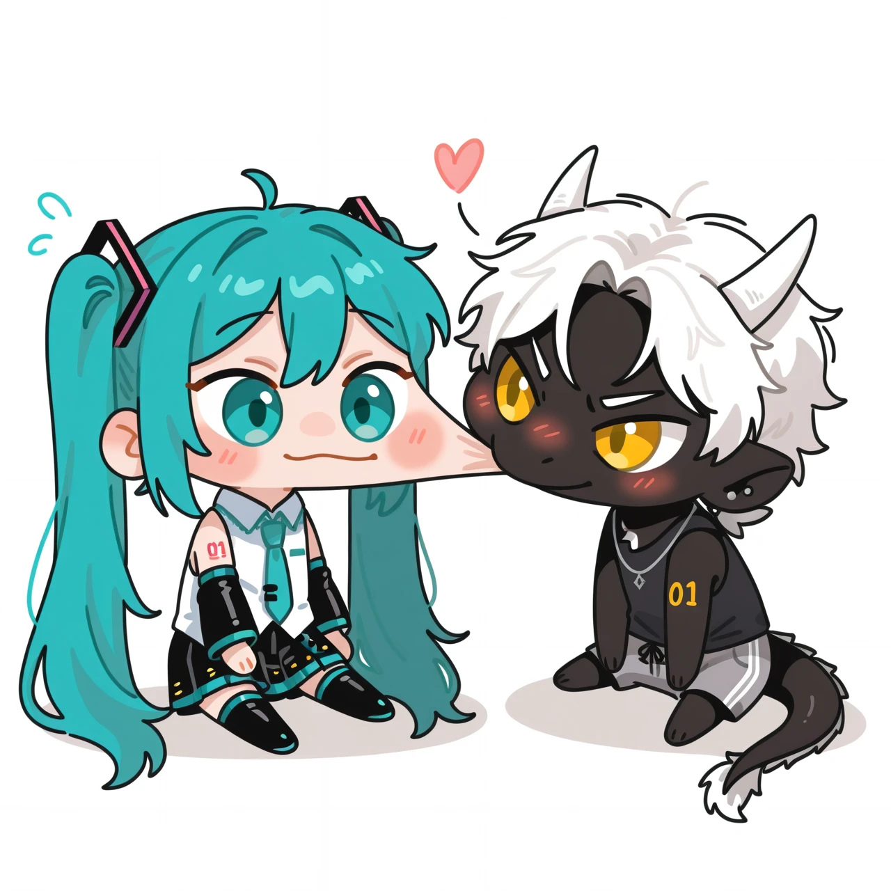 mikus-concept, duo, chibi, face stretch, pulling cheek, facing each other, sitting, close-up, full body, simple background