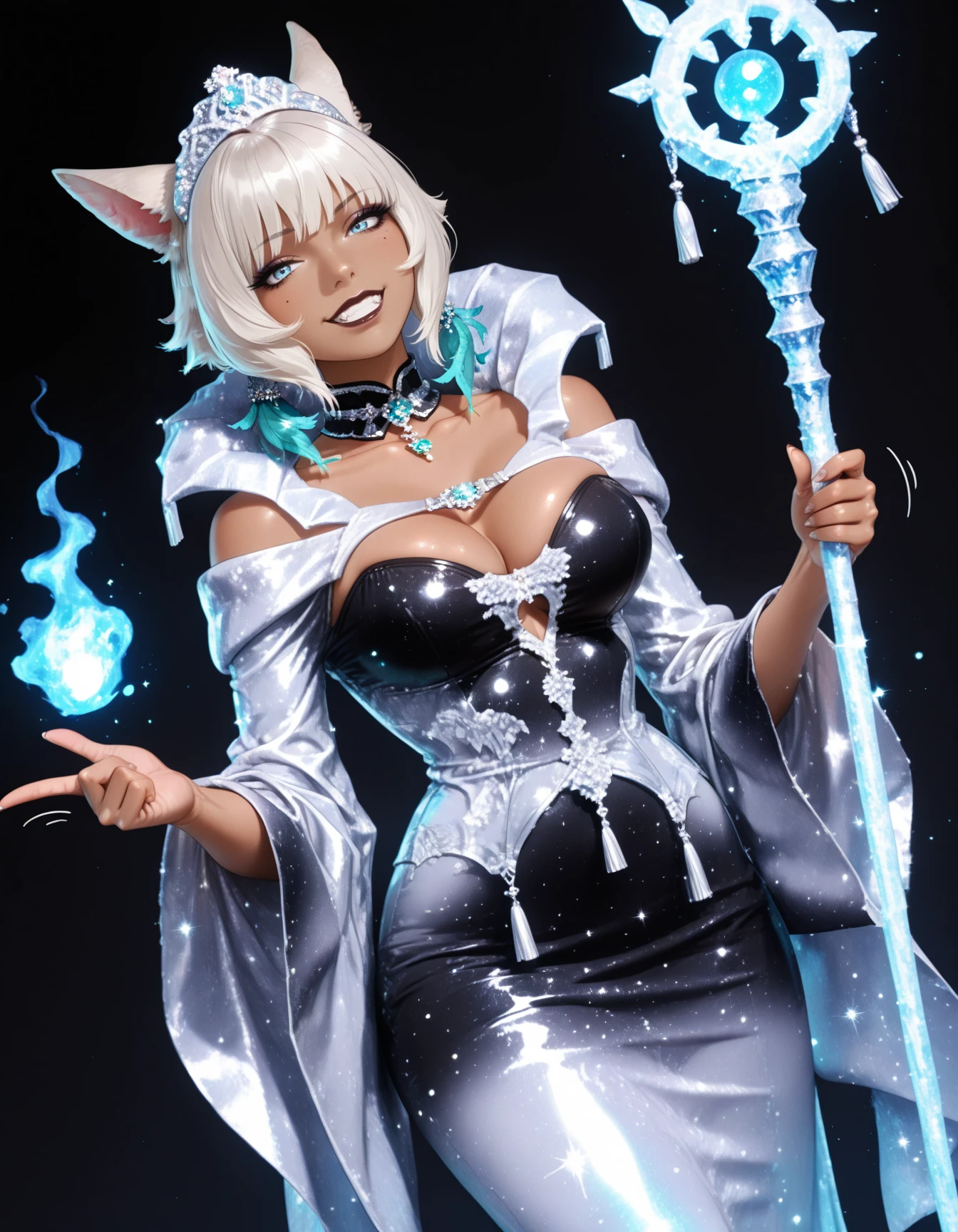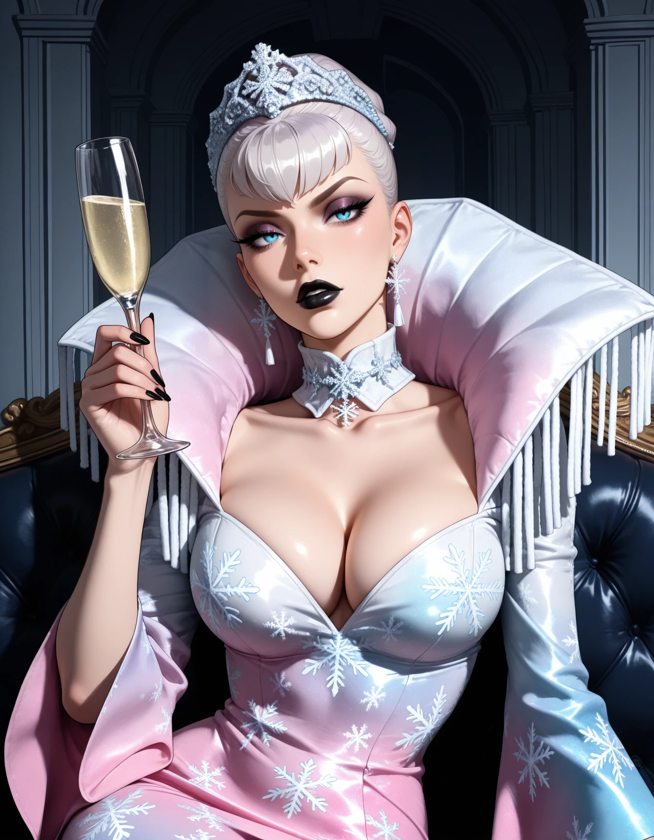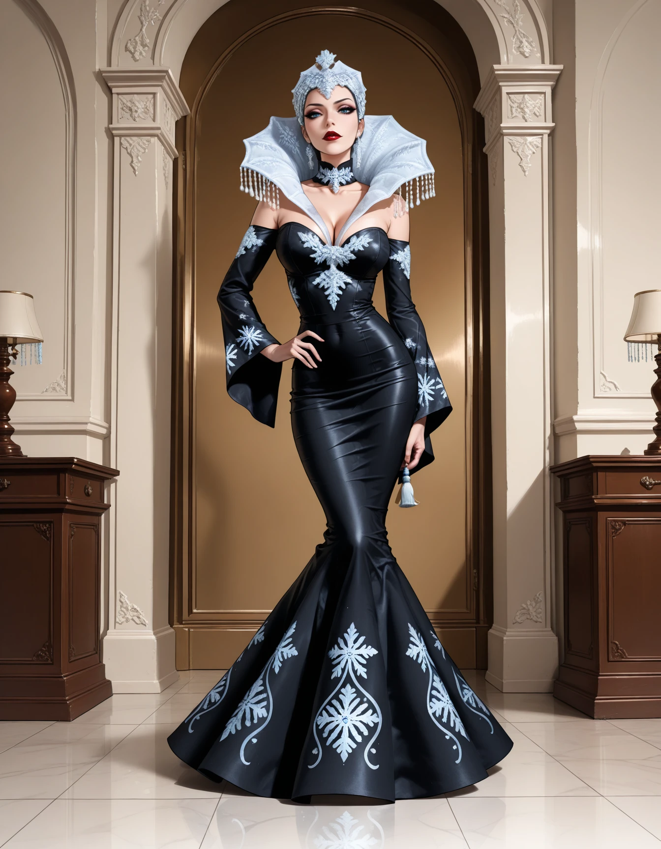 Best with: black clothing, gradient clothing, multicolored dress, snowflake print, satin clothing, cleavage, detached collar, (oversized high collar, elizabethan collar), tiny tassels, flared skirt, floor length dress, formal, tiara, wide sleeves, collarbone