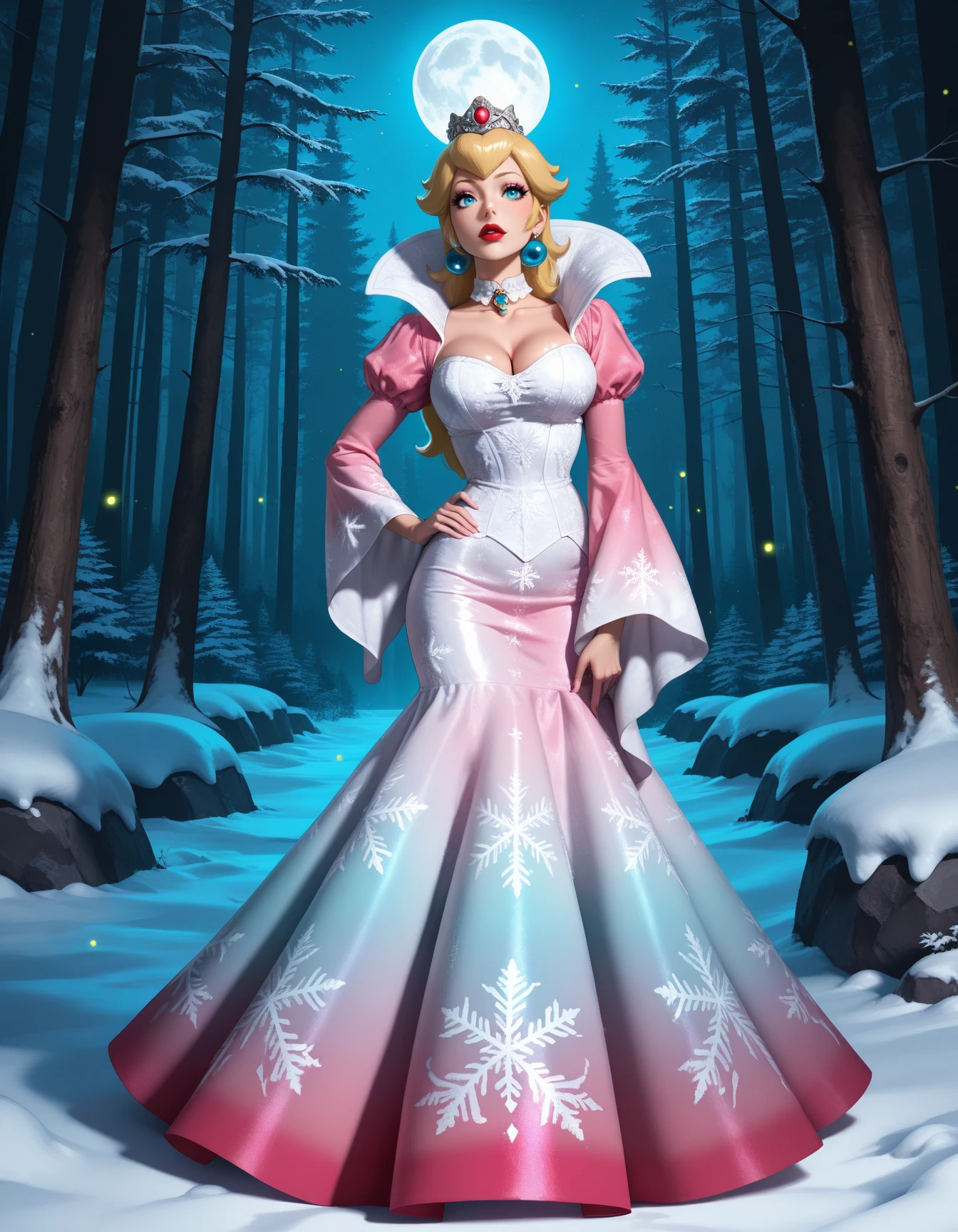 blue clothing, gradient clothing, multicolored dress, snowflake print, satin clothing, cleavage, detached collar, (oversized high collar, elizabethan collar), tiny tassels, flared skirt, floor length dress, formal, tiara, wide sleeves, collarbone