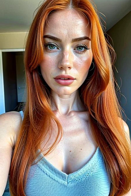 a woman realstic with ginger hair ,eyes blue , white skin , light freckless ,influencer instagram, belarusian