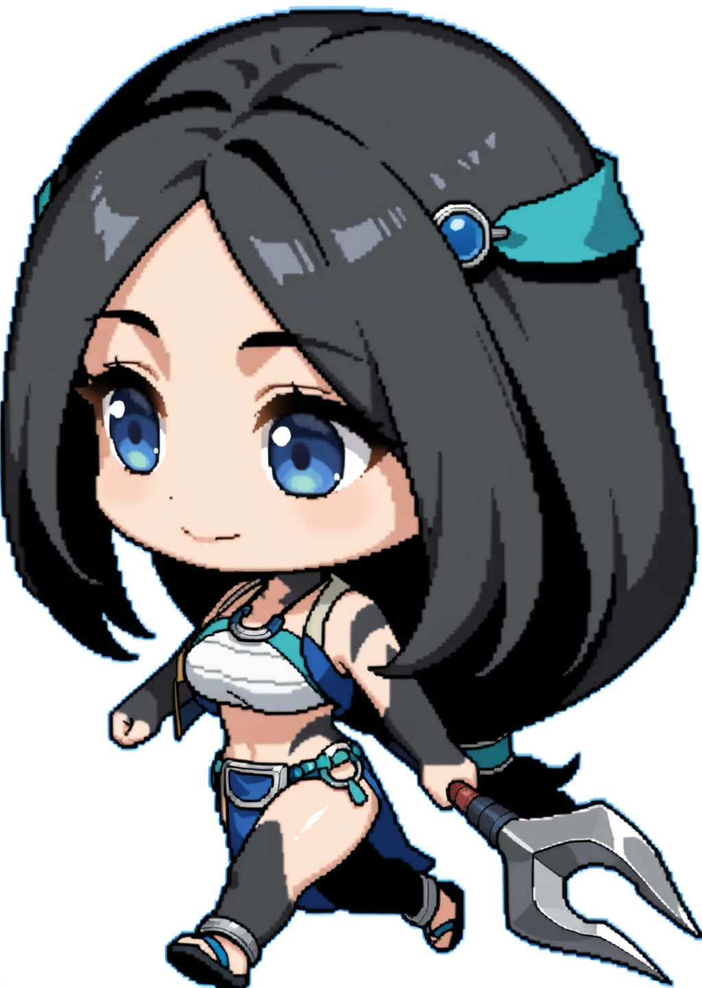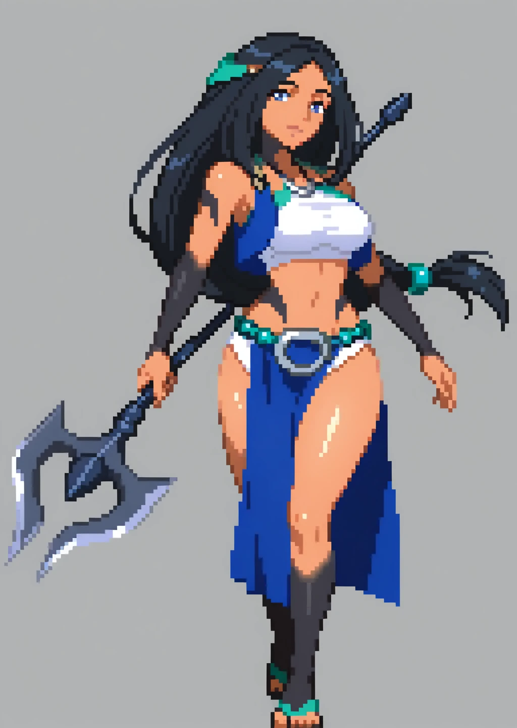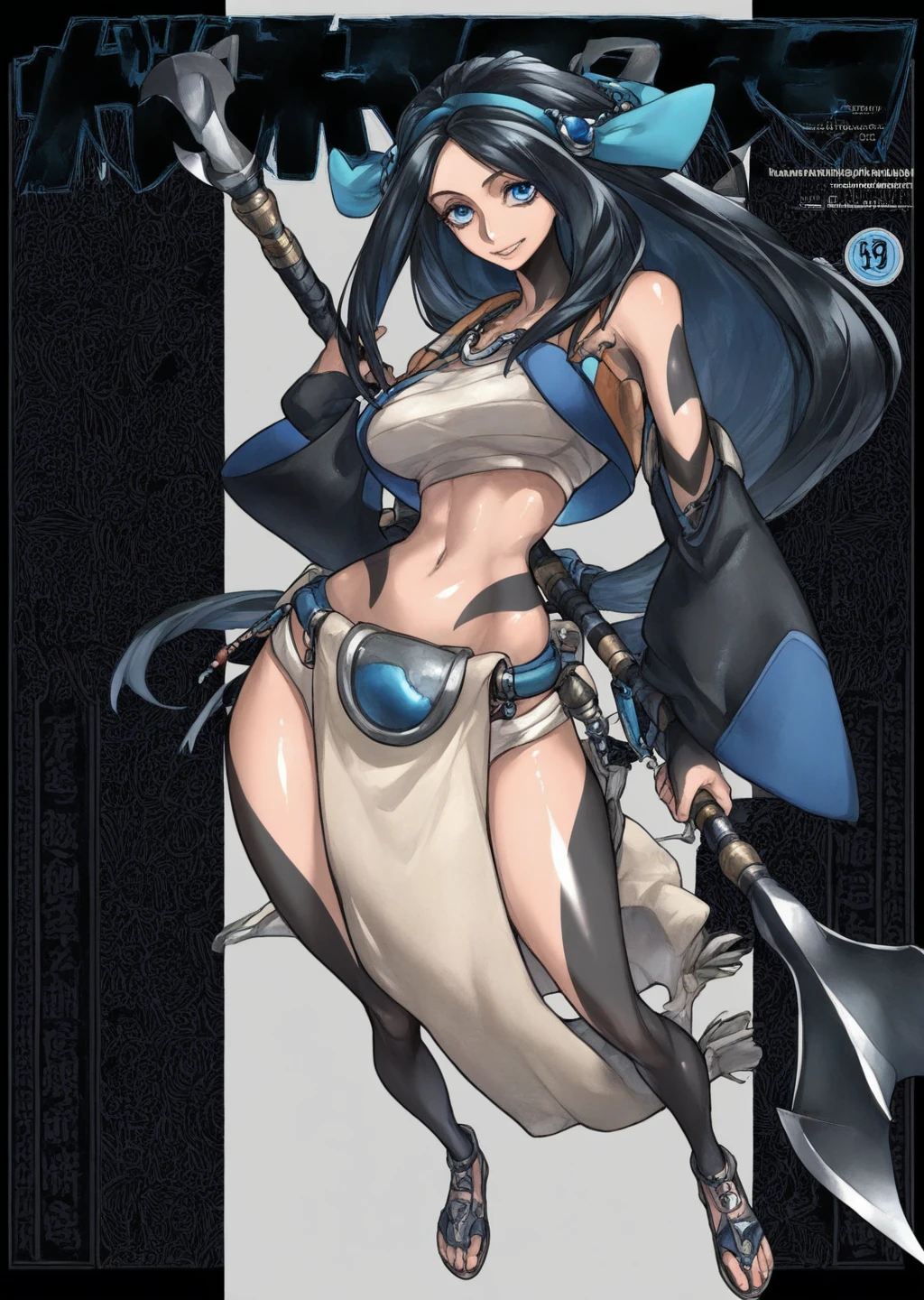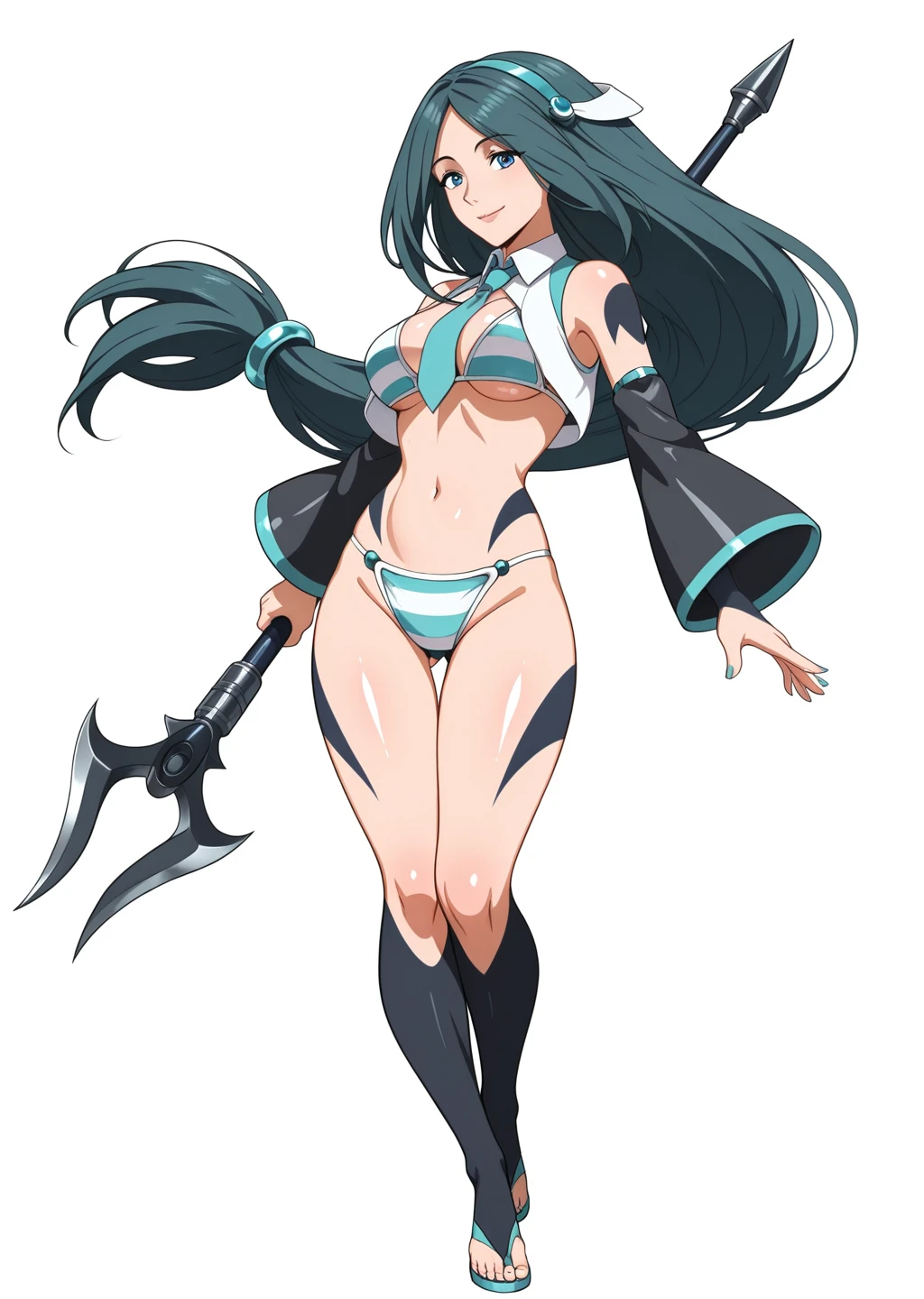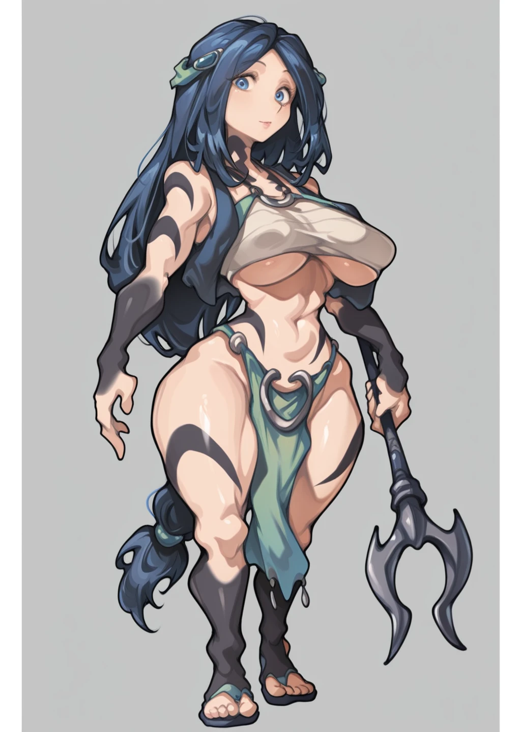 Prompts: sadeena, crop top, hair ornament, hair band, black tattoo sleeves, blue eyes, holding harpoon,