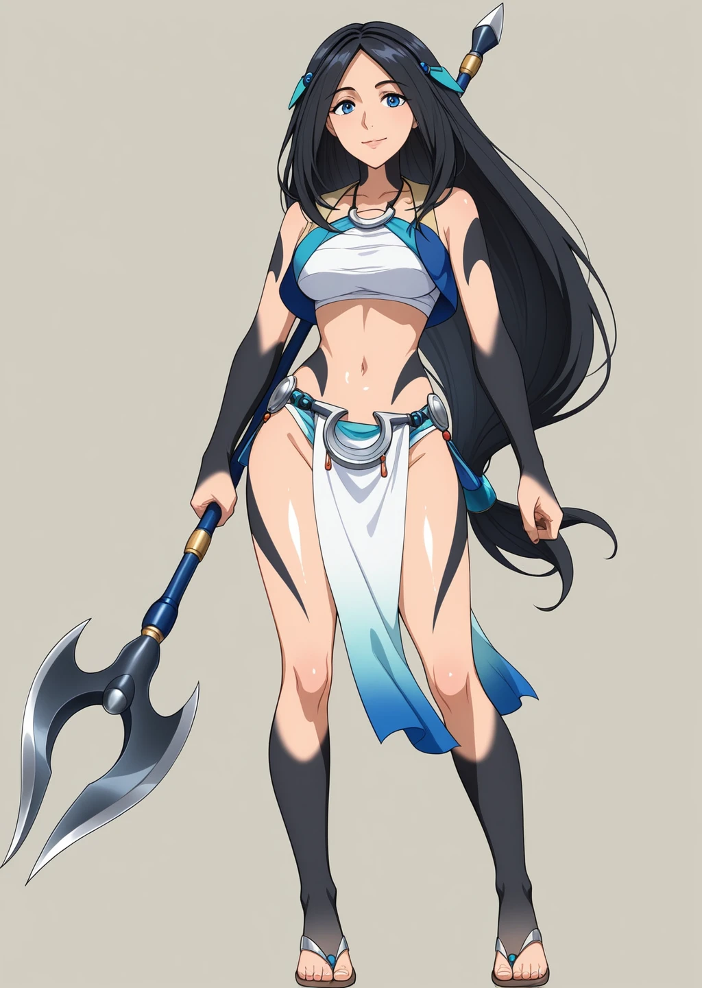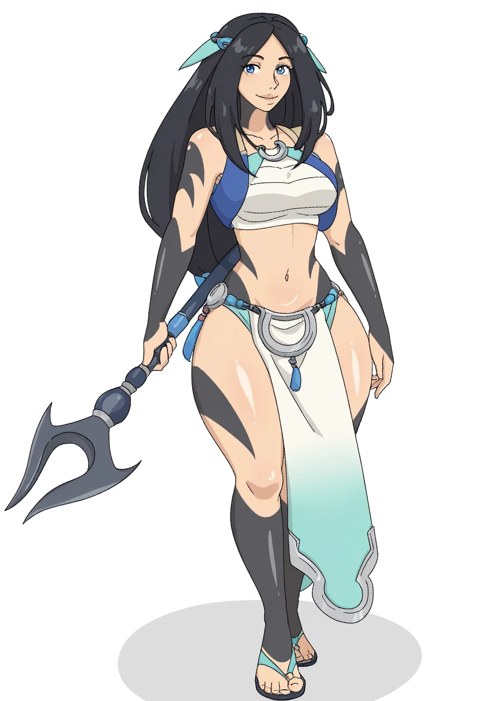 sadeena, crop top, hair ornament, hair band, black tattoo sleeves, blue eyes, holding harpoon,