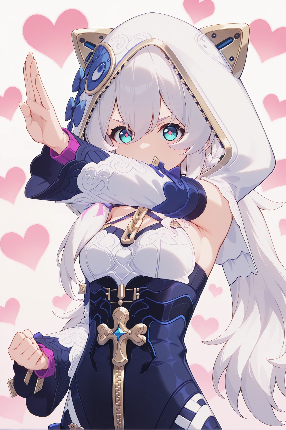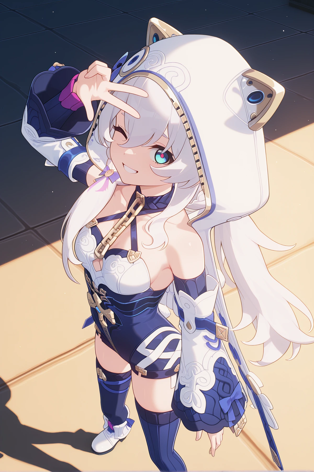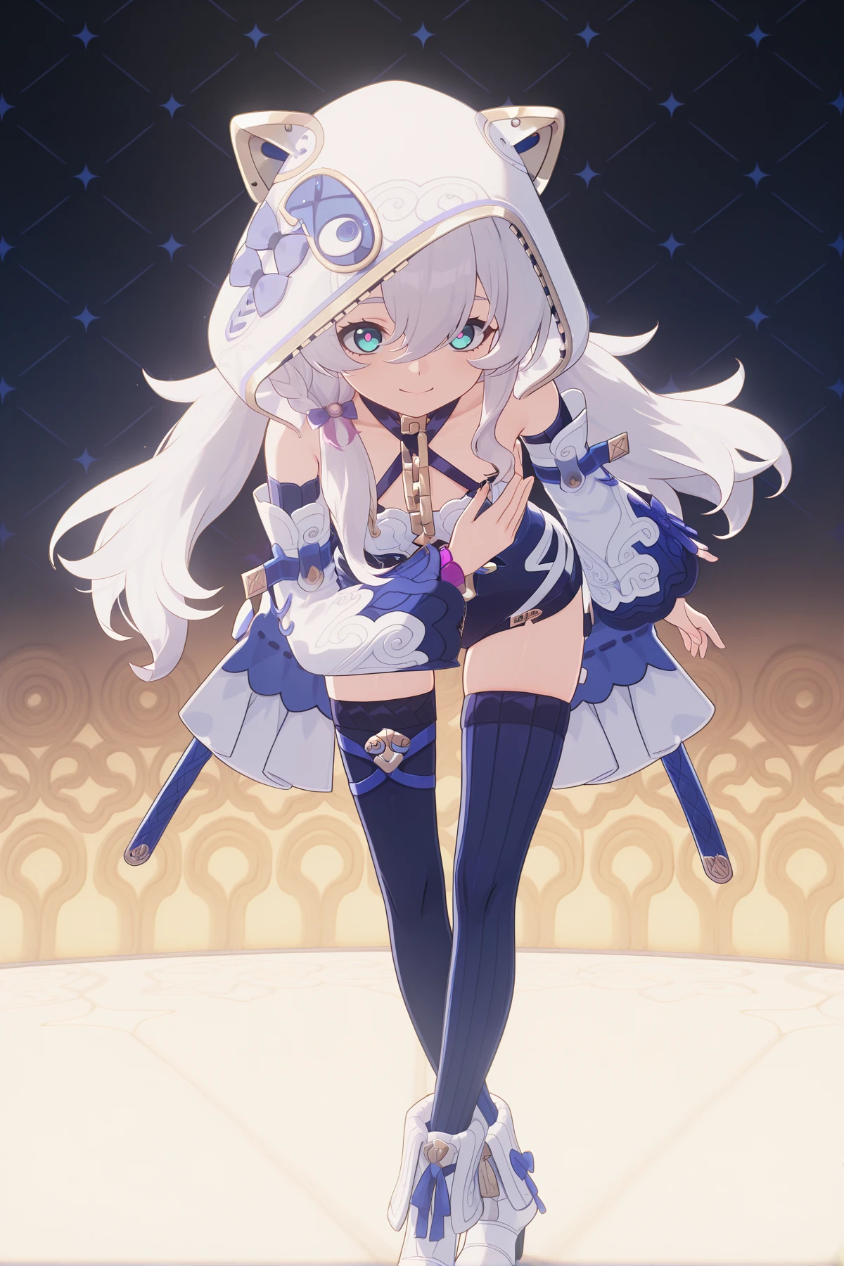 theresa apocalypse \(schicksal's imperative\), white hair, long hair, twintails, braid, asymmetrical sidelocks, hair bow, blue eyes, cat hood, white hood, hood up, criss-cross halter, gold chain, dress, tight clothes, detached sleeves, white sleeves, blue thighhighs, ribbed thighhighs, asymmetrical legwear, white footwear, bootsDescription