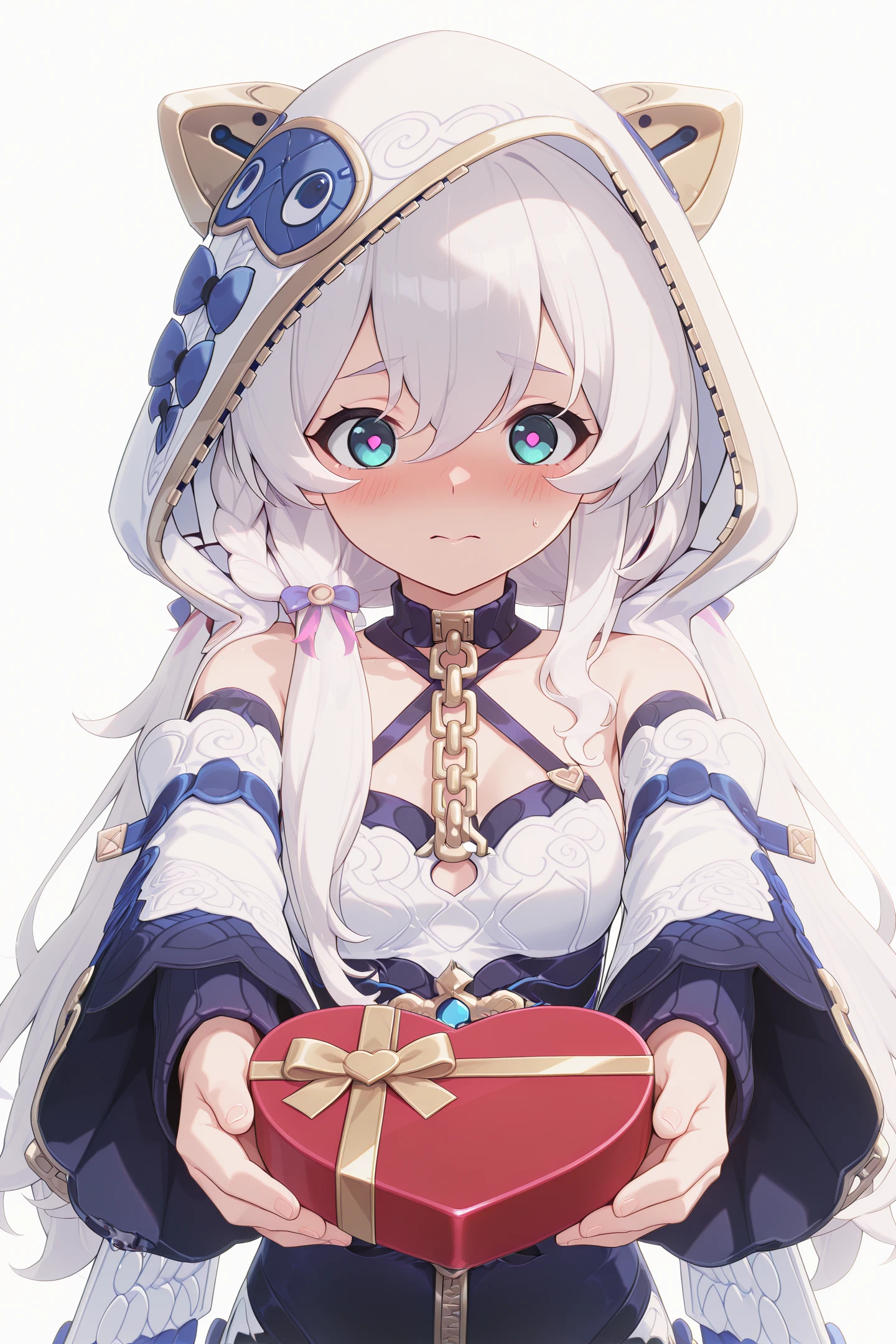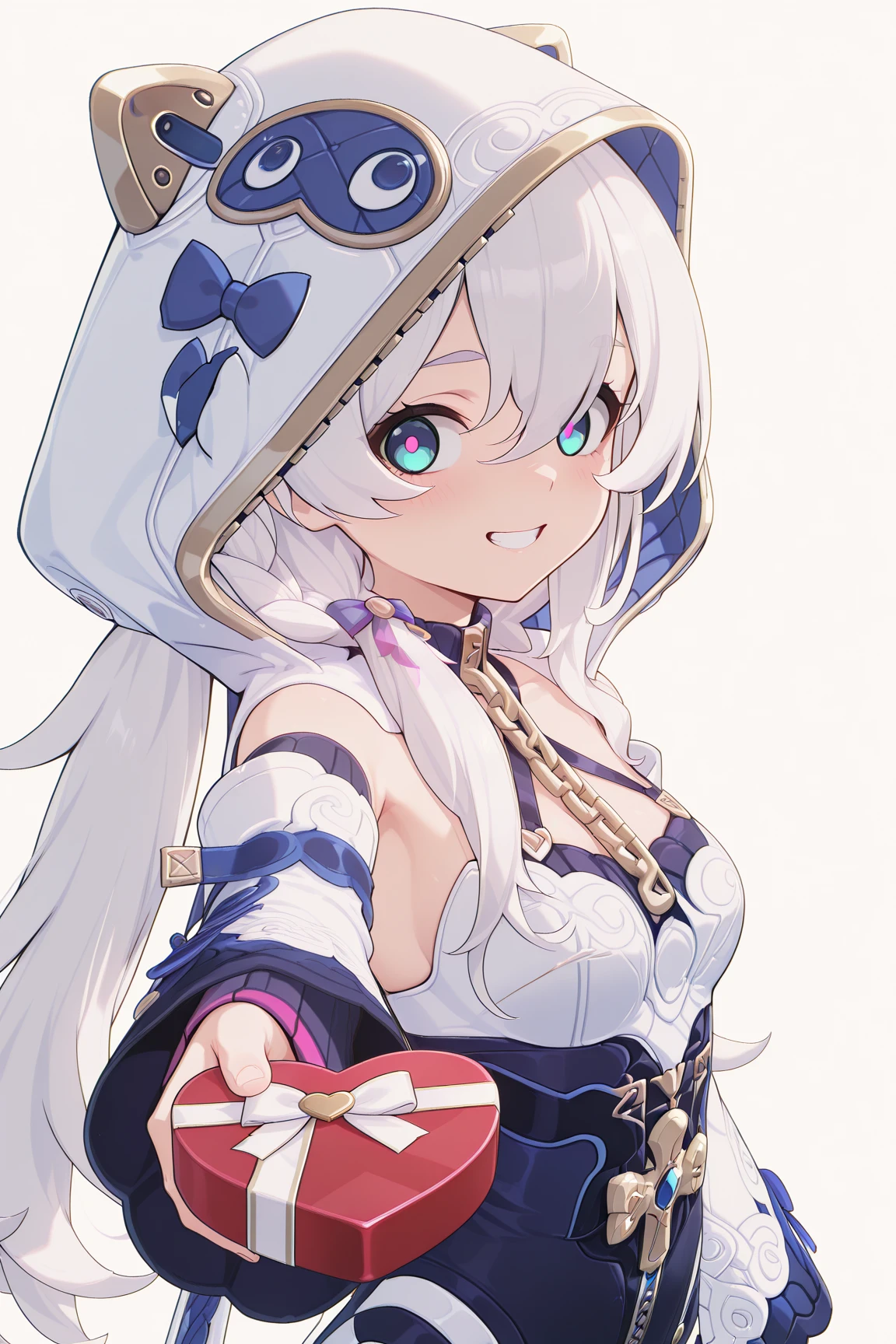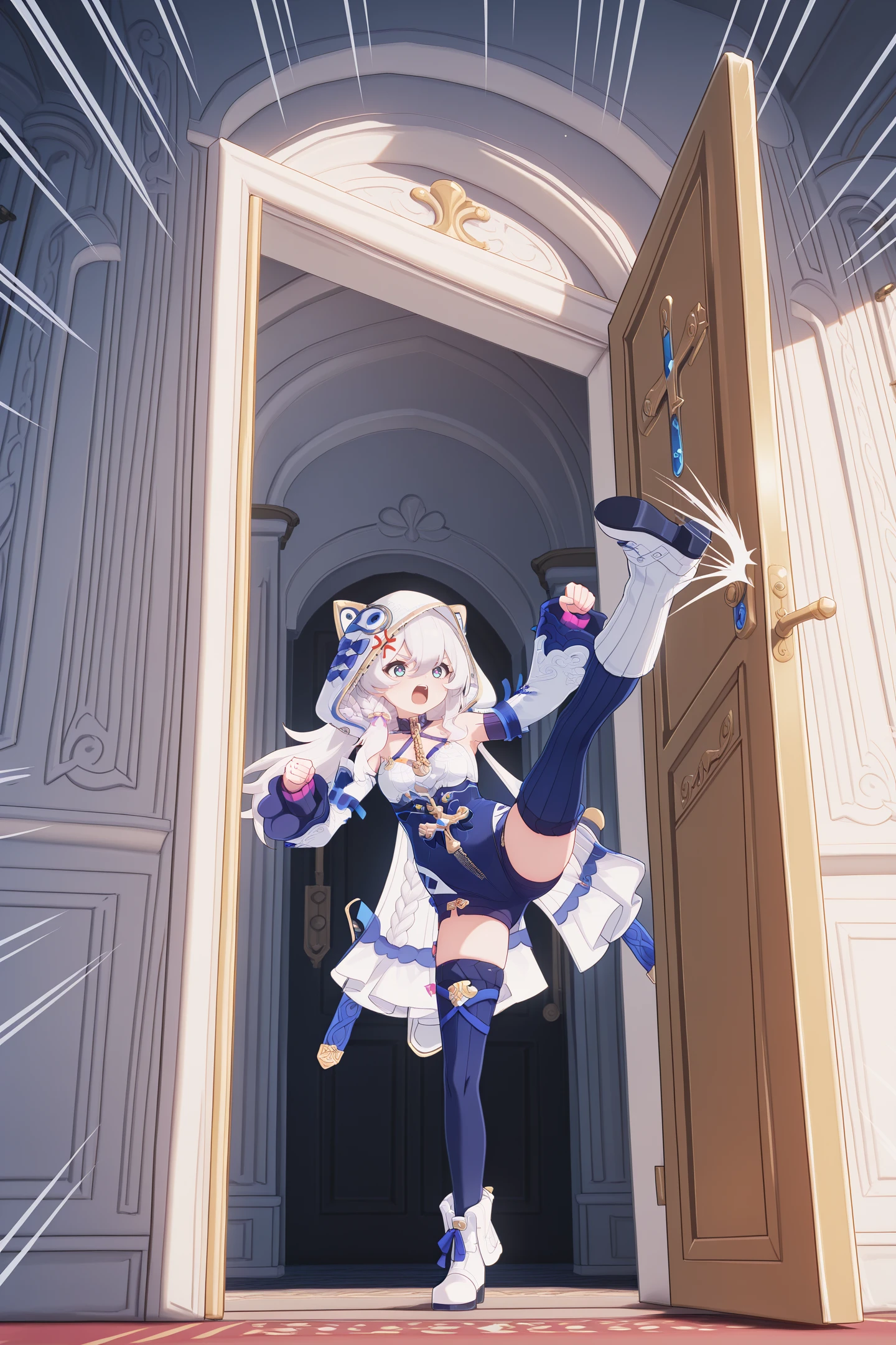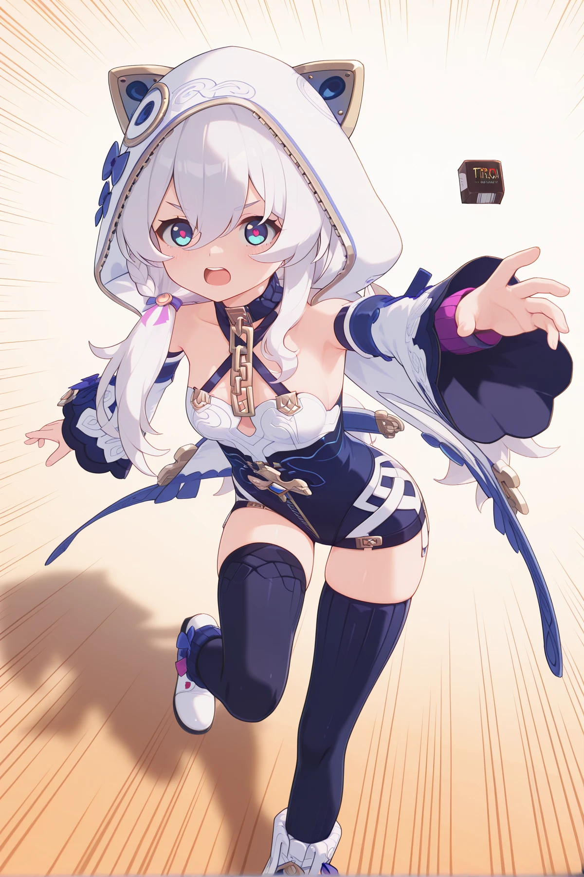 theresa apocalypse \(schicksal's imperative\), white hair, long hair, twintails, braid, asymmetrical sidelocks, hair bow, blue eyes, cat hood, white hood, hood up, criss-cross halter, gold chain, dress, tight clothes, detached sleeves, white sleeves, blue thighhighs, ribbed thighhighs, asymmetrical legwear, white footwear, bootsDescription
