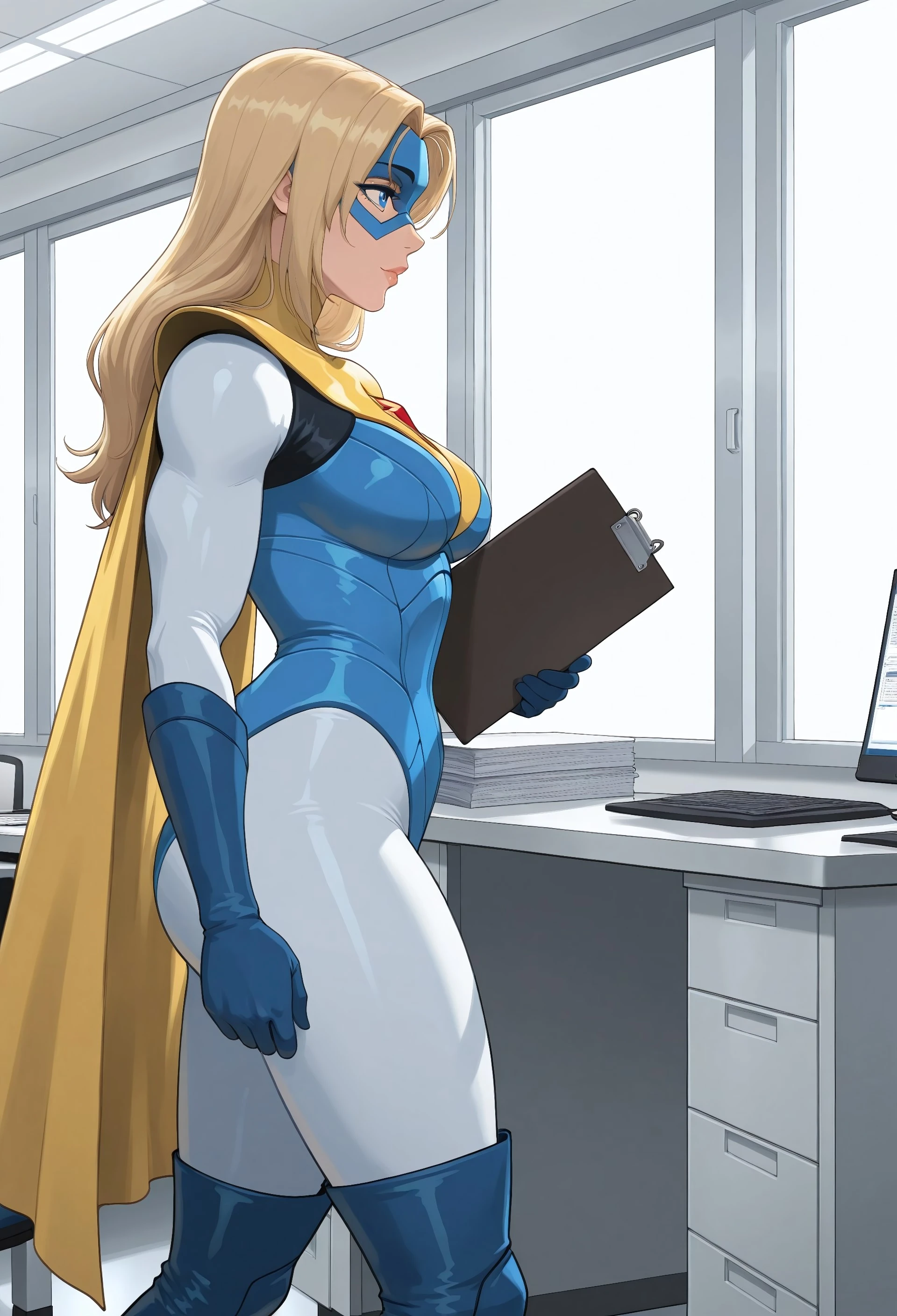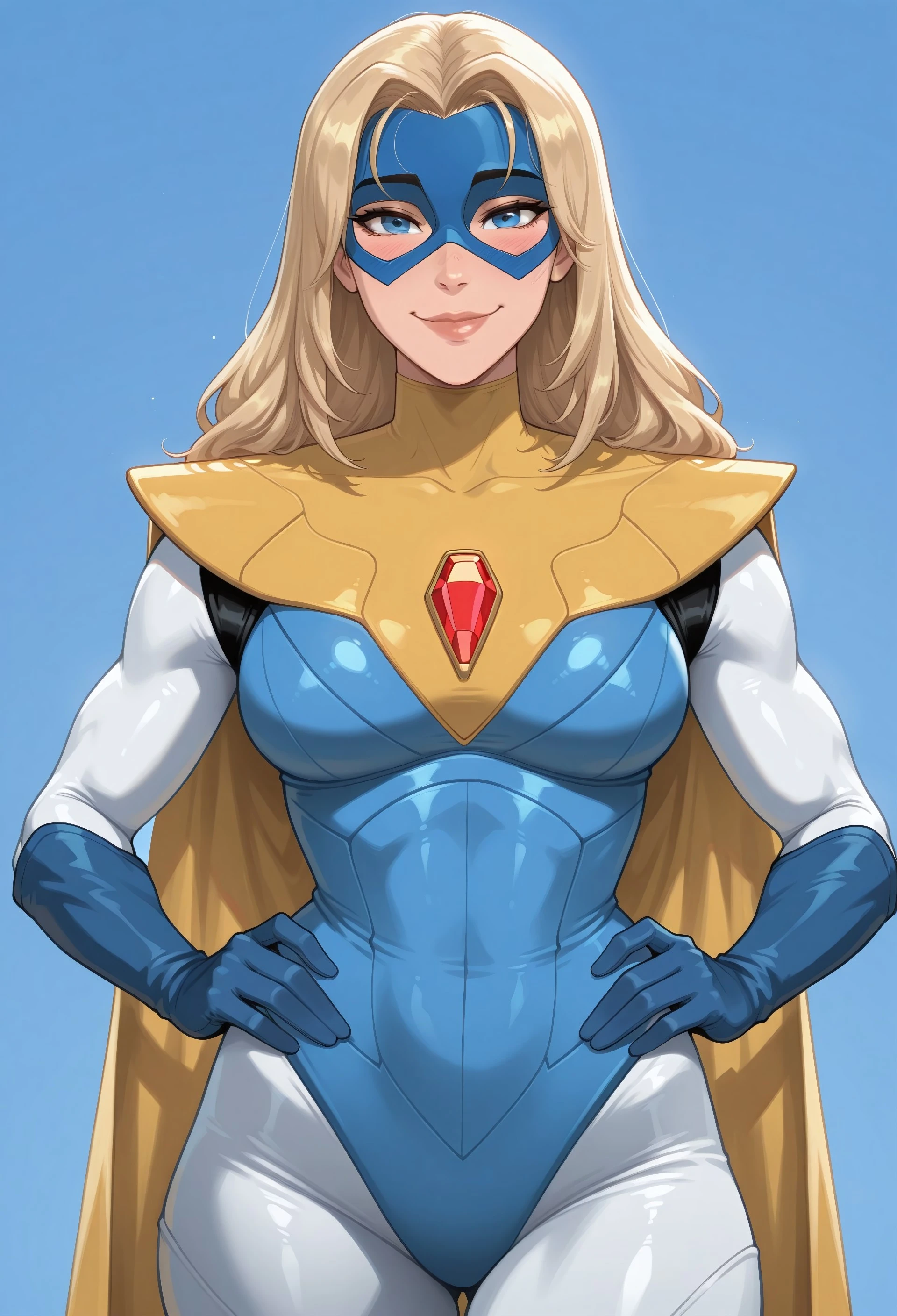 ma1n_bl0nd3_b1az3r, 1girl, solo, blonde hair, long hair, blue eyes, lips, large breasts, superhero, blue mask, domino mask, multicolored bodysuit, white bodysuit, blue bodysuit, yellow bodysuit, red gemstone, yellow cape, blue gloves, elbow gloves, blue boots, tight boots