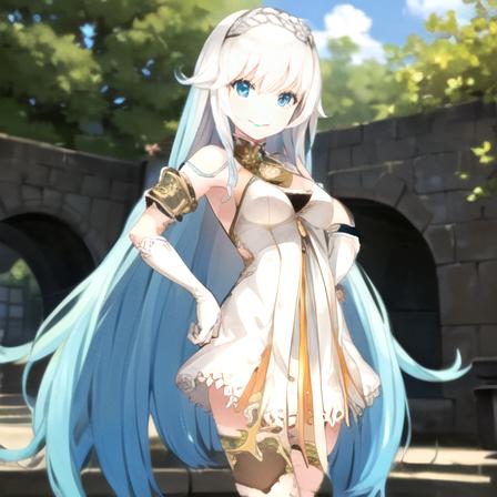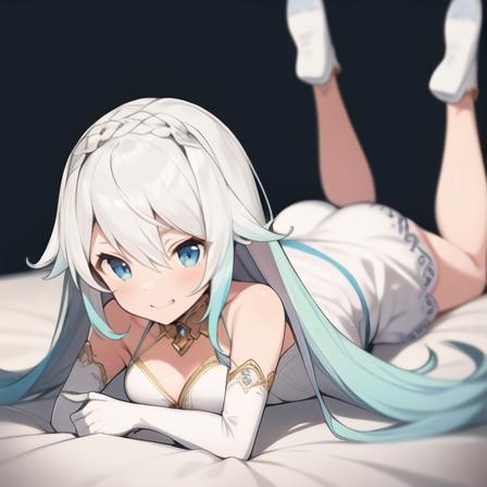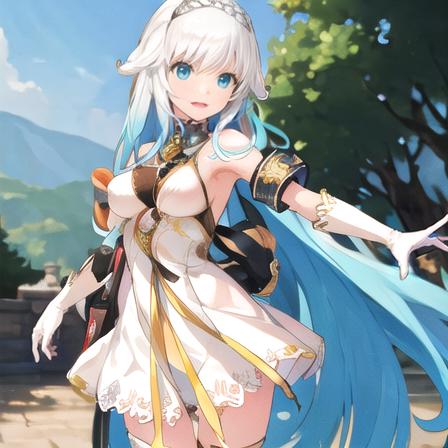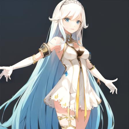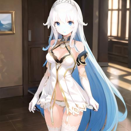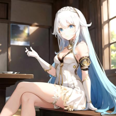 1. 1girl, Airi, multicolored hair, white hair, blue hair, very long hair, bare shoulders, gloves, braid, elbow gloves, white dress, thighs