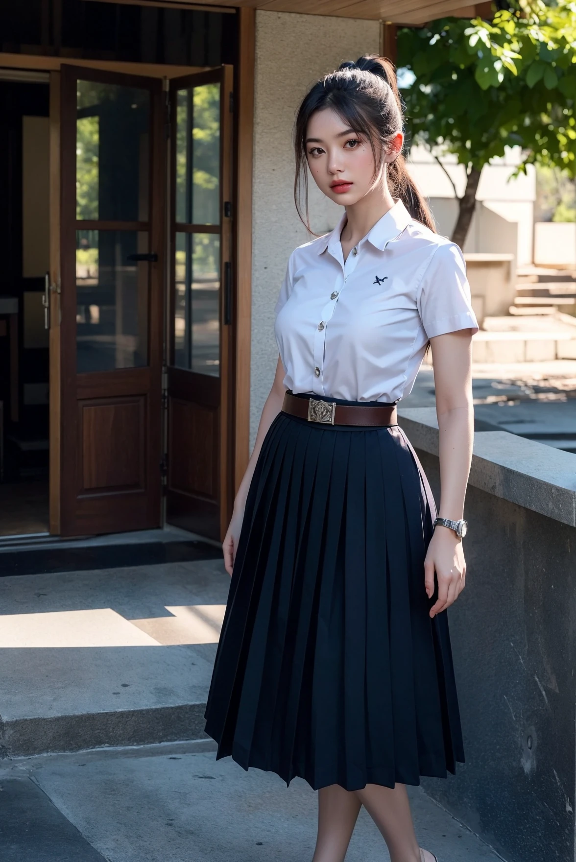 -Word: White shirt short sleeves, Black pleated skirt,Black pencil skirt, Belt