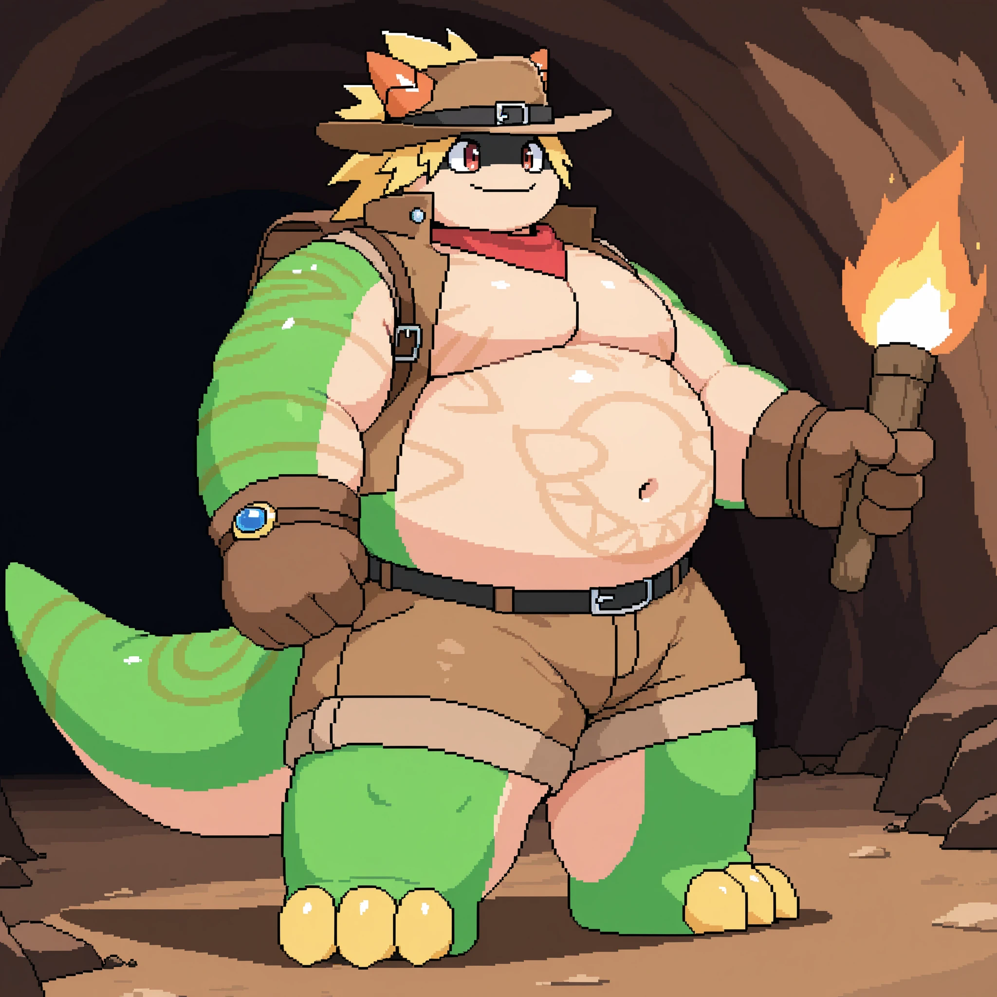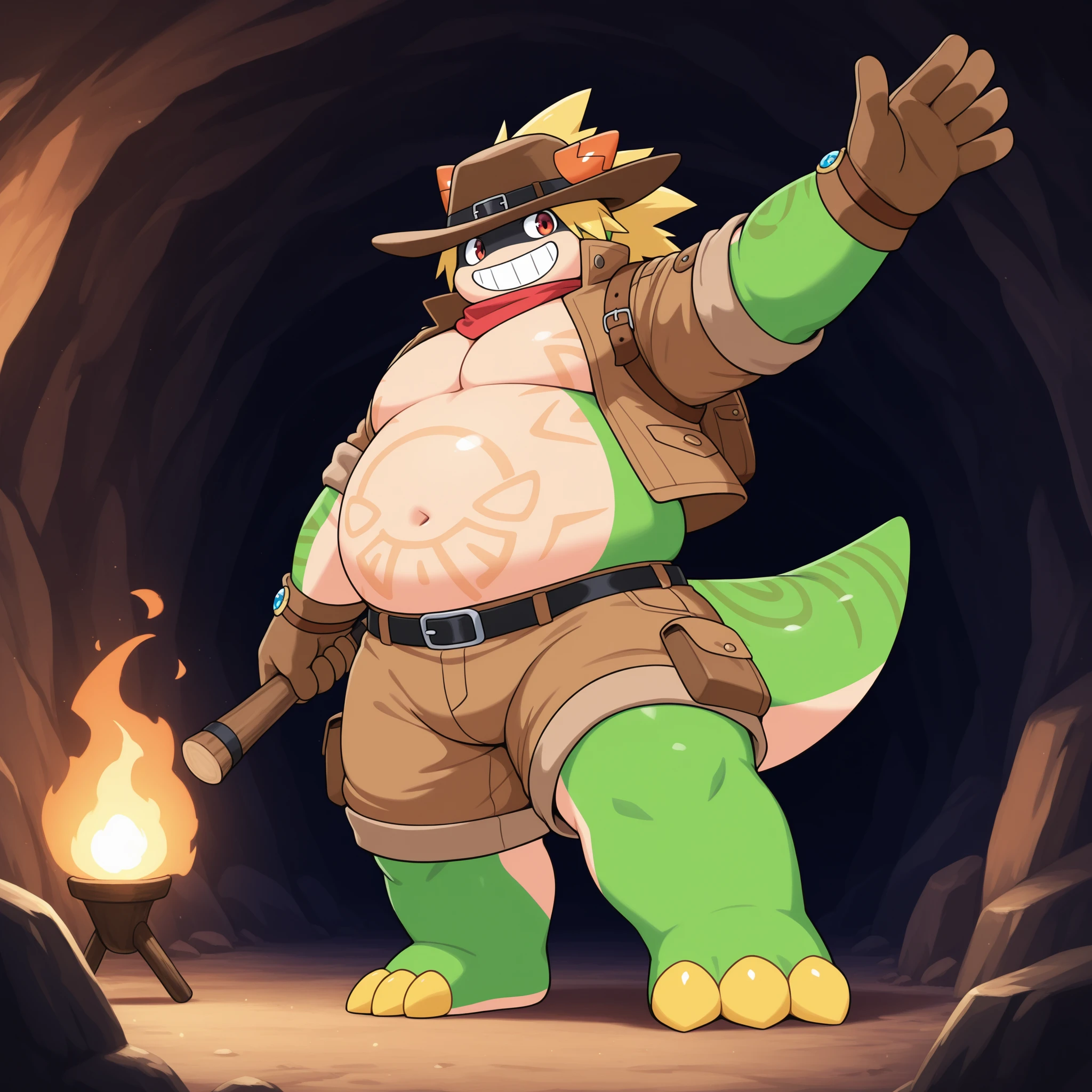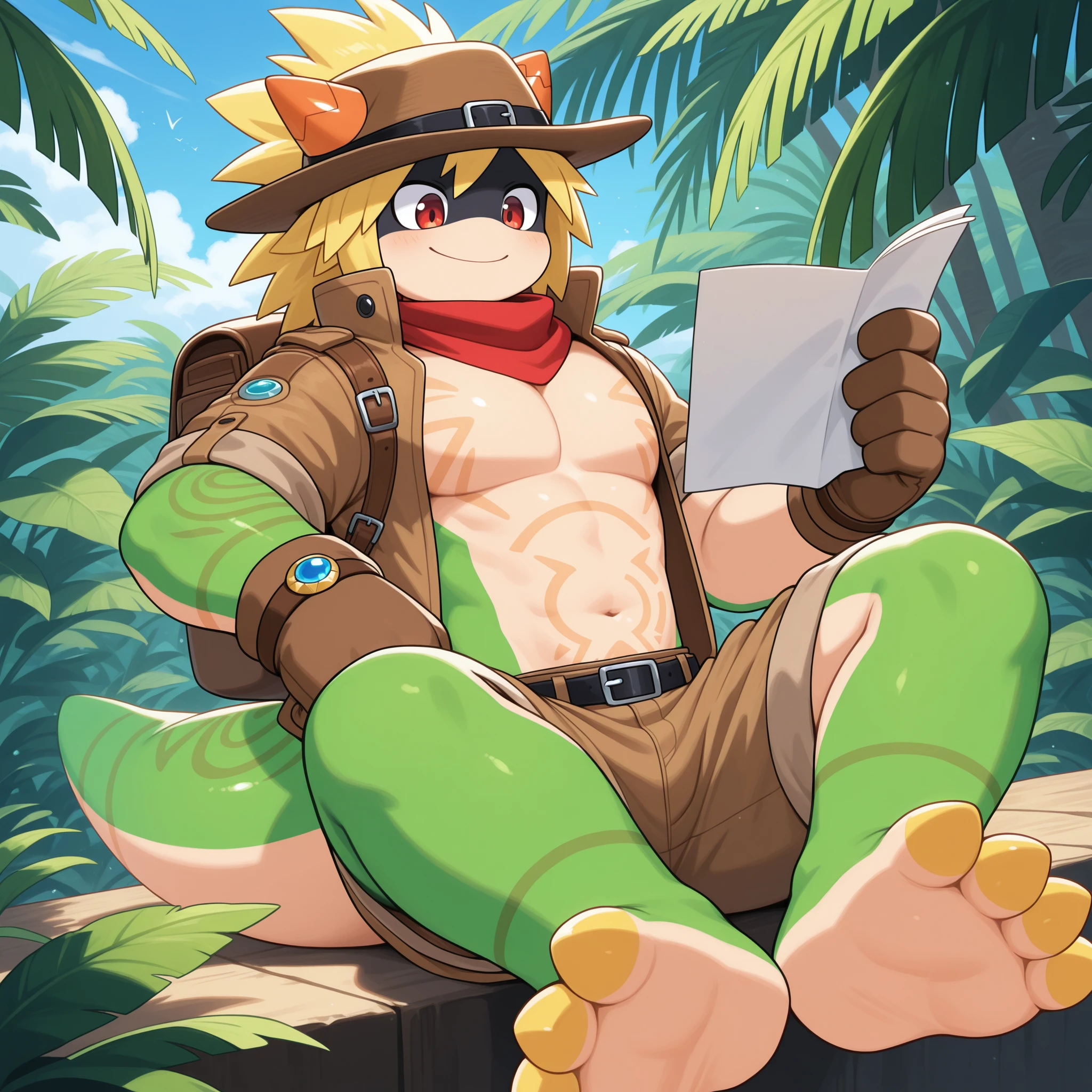 Explorer Outfit: munchth, munch (tribal hunter), reptile boy, furry male, official alternate costume, two-tone skin, green skin, tan skin, spiked hair, medium hair, blonde hair, orange horns, red eyes, no nose, no nipples, tail, yellow feet claws, stomach tattoo, arm tattoo, tail tattoo, leg tattoo, black mask, half mask, horns through headwear, brown slouch hat, black hat belt, bandana around neck, red bandana, brown backpack, high collar, open jacket, brown jacket, sleeves rolled up, black belt, brown gloves, brown wristband, wristband jewel, brown cargo shorts, shorts rolled up