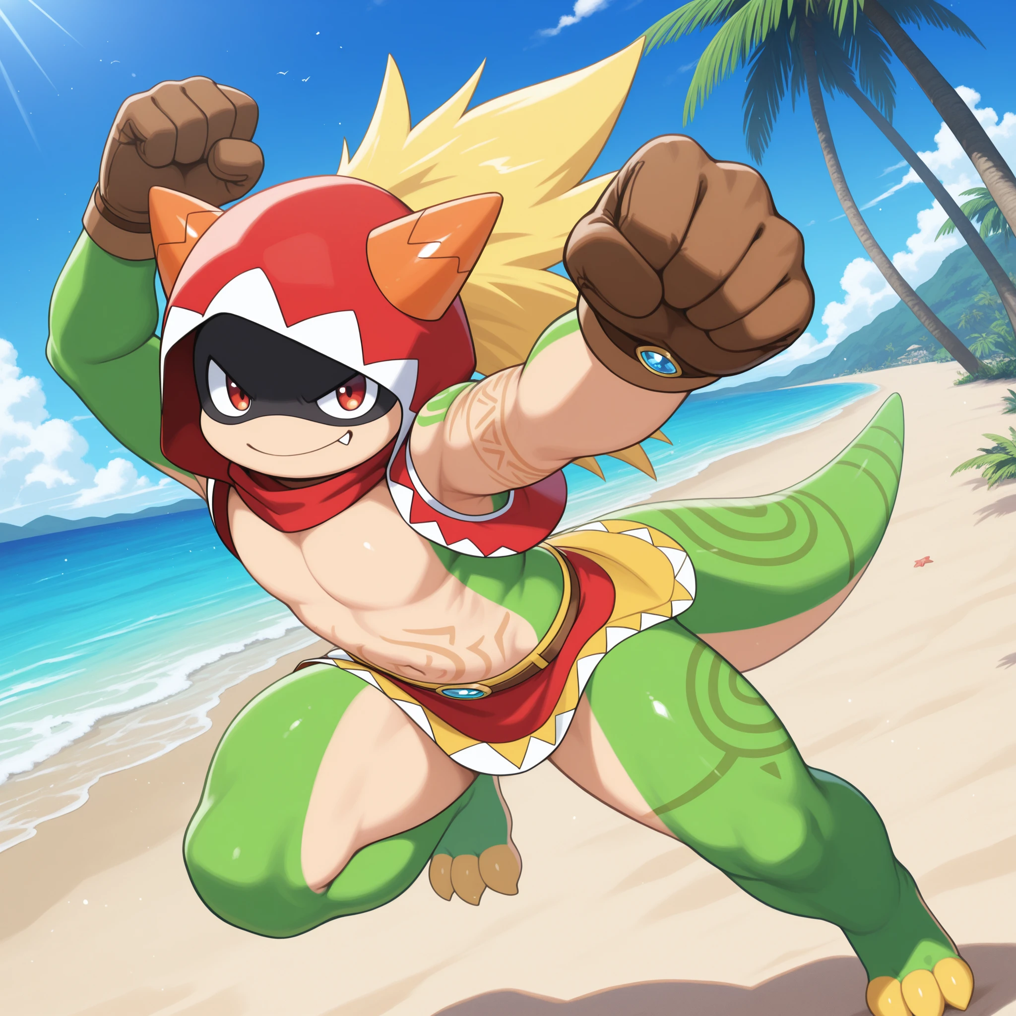 Regular Outfit: munchth, munch (tribal hunter), reptile boy, furry male, two-tone skin, green skin, tan skin, spiked hair, long hair, blonde hair, orange horns, red eyes, no nose, no nipples, tail, yellow feet claws, stomach tattoo, arm tattoo, tail tattoo, leg tattoo, black mask, half mask, horns through hood, open vest, hooded vest, two-tone vest, red vest, white vest, brown gloves, brown wristband, wristband jewel, multicolored skirt, red skirt, white skirt, yellow skirt