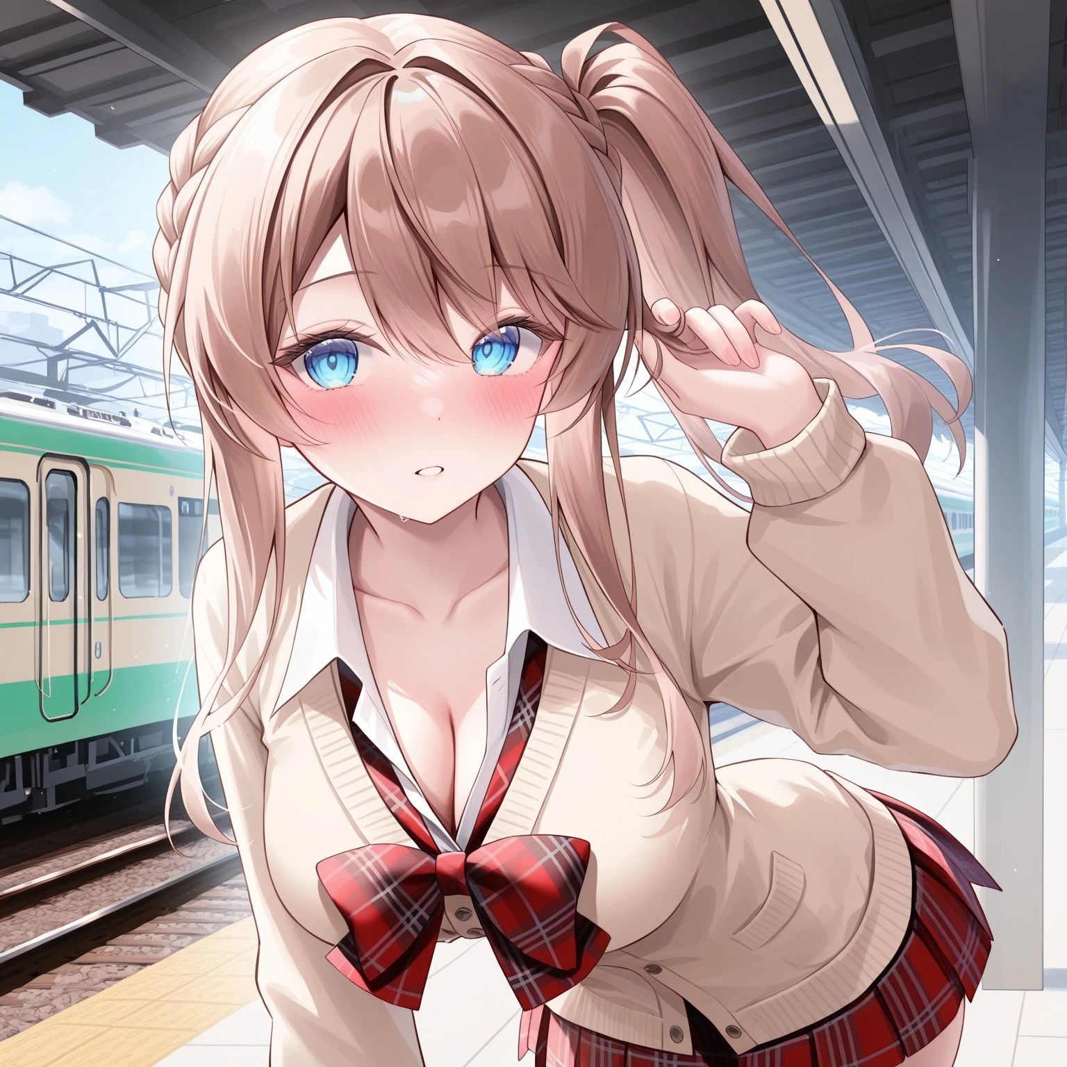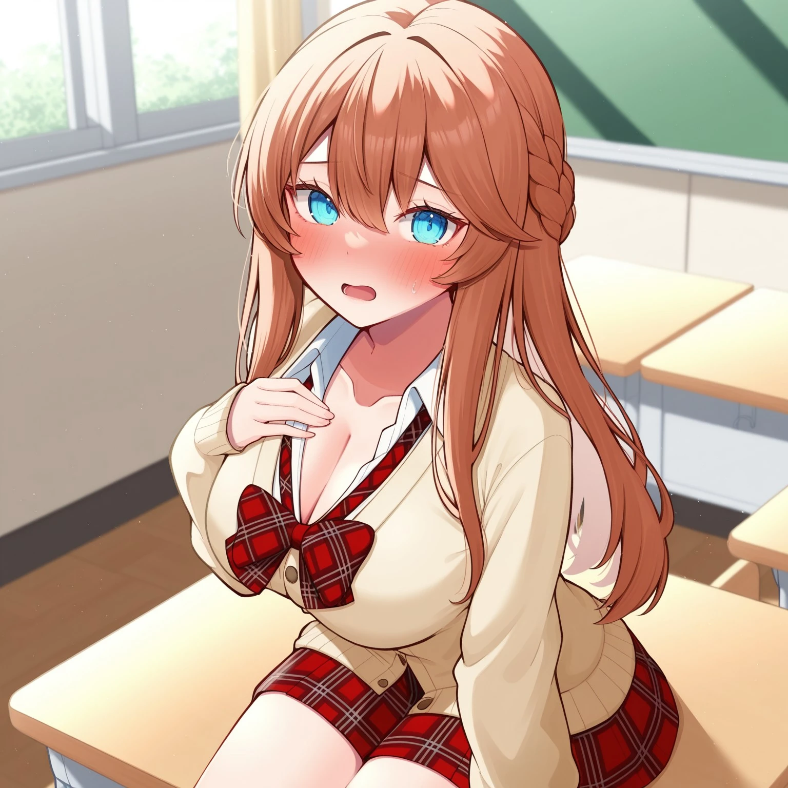 outfit: nanasch, red skirt, school uniform, bowtie, plaid skirt, cleavage, cardigan, collarbone, white shirt, collared shirt, plaid bowtie, shirt, skirt, brown cardigan, long sleeves, kneehighs