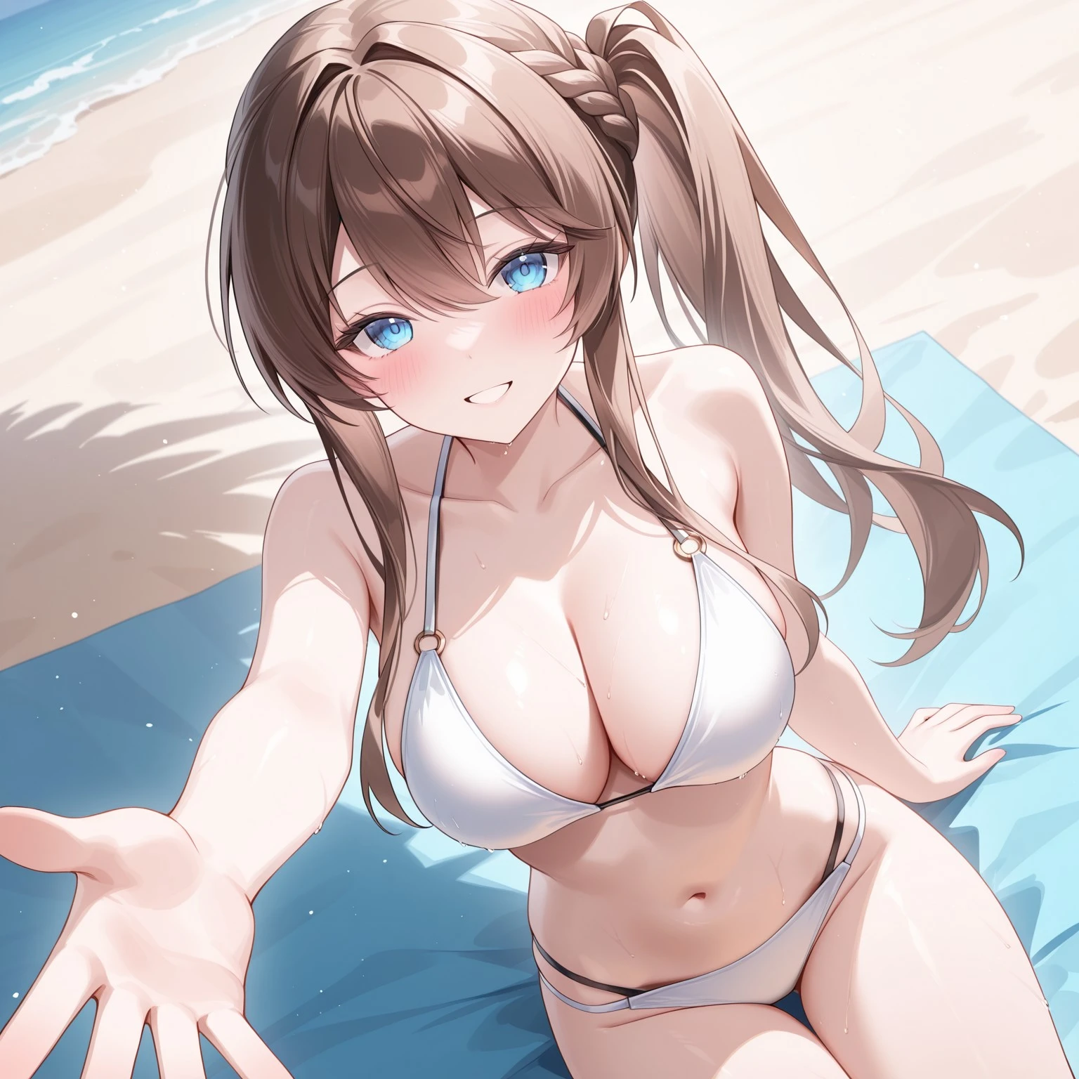 color: nanaill, 1girl, hair between eyes, blue eyes, brown hair, large breasts, long hair