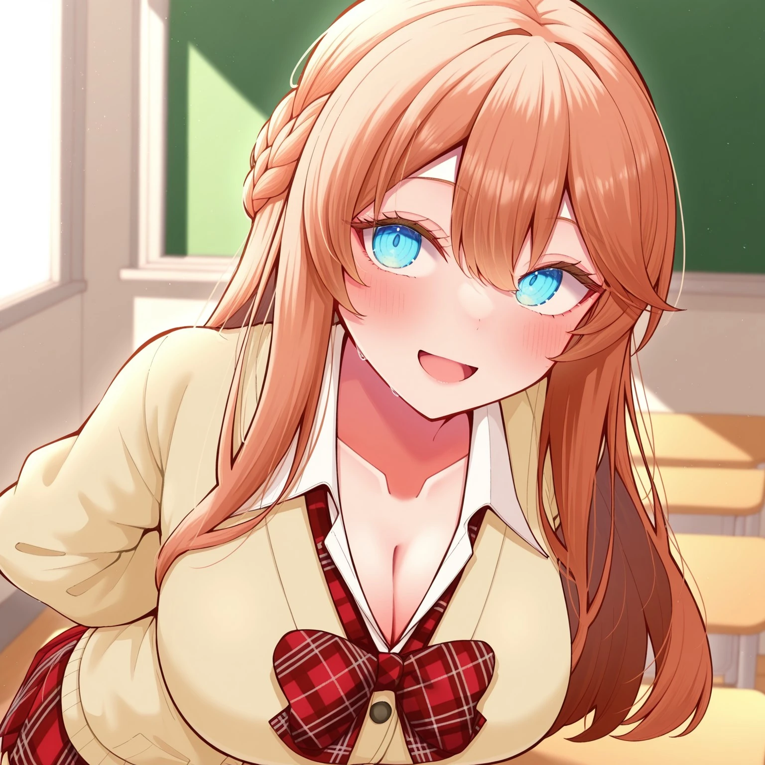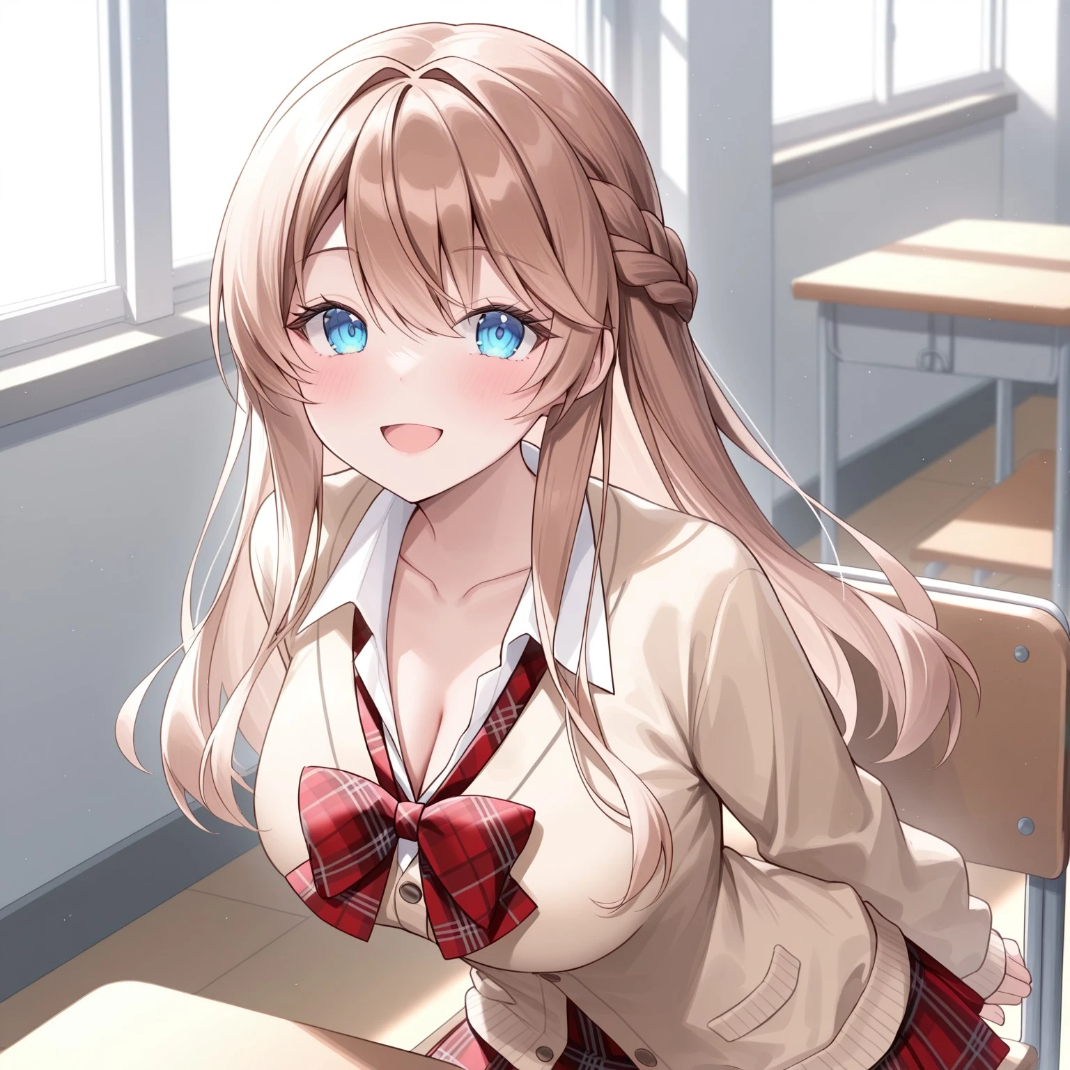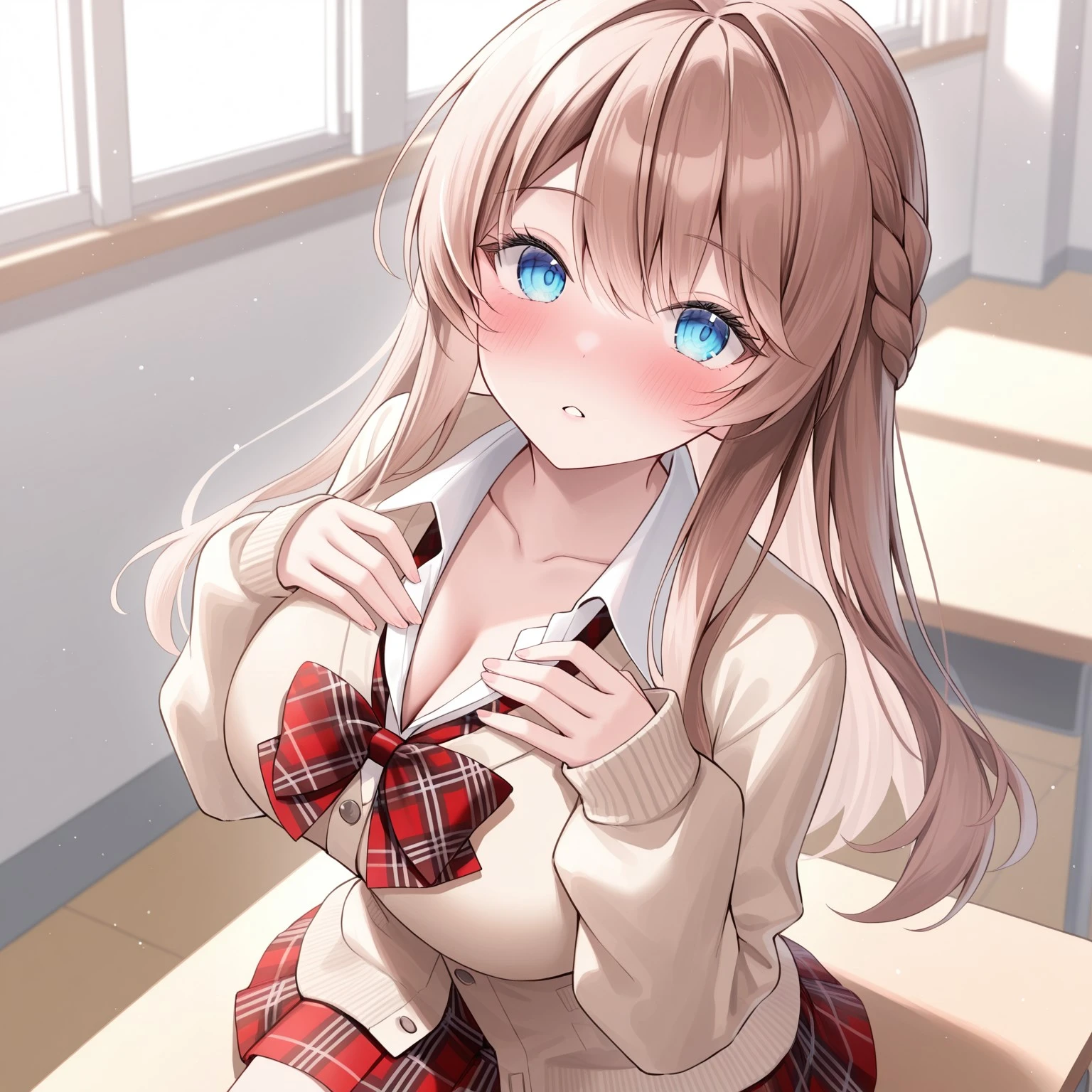 outfit: nanasch, school uniform, bowtie, plaid skirt, cleavage, cardigan, collarbone, white shirt, collared shirt, plaid bowtie, shirt, skirt, long sleeves, kneehighs