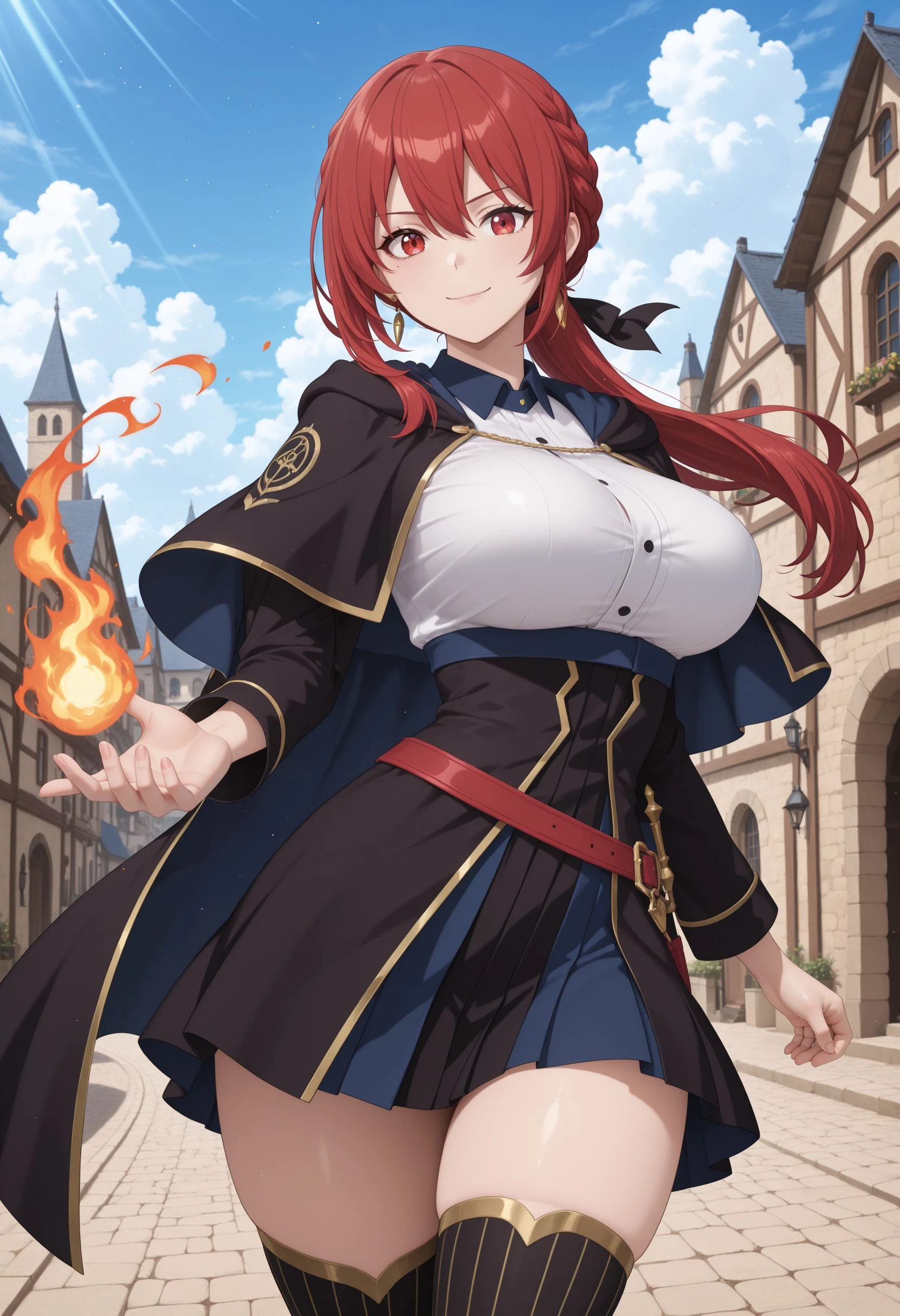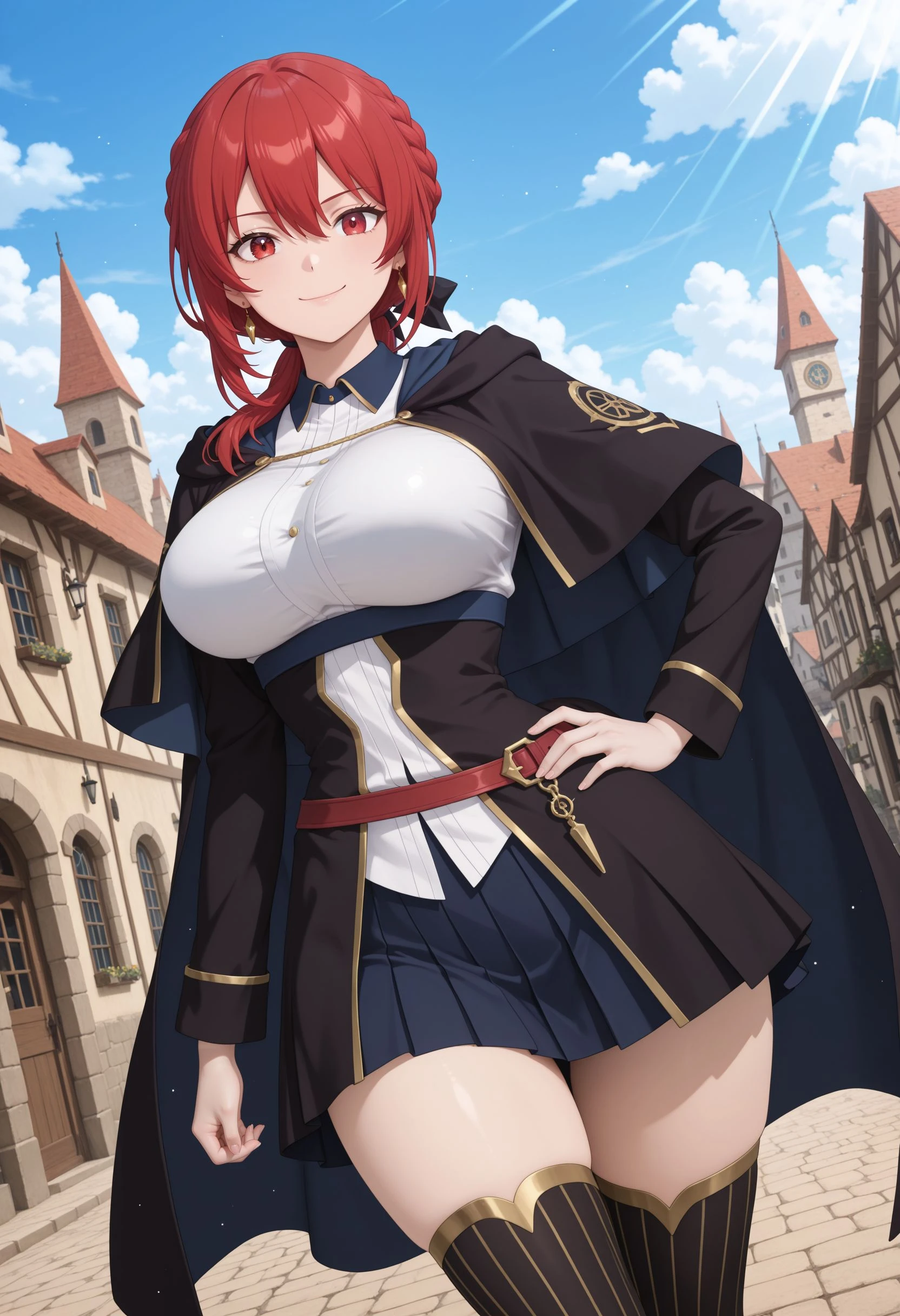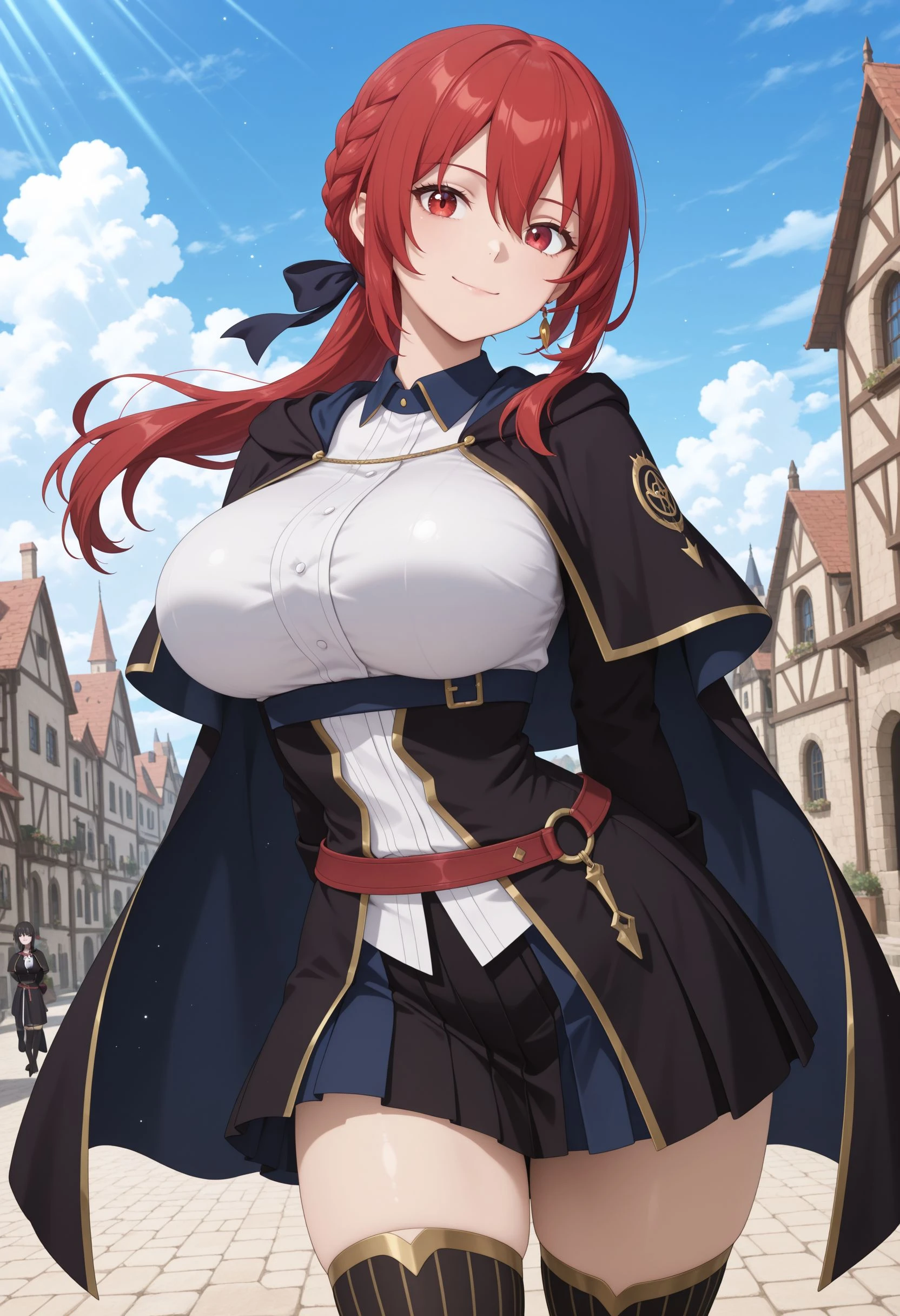 Main Prompt: 1girl, solo, curvy, long hair, red hair, hair between eyes, sidelocks, braid, low ponytail, black hair ribbon, gold earrings, red eyes, large breasts, narrow waist,