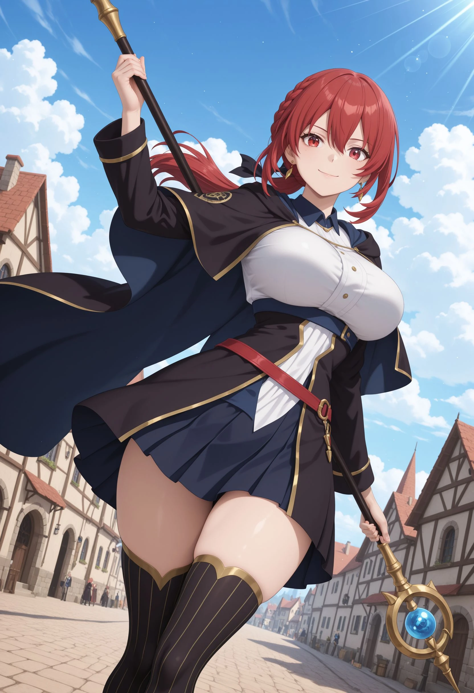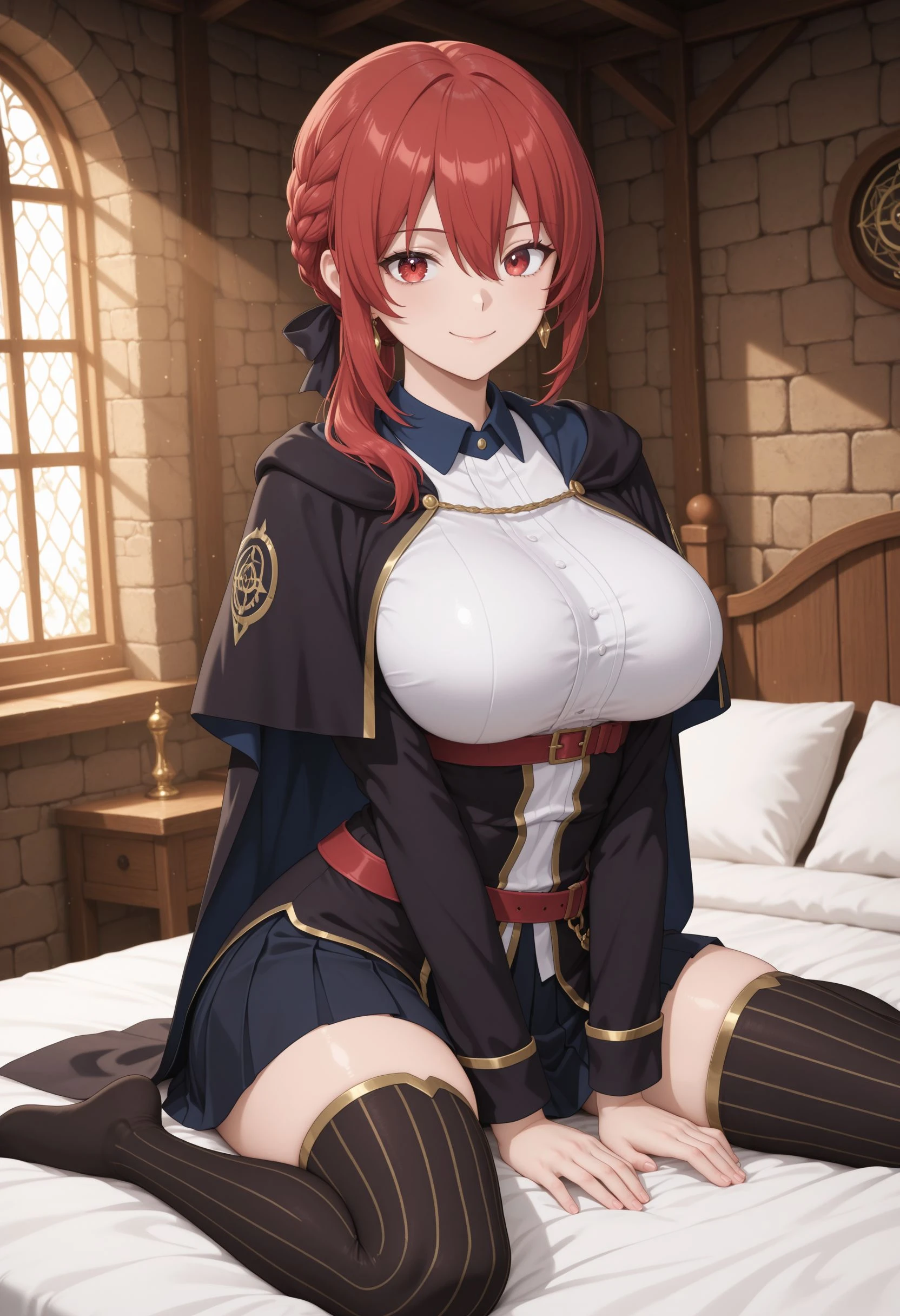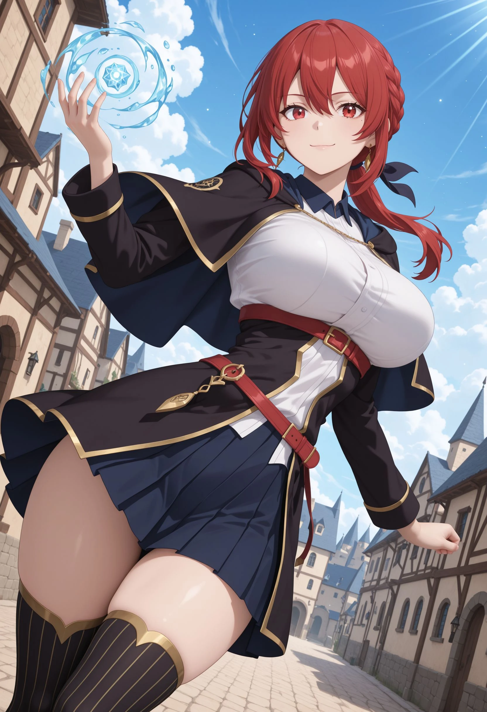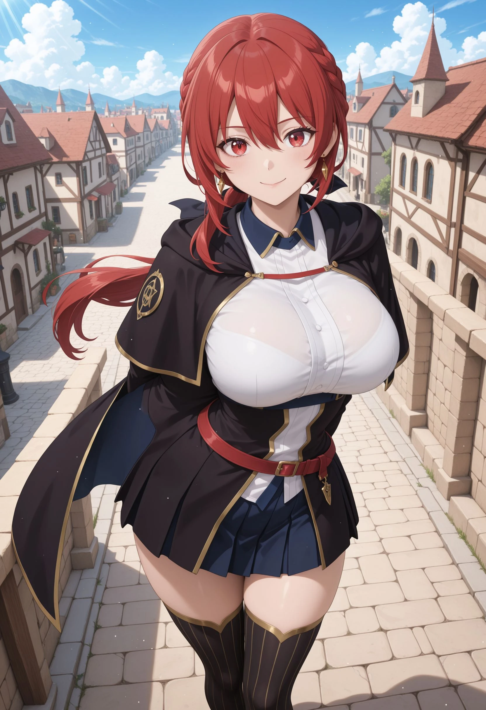 Main Prompt: 1girl, solo, curvy, long hair, red hair, hair between eyes, sidelocks, braid, low ponytail, black hair ribbon, gold earrings, red eyes, large breasts, narrow waist,
