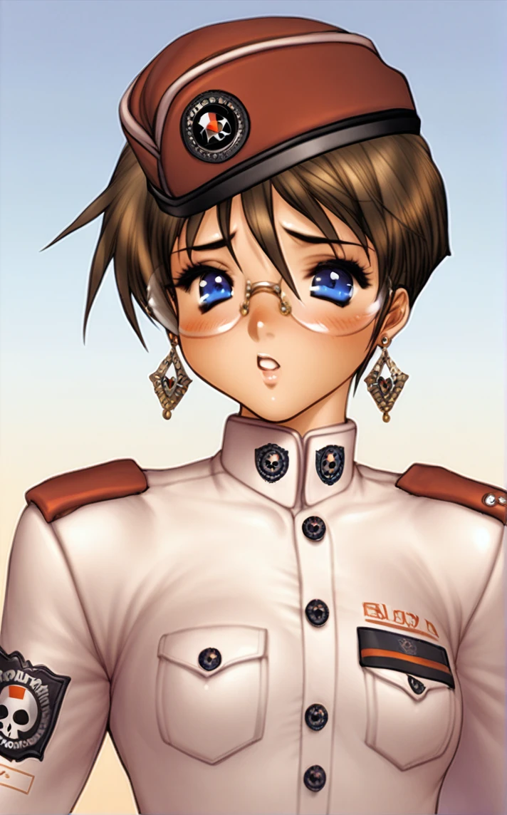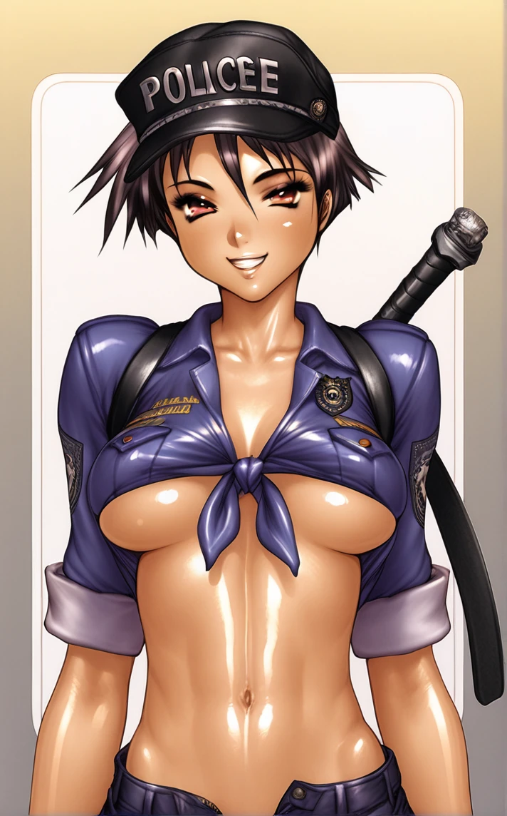 PONYXL_STYLE_ShirouMasamune_ownwaifu, 1girl, breasts, fingerless gloves, gloves, hat, navel, police, police uniform, policewoman, shirt, solo, tied shirt, uniform, smile, large breasts, brown hair, black hair, red eyes, medium breasts, underwear, midriff, shiny, shiny skin, lingerie, front-tie top, unzipped, short hair, brown eyes, underboob, looking at viewer, weapon, naughty face