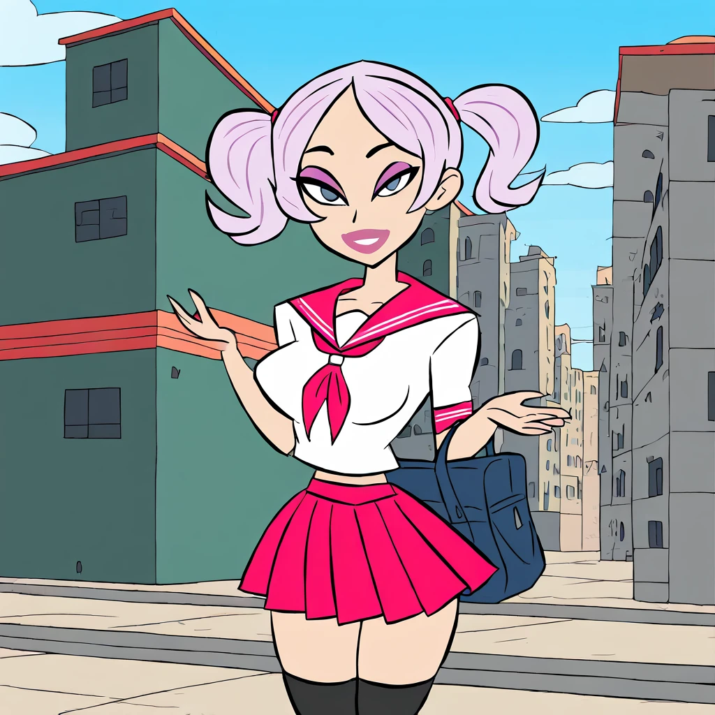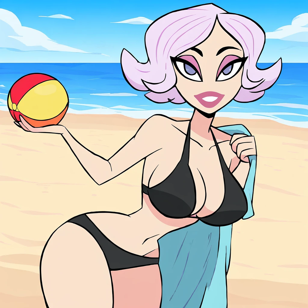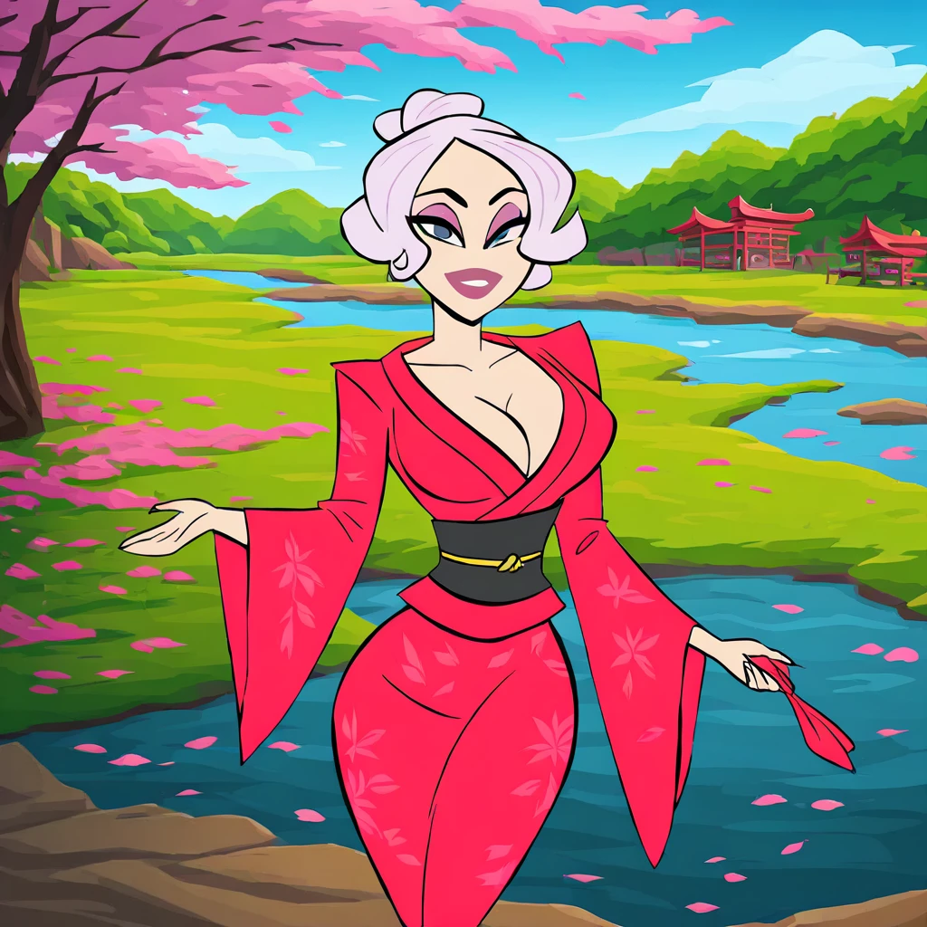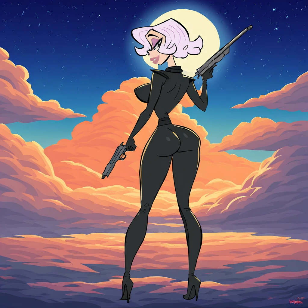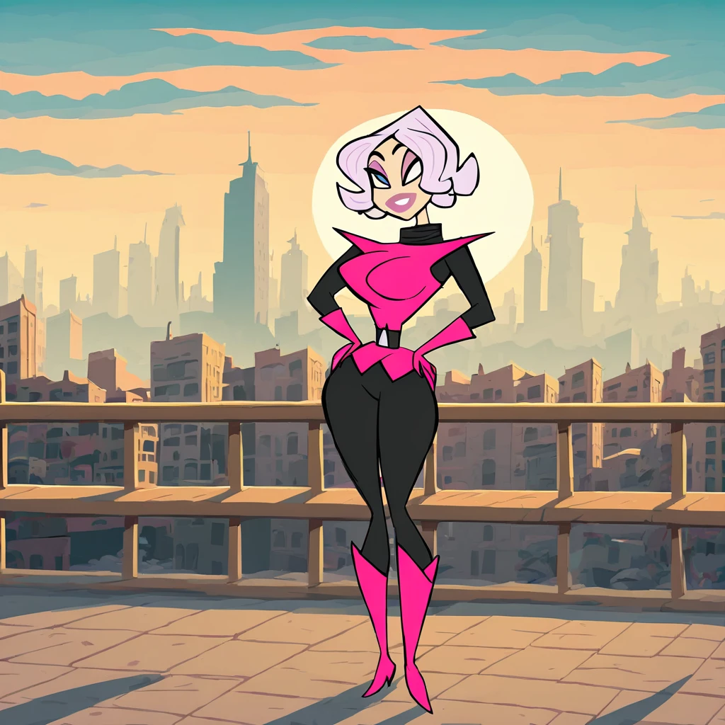 1girl, short hair, pink hair, pink sleeveless shirt, black long sleeves, black pants, pink gloves, pink boots, black belt, lipstick, mole, large breasts, narrow waist, wide hips,
