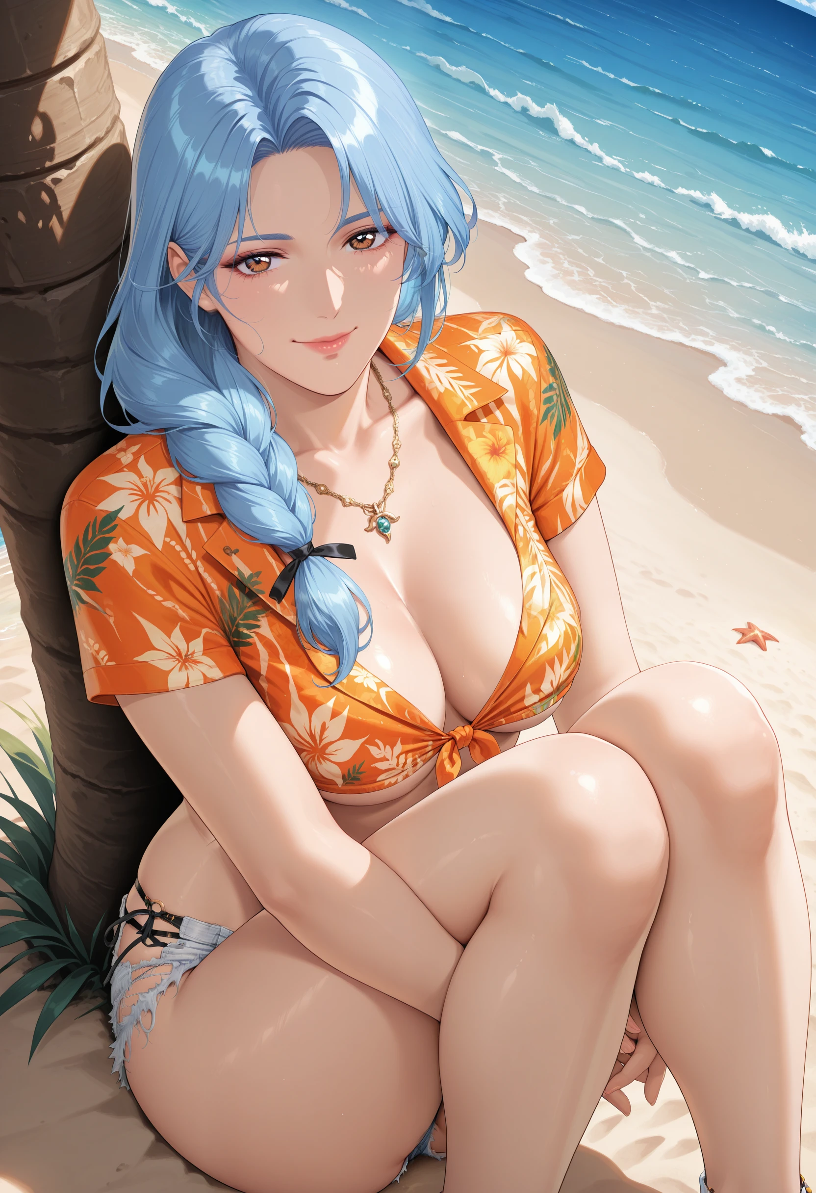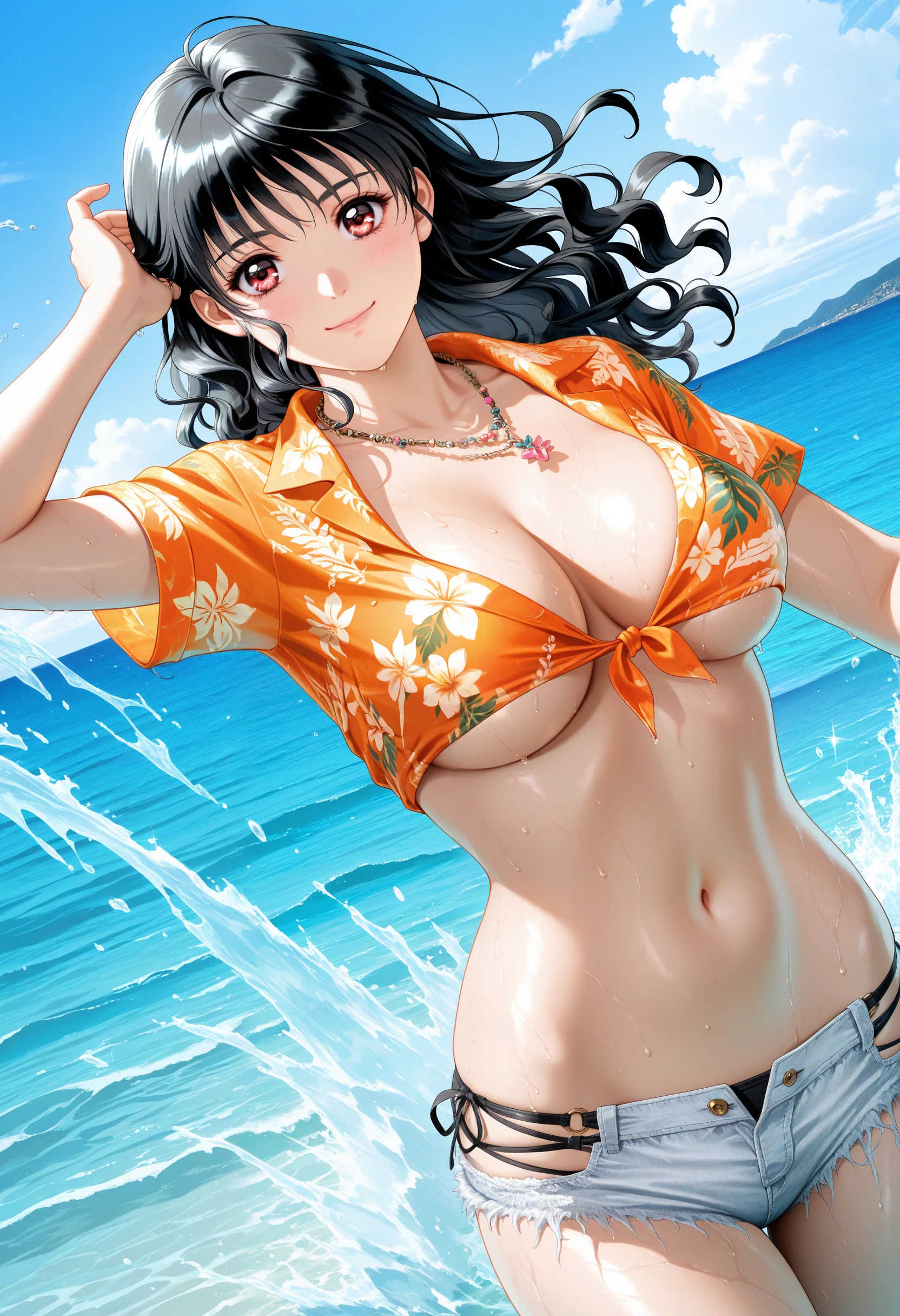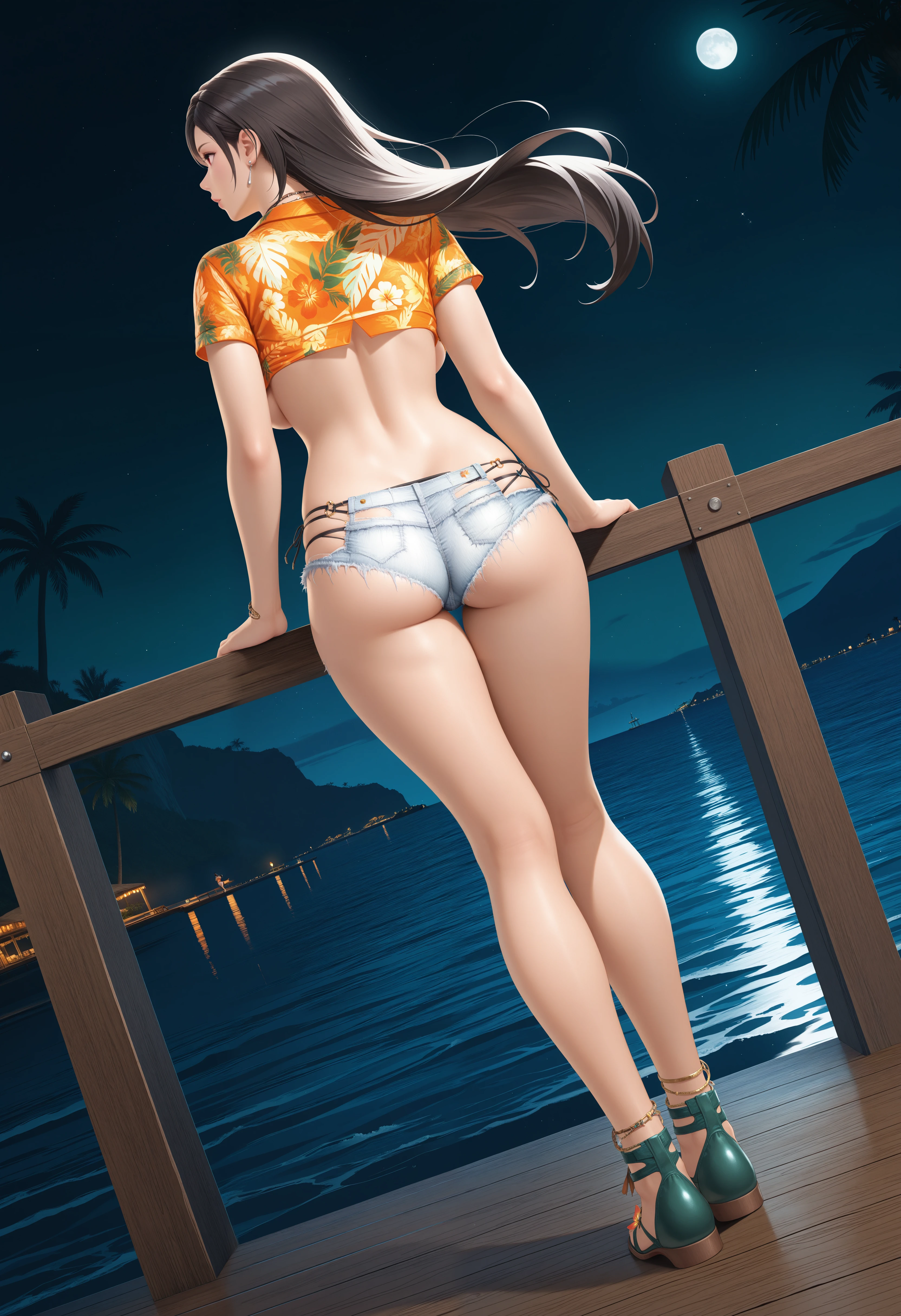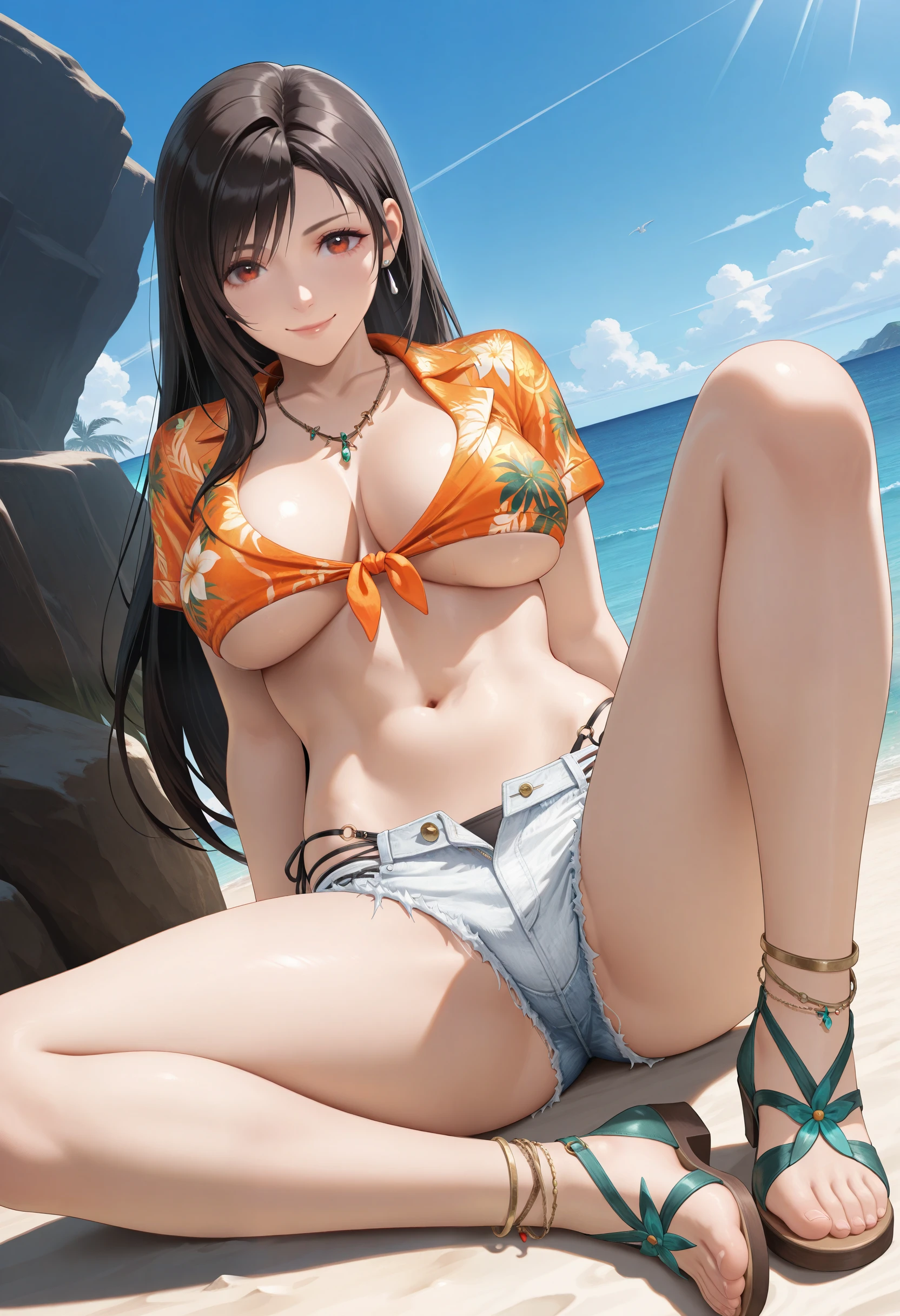基本プロンプト:"LocoMocoVacation_doaxvv,necklace,jewelry,hawaiian shirt,orange shirt,cutoffs,median furrow,front-tie top,underboob,micro shorts,white denim shorts,underwear black panties,anklet,strappy heels,green footwear,flower sandals".