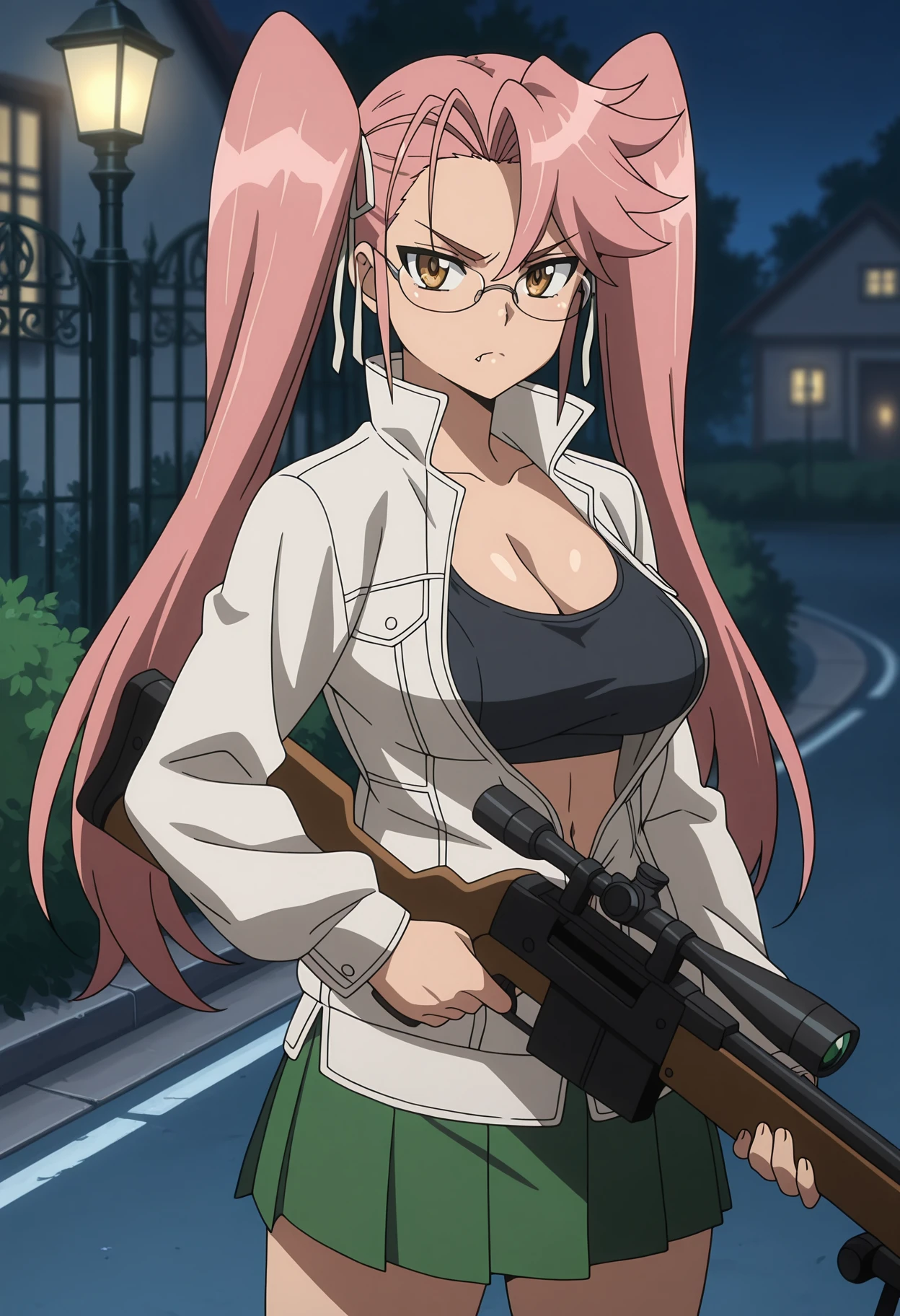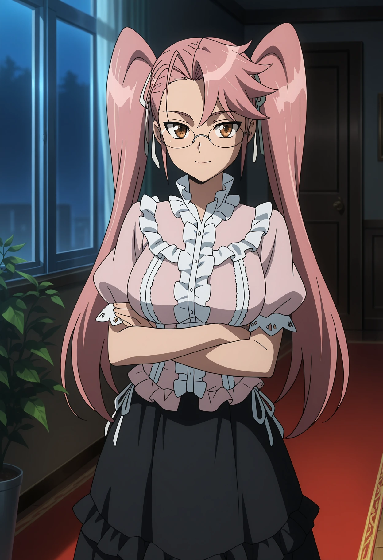 twintails, asymmetrical bangs, long hair, pink hair, brown eyes, hair ribbon, white ribbon, glasses