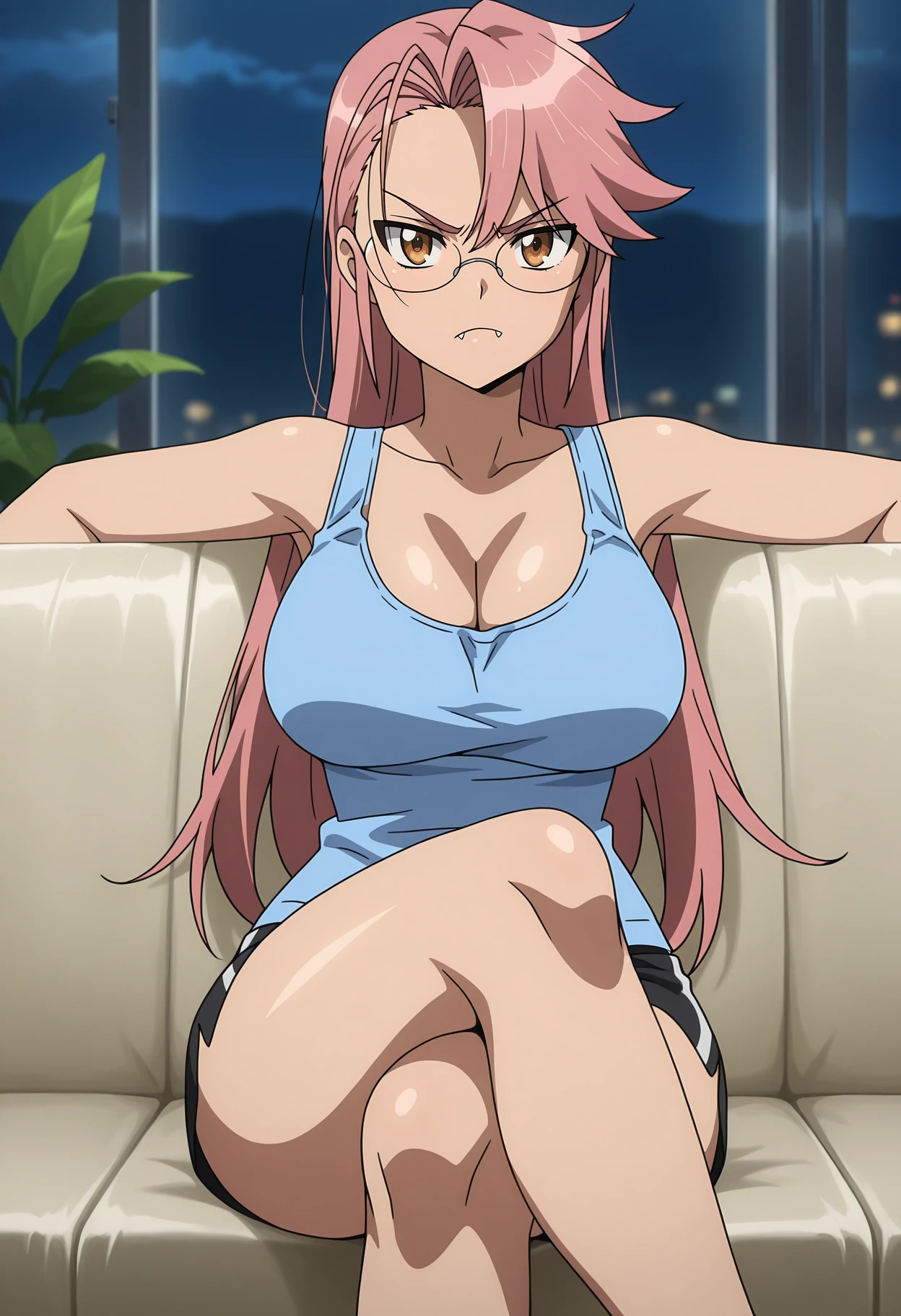 hair down, asymmetrical bangs, long hair, pink hair, brown eyes, glasses