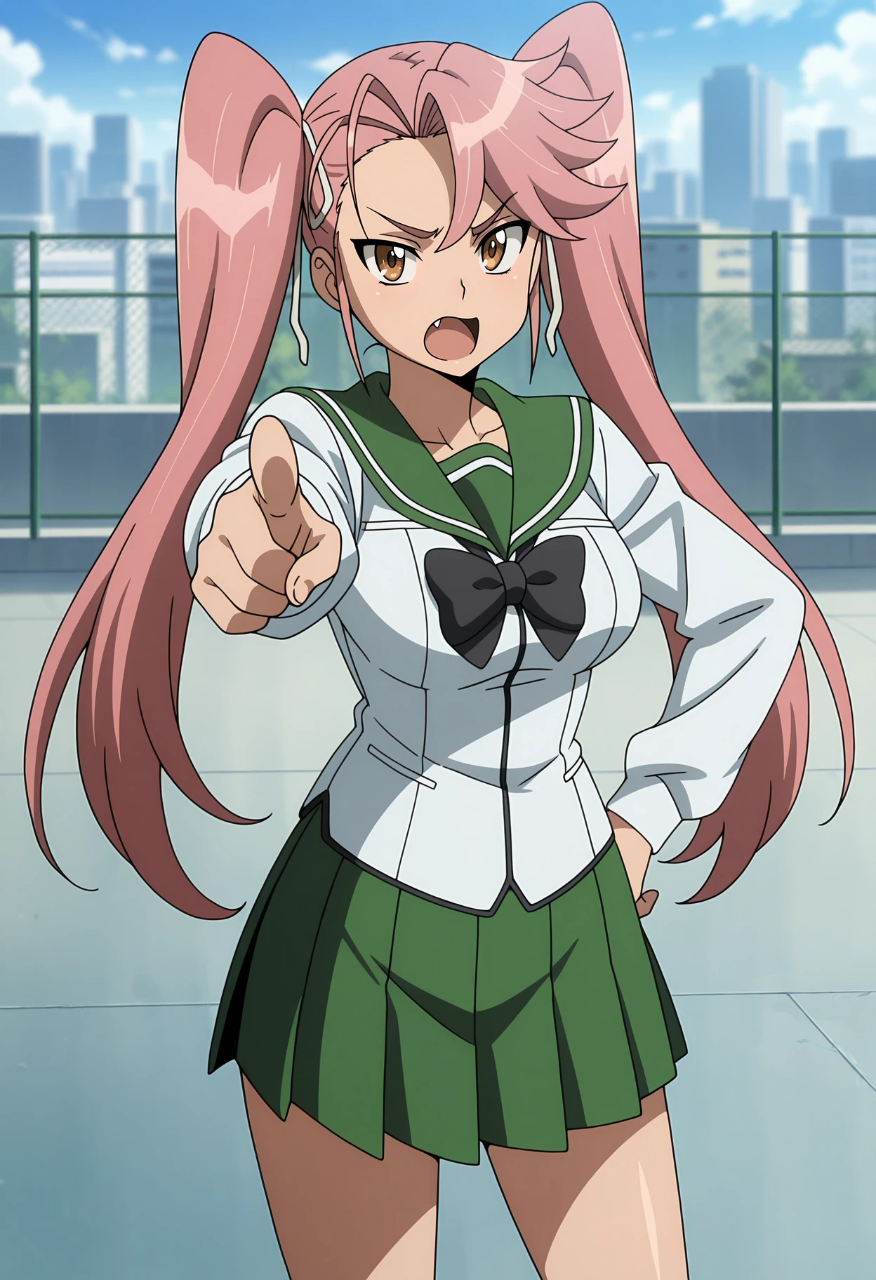 green sailor collar, open shirt, white shirt, long sleeves, lingerie, bow bra, pink bow, pink bra, pink camisole, cleavage, large breasts, pleated skirt, green skirt
