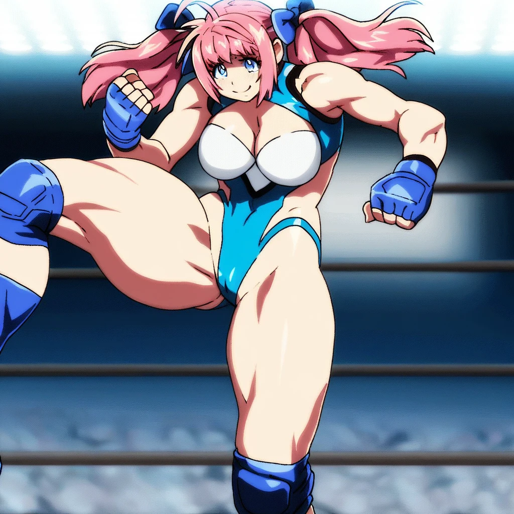 Wrestling Outfit, Blue & White Leotard, Cleavage, Cleavage Cutout, Clothing Cutout, Blue Gloves, Fingerless Gloves, Blue Thighhighs, Blue Knee Pads, Blue Thigh Boots
