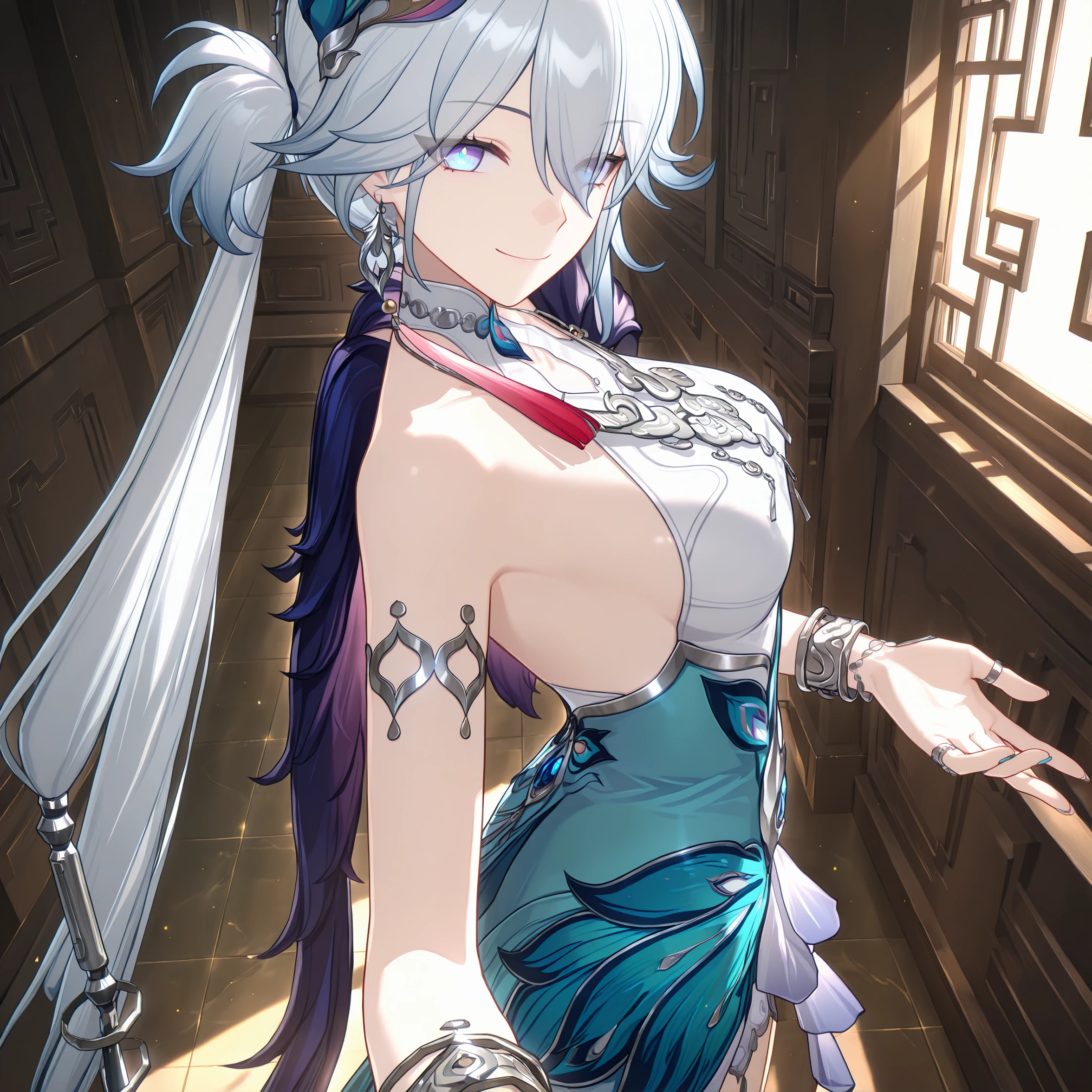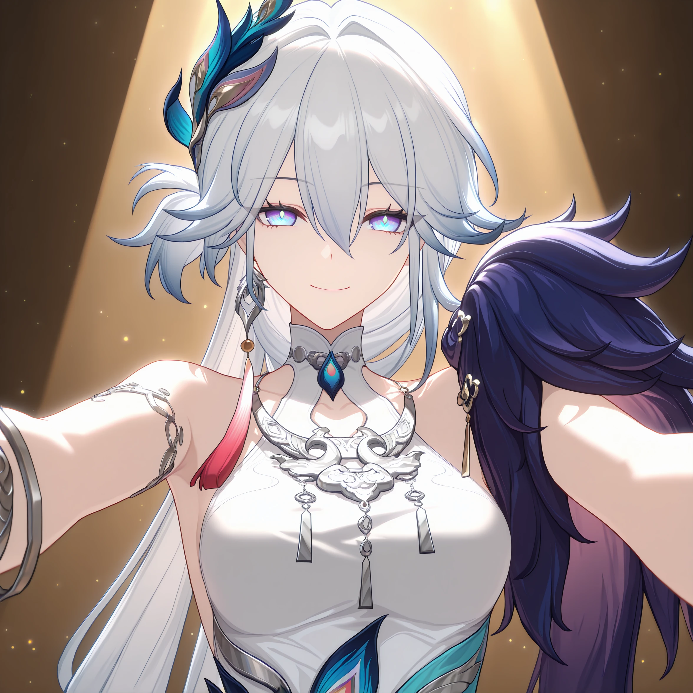 masterpiece, best quality, very aesthetic, newest, hires, Yaoguang, 1girl, solo, looking at viewer, medium breasts, hair ornament, bracelet, dress, smile, upper body, romantic, love, detailed light, spotlight, simple background,全身prompt: