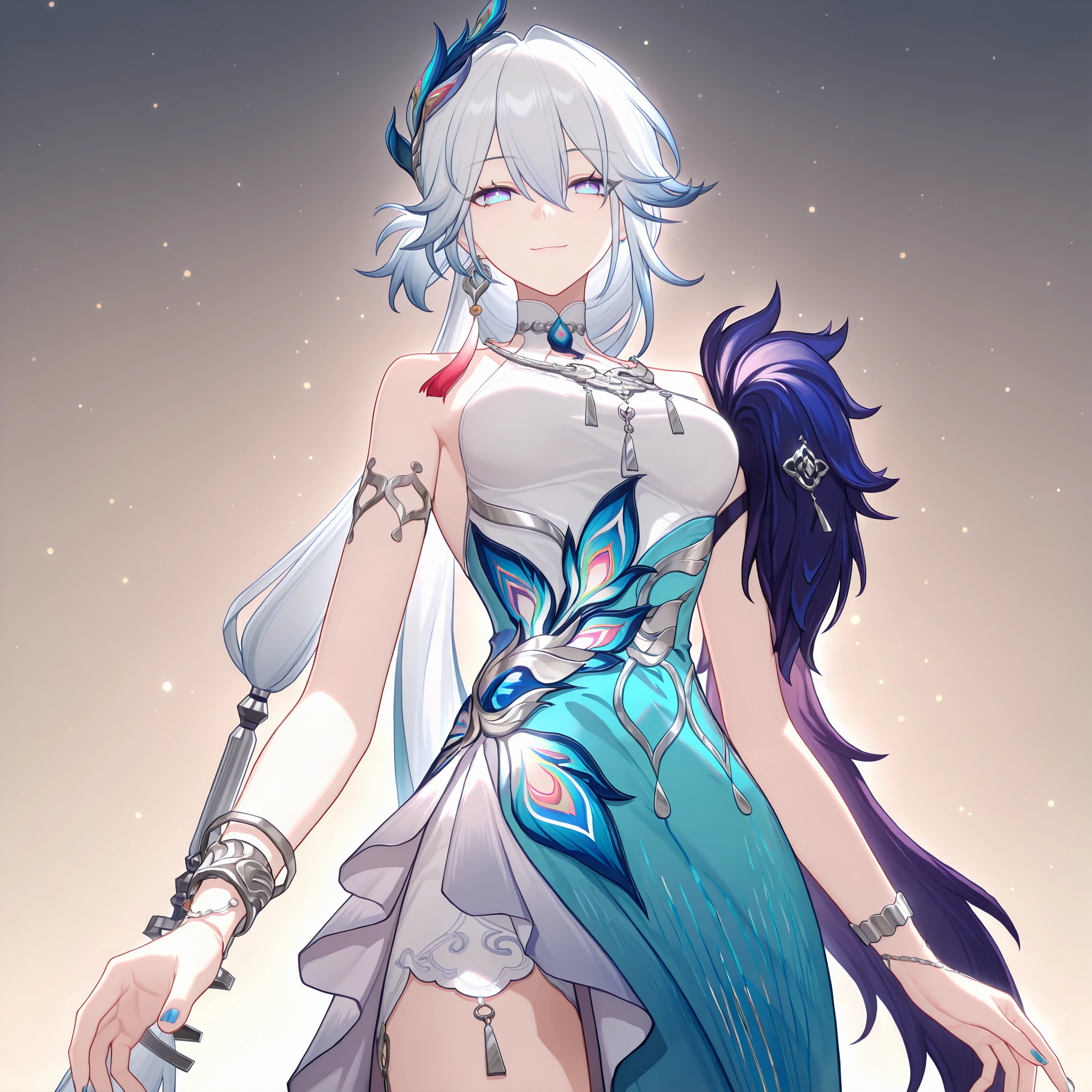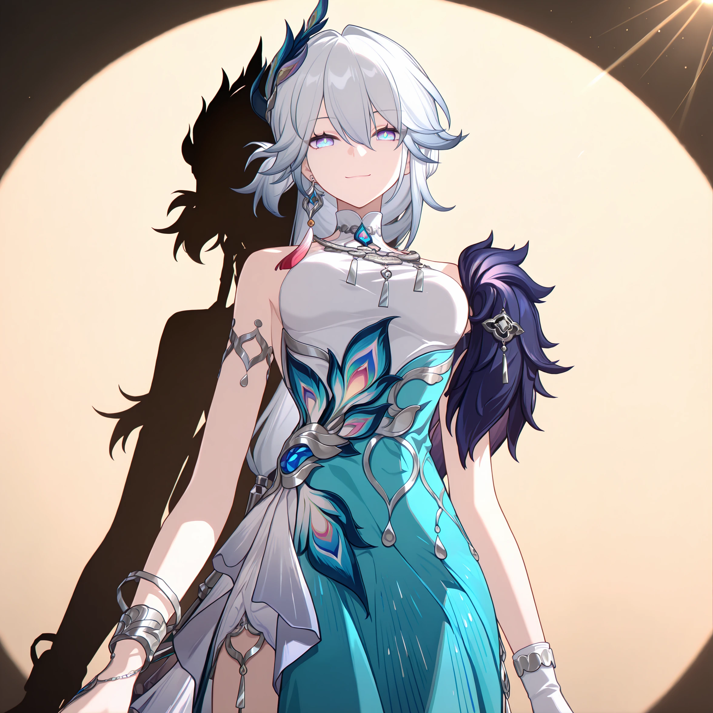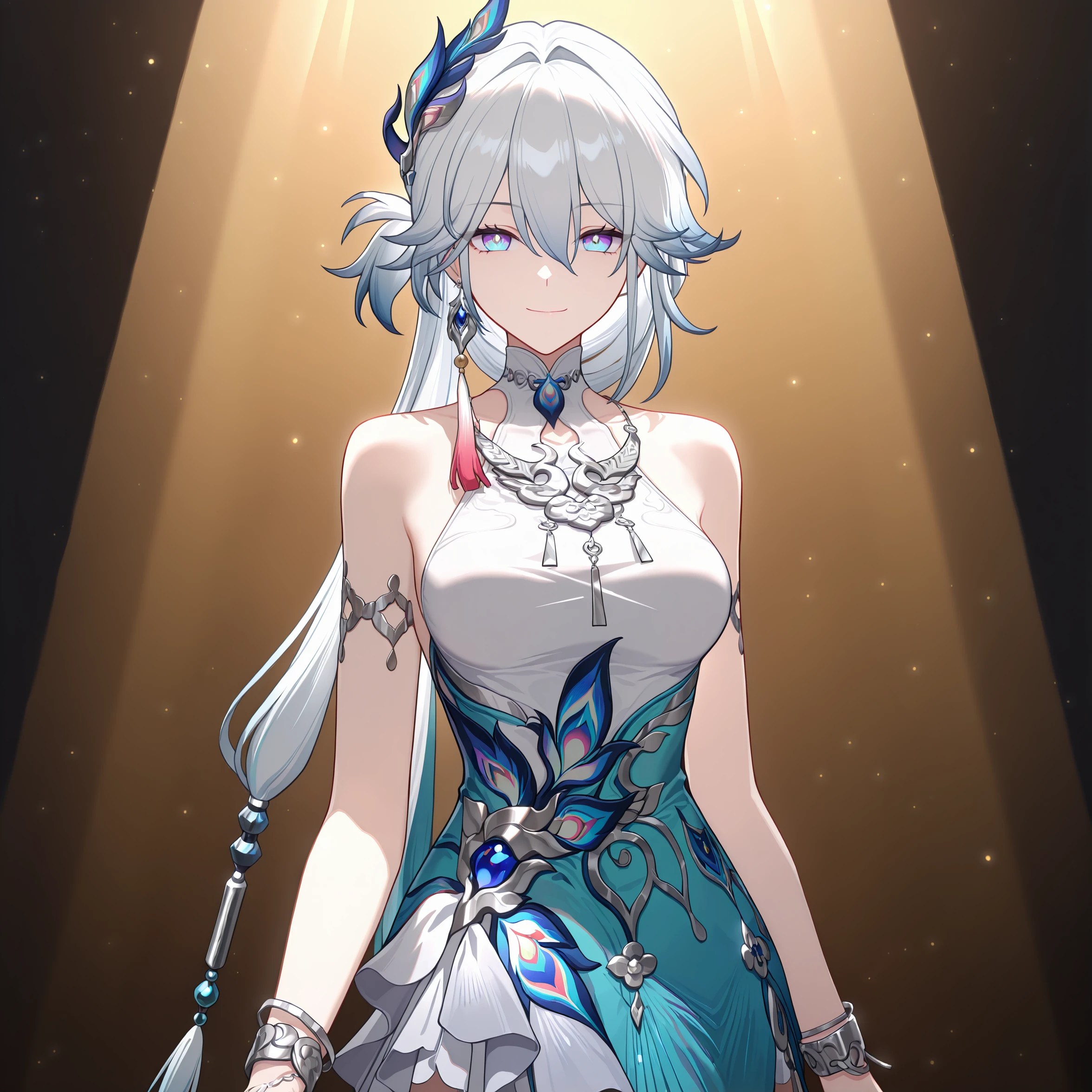 masterpiece, best quality, very aesthetic, newest, hires, Yaoguang, 1girl, solo, looking at viewer, hair ornament, bracelet, dress, high heels, smile, full body, detailed light, spotlight, simple background,For full-body shots, you can try adding full body or high heels.