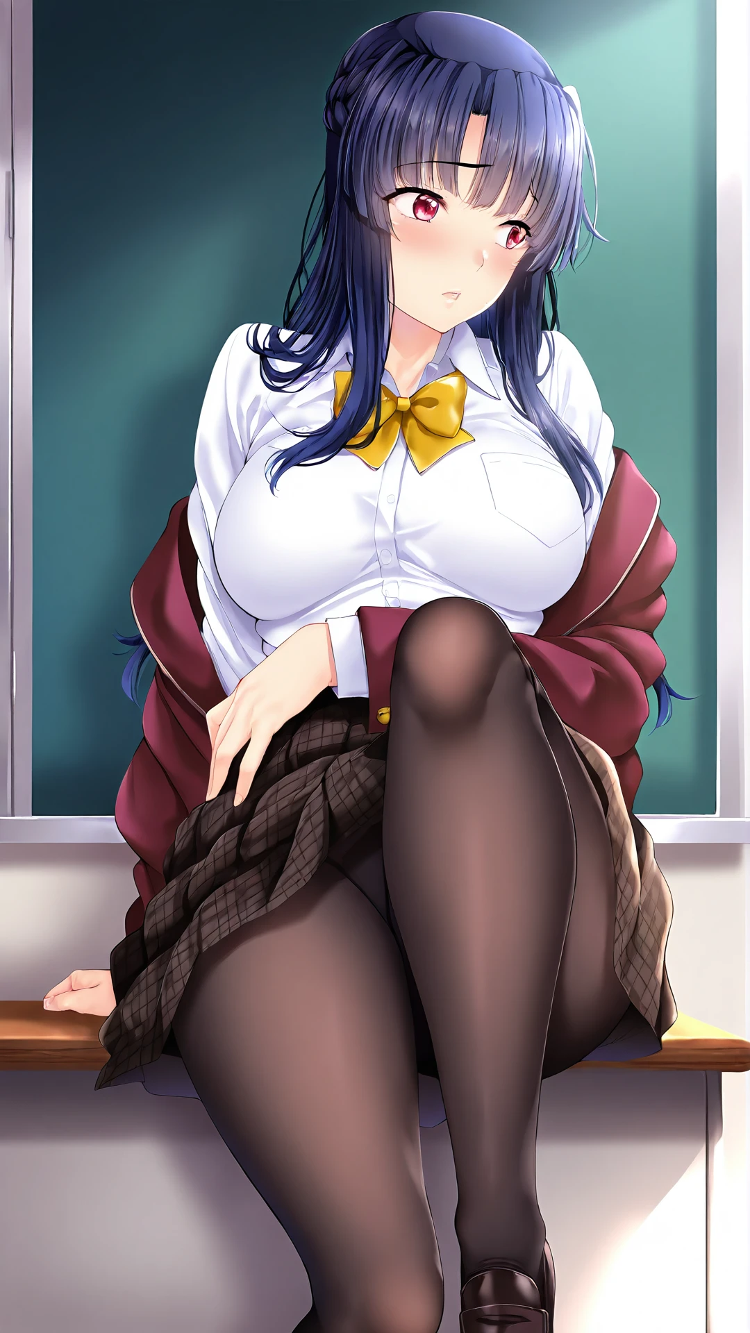 ,Kitajima Mizuki,1girl,solo,pantyhose,long hair,school uniform,skirt,red eyes,plaid skirt,plaid,blue hair,black pantyhose,black hair,